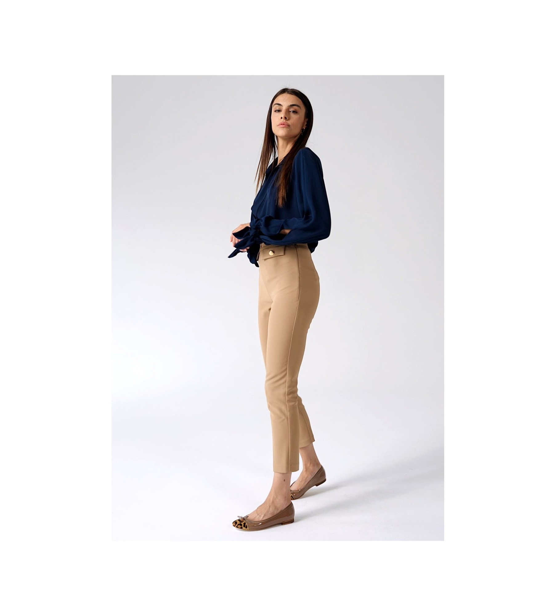 Zestaw beżowe baleriny z motywem zwierzęcym z ciemnymi, dopasowanymi spodniami w odcieniu czekoladowego brązu oraz miękkim, kaszmirowym swetrem w kolorze kremowym. Dodaj do tego długi płaszcz w kolorze camelowym oraz dużą torebkę w odcieniu ciepłego beżu. Ta stylizacja idealnie sprawdzi się na jesienne dni, łącząc subtelną elegancję z komfortem.
