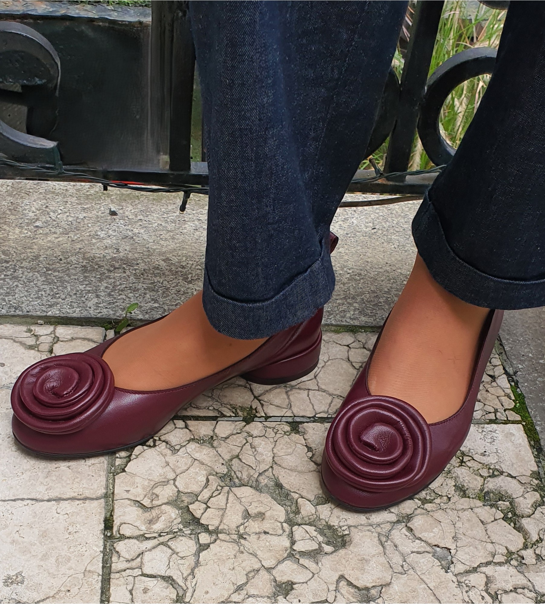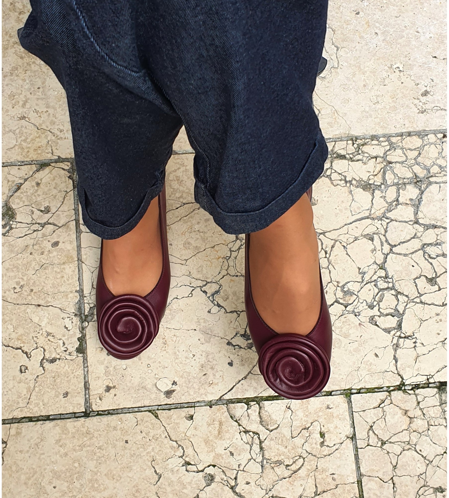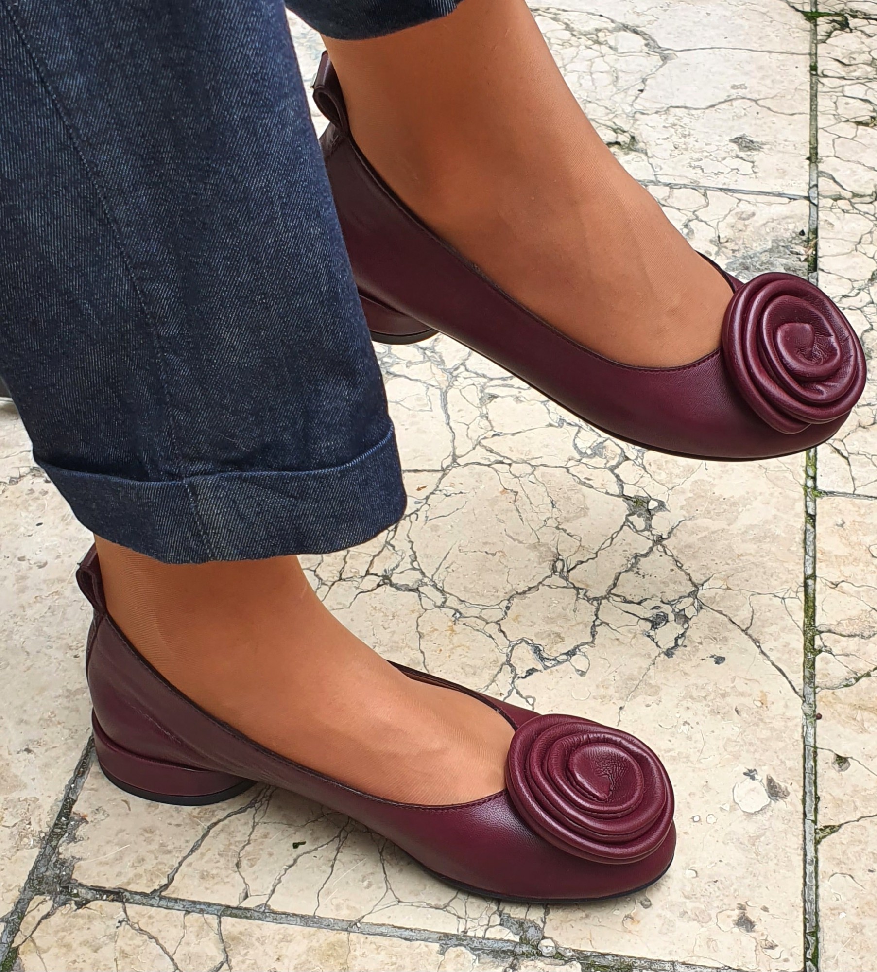 Wyjątkowe bordowe baleriny damskie wykonane z miękkiej, naturalnej skóryj to propozycja dla kobiet ceniących subtelną elegancję i komfort na co dzień. Wnętrze z delikatnej skóry jagnięcej zapewnia przyjemne otulenie stopy. Na nosku umieszczono dekoracyjny, skórzany kwiat – starannie uformowany z tego samego materiału – który dodaje butom niepowtarzalnego, artystycznego charakteru. Niski, stabilny obcas i klasyczny kształt sprawiają, że model ten doskonale komponuje się zarówno ze spodniami, jak i spódnicami, a jego głęboki, burgundowy odcień wnosi nutę wyrafinowanej kobiecości do każdej stylizacji.