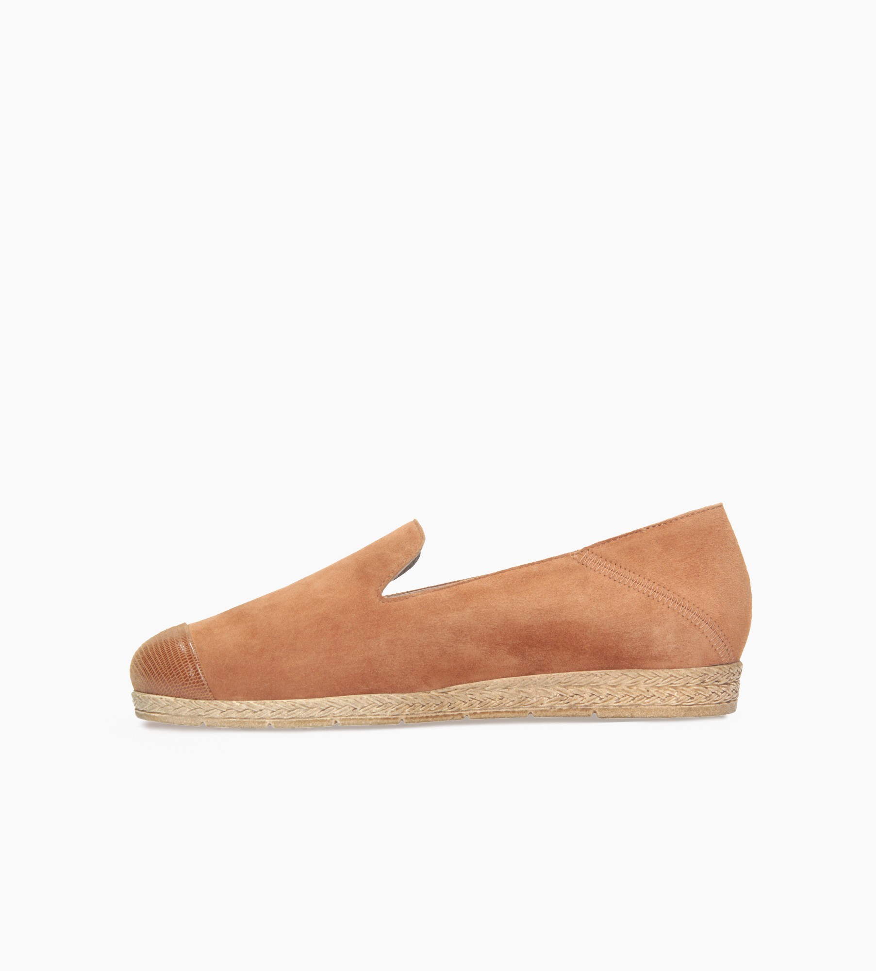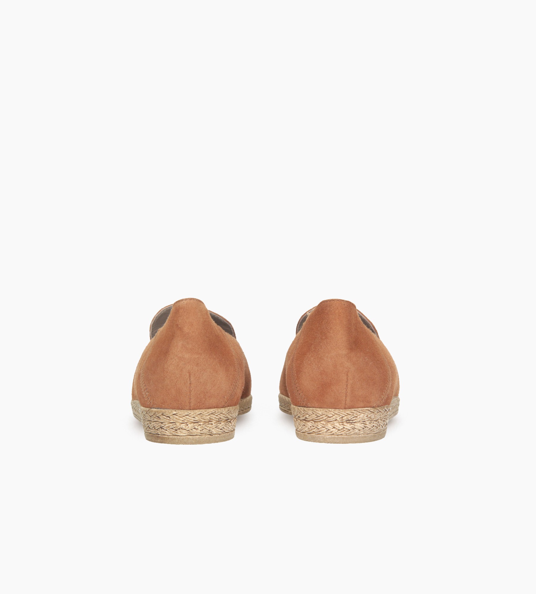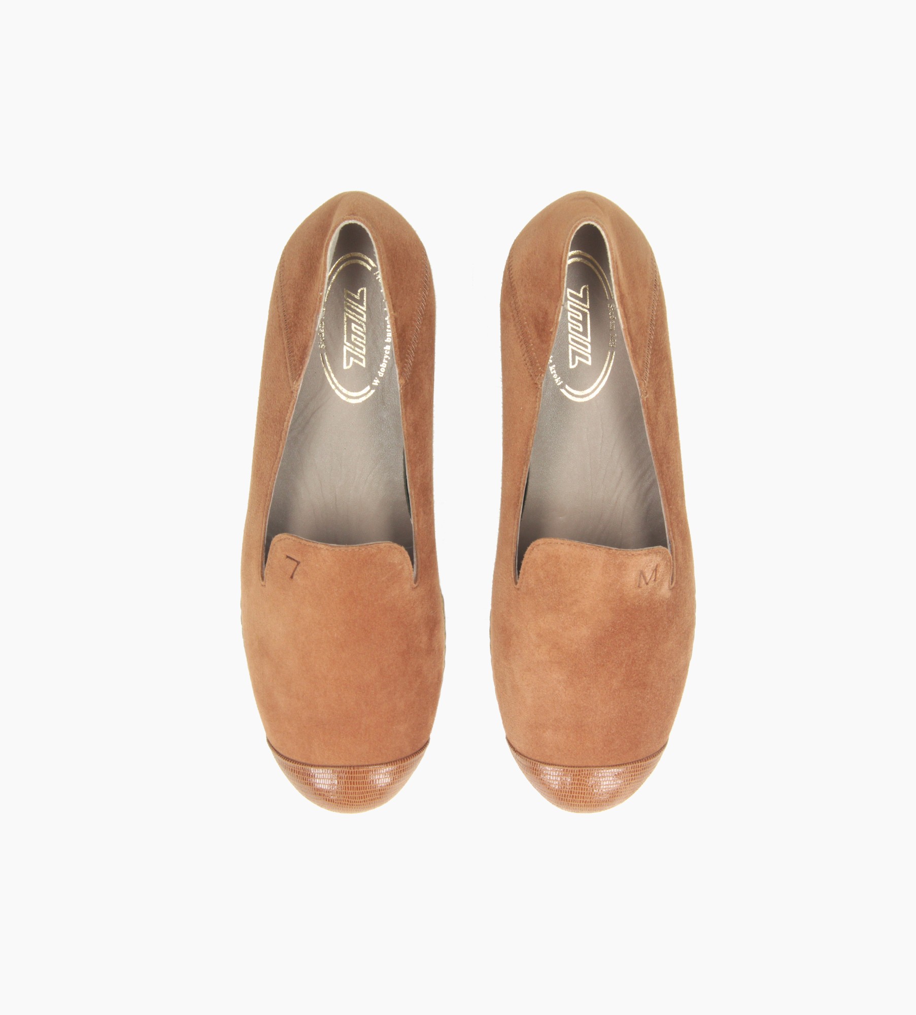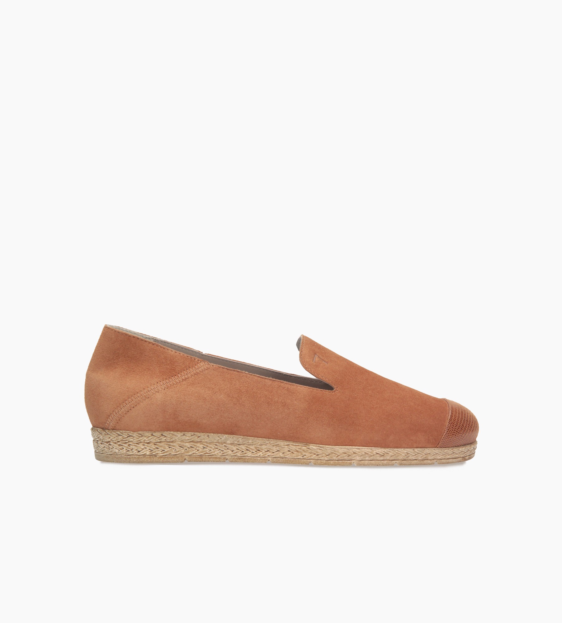 Stylowe i ponadczasowe mokasyny damskie wykonane z wysokiej jakości naturalnej skóry zamszowej. Ciepły odcień brązu nadaje im eleganckiego, a zarazem uniwersalnego charakteru, doskonale komponującego się z klasycznymi i casualowymi stylizacjami. Wnętrze mokasynów zostało wyściełane naturalną skórą jagnięcą, która zapewnia doskonałą oddychalność i maksymalny komfort noszenia, gwarantując uczucie lekkości przez cały dzień. Wyjątkowym elementem jest subtelnie teksturowany nosek, który nie tylko dodaje estetycznej finezji, ale również wzmacnia przednią część buta, zwiększając jego trwałość. Model osadzony jest na plecionej podeszwie, inspirowanej klasycznym stylem espadryli, co nadaje mu naturalny i lekki wygląd, jednocześnie zapewniając stabilność i wygodę podczas codziennego użytkowania.