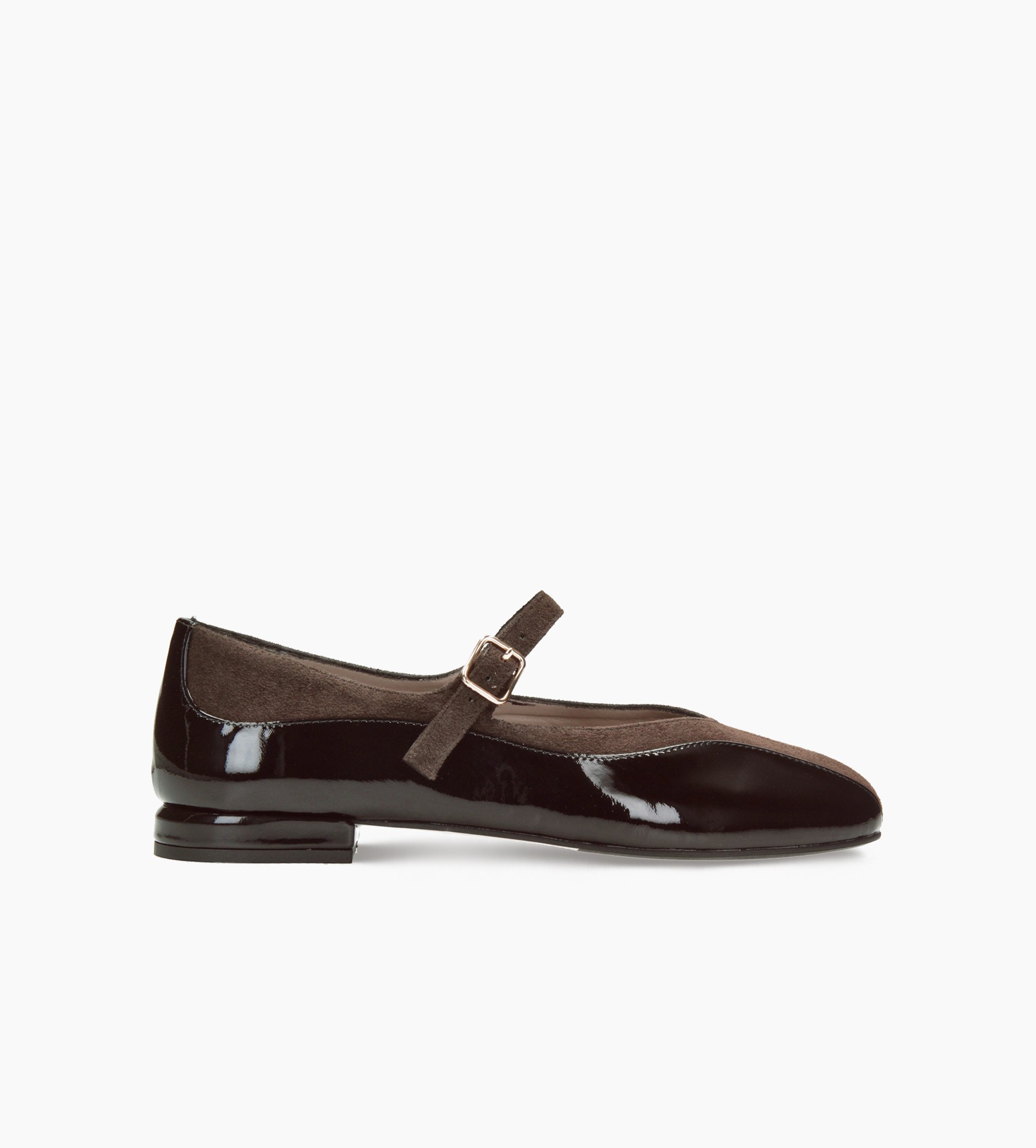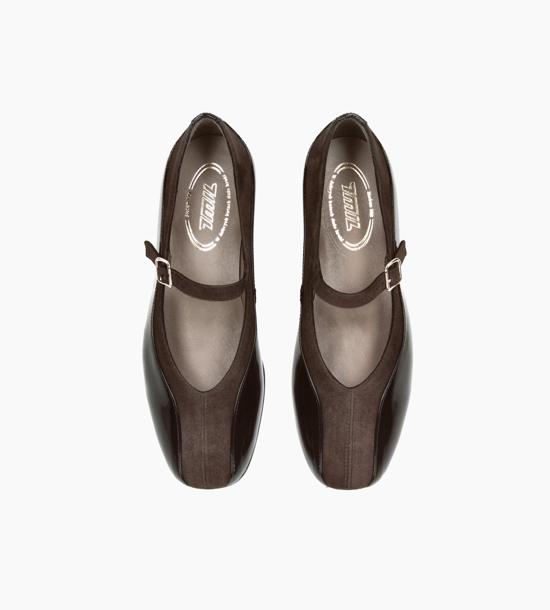 Brązowe baleriny damskie wykonane z połączenia eleganckiej skóry lakierowanej oraz miękkiego zamszu prezentują się niezwykle stylowo i kobieco. Klasyczna sylwetka buta została wzbogacona o subtelny, ozdobny pasek zapinany na delikatną, złotą klamerkę, który dodaje uroku i retro charakteru. Niski, stabilny obcas zapewnia komfort noszenia na co dzień, a miękka, jagnięca wyściółka dba o wygodę nawet przy dłuższym użytkowaniu. Połączenie różnych faktur skóry w ciepłym odcieniu czekolady sprawia, że baleriny są doskonałym wyborem zarówno do biurowych stylizacji, jak i na eleganckie wyjścia.