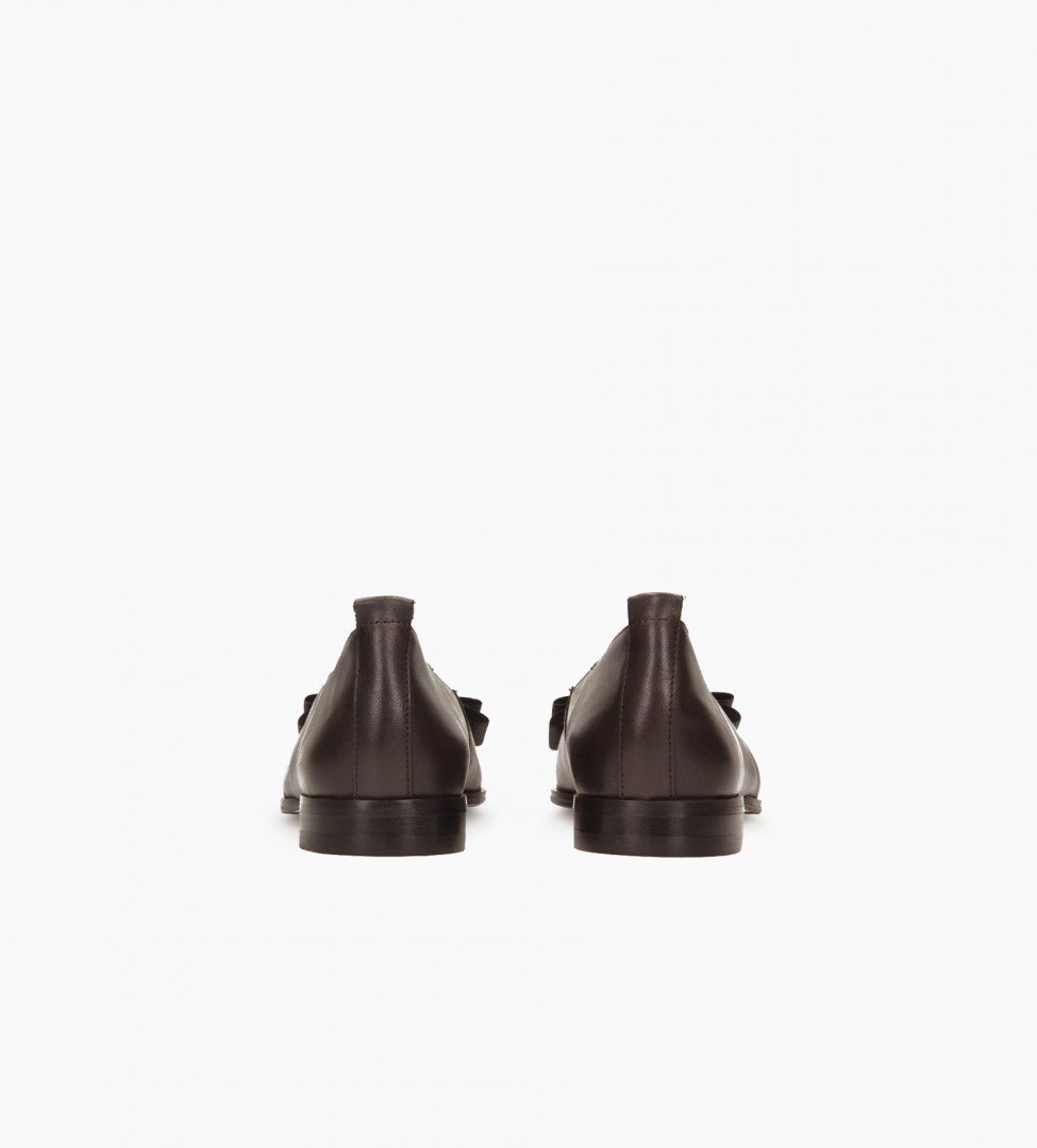 Brązowe baleriny damskie wykonane z wysokogatunkowej skóry cielęcej zachwycają ponadczasową elegancją i subtelnym urokiem. Ich klasyczna sylwetka została wzbogacona o dużą, efektowną kokardę z materiału w dopasowanym odcieniu brązu, która dodaje całości kobiecego akcentu. Model ten wyróżnia się perfekcyjnym wyprofilowaniem, dzięki czemu zapewnia wyjątkowy komfort nawet podczas całodziennego noszenia. Delikatnie zaokrąglony nosek, miękka skórzana wyściółka oraz niski, stabilny obcas sprawiają, że to idealne obuwie zarówno do pracy, jak i na co dzień.