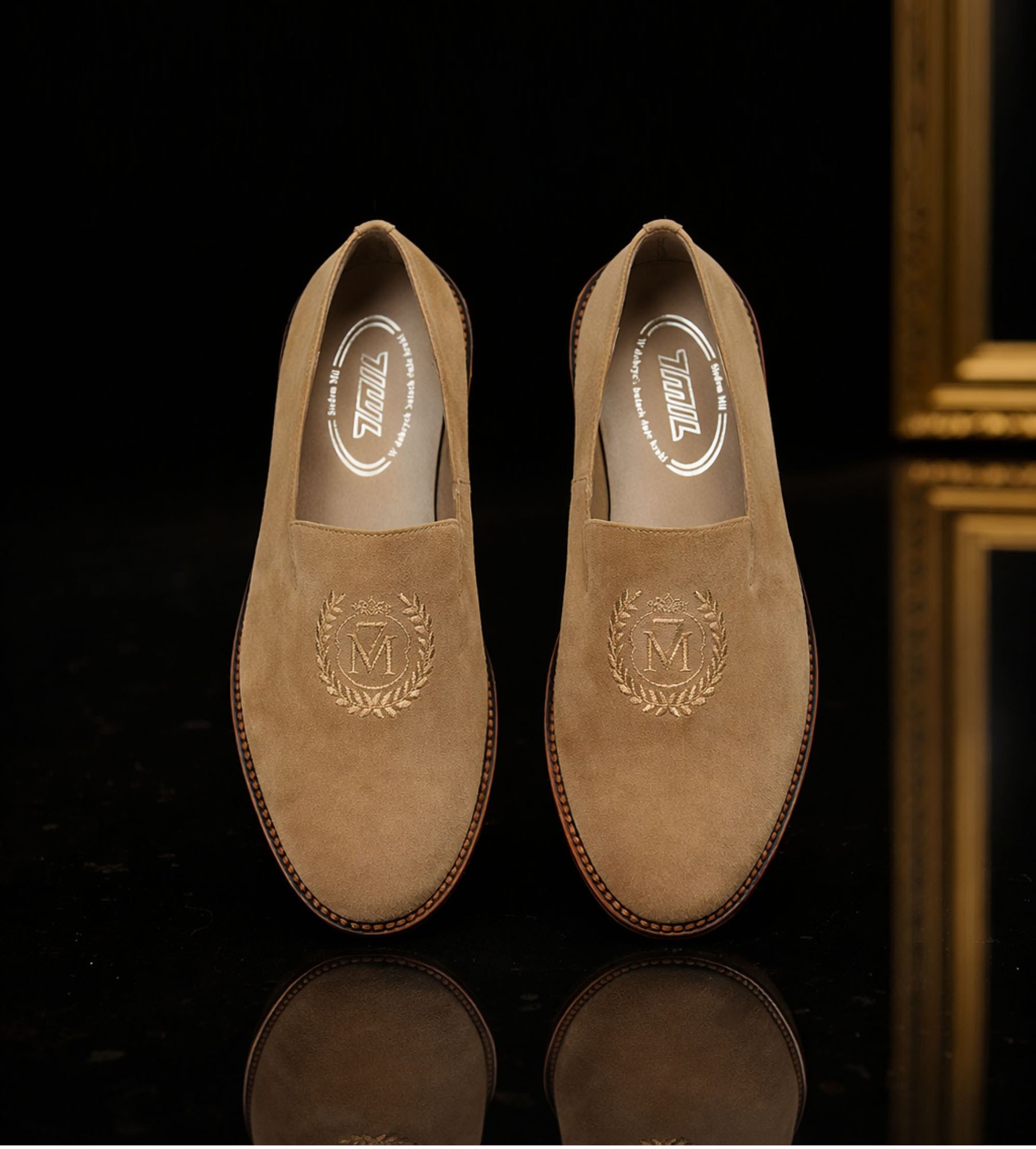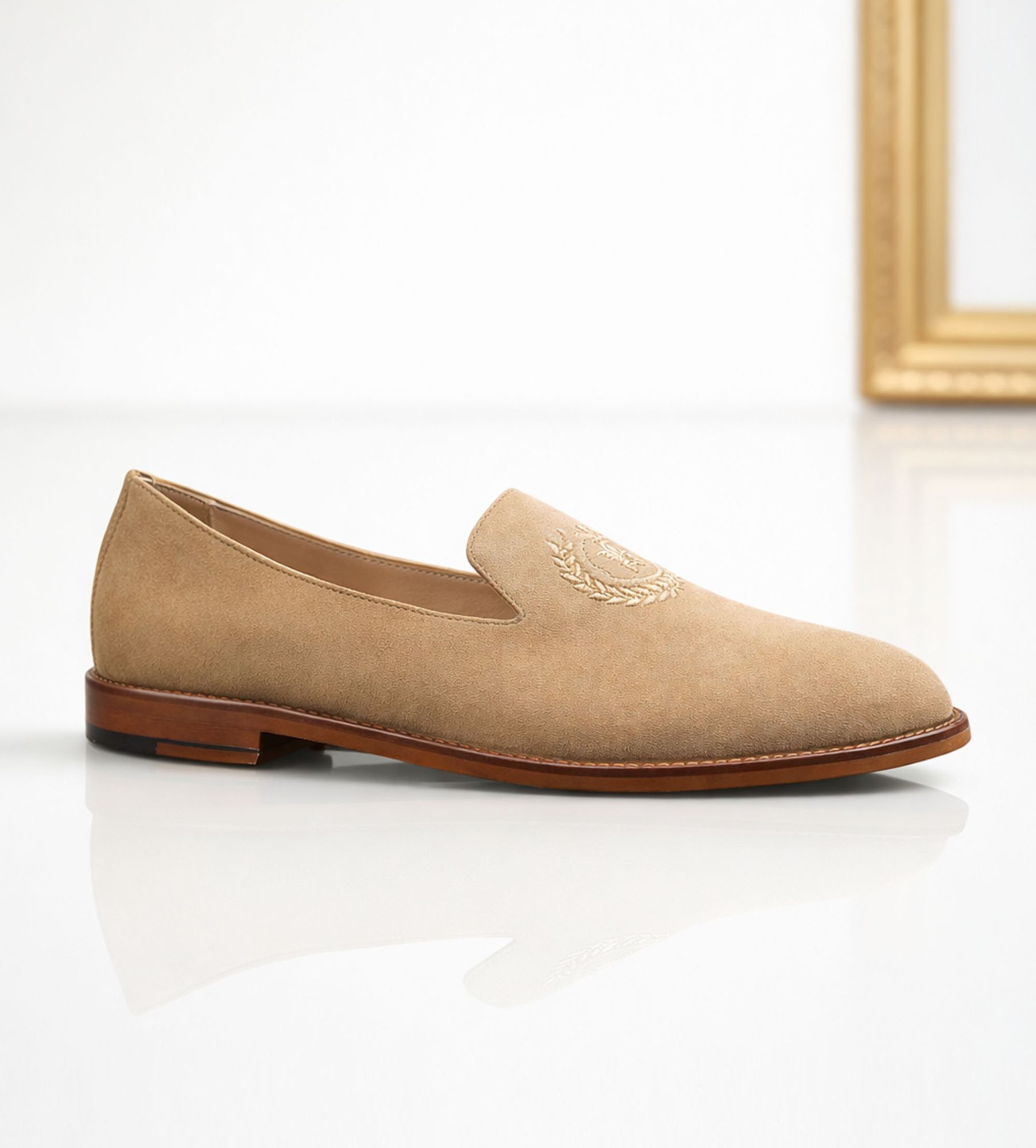 Eleganckie baleriny damskie w odcieniu ciepłego beżu to klasyczna propozycja w stylu loafersów, idealna dla kobiet ceniących szyk i komfort. Wykonane z wysokiej jakości zamszowej skóry naturalnej, wyróżniają się starannym wykończeniem i miękkim wnętrzem z luksusowej skóry jagnięcej. Delikatny haft w formie monogramu marki na przodzie cholewki nadaje całości subtelnego, arystokratycznego sznytu. Zabudowana forma pięknie trzyma stopę i zapewnia wygodę przez cały dzień.