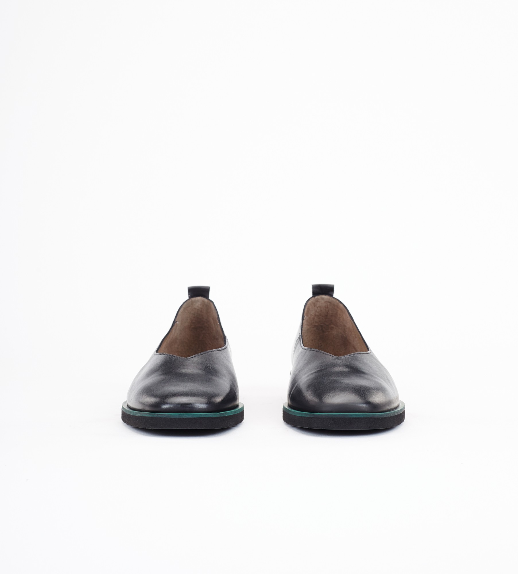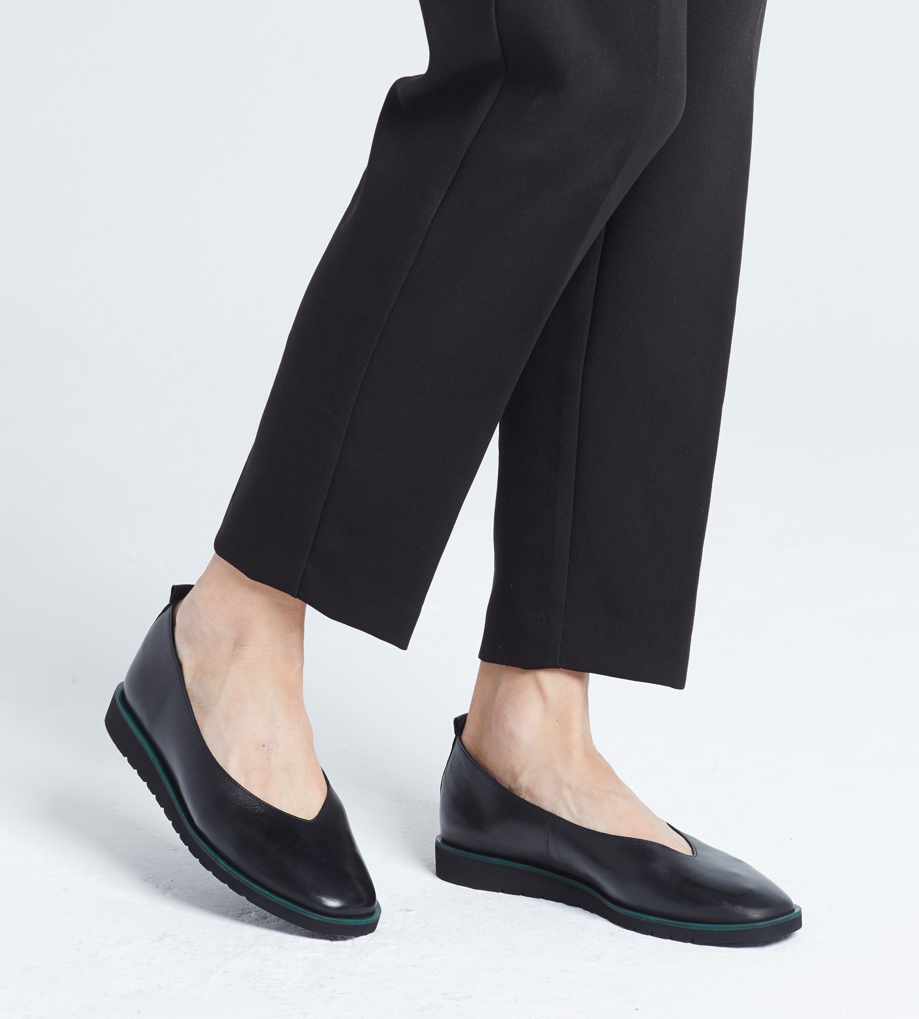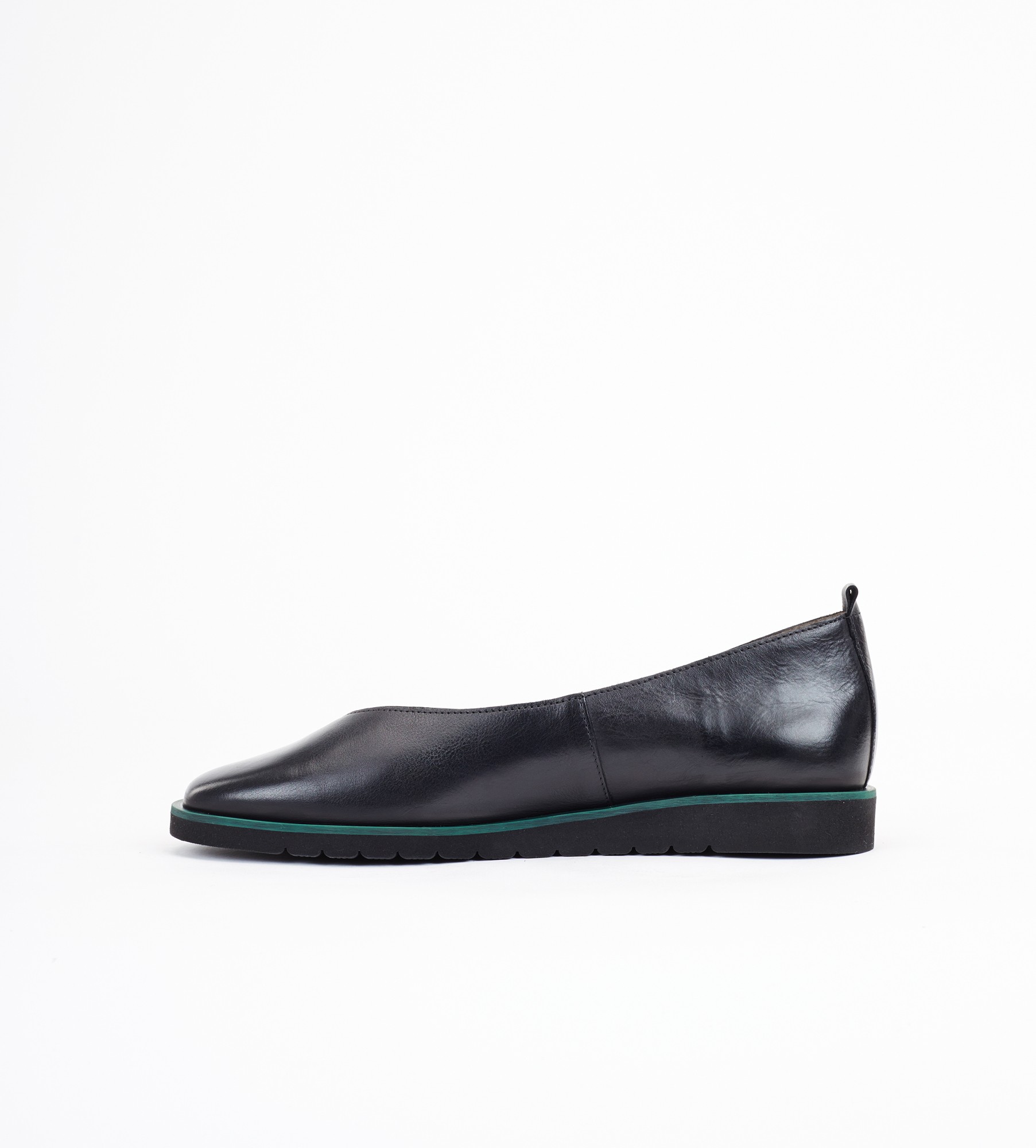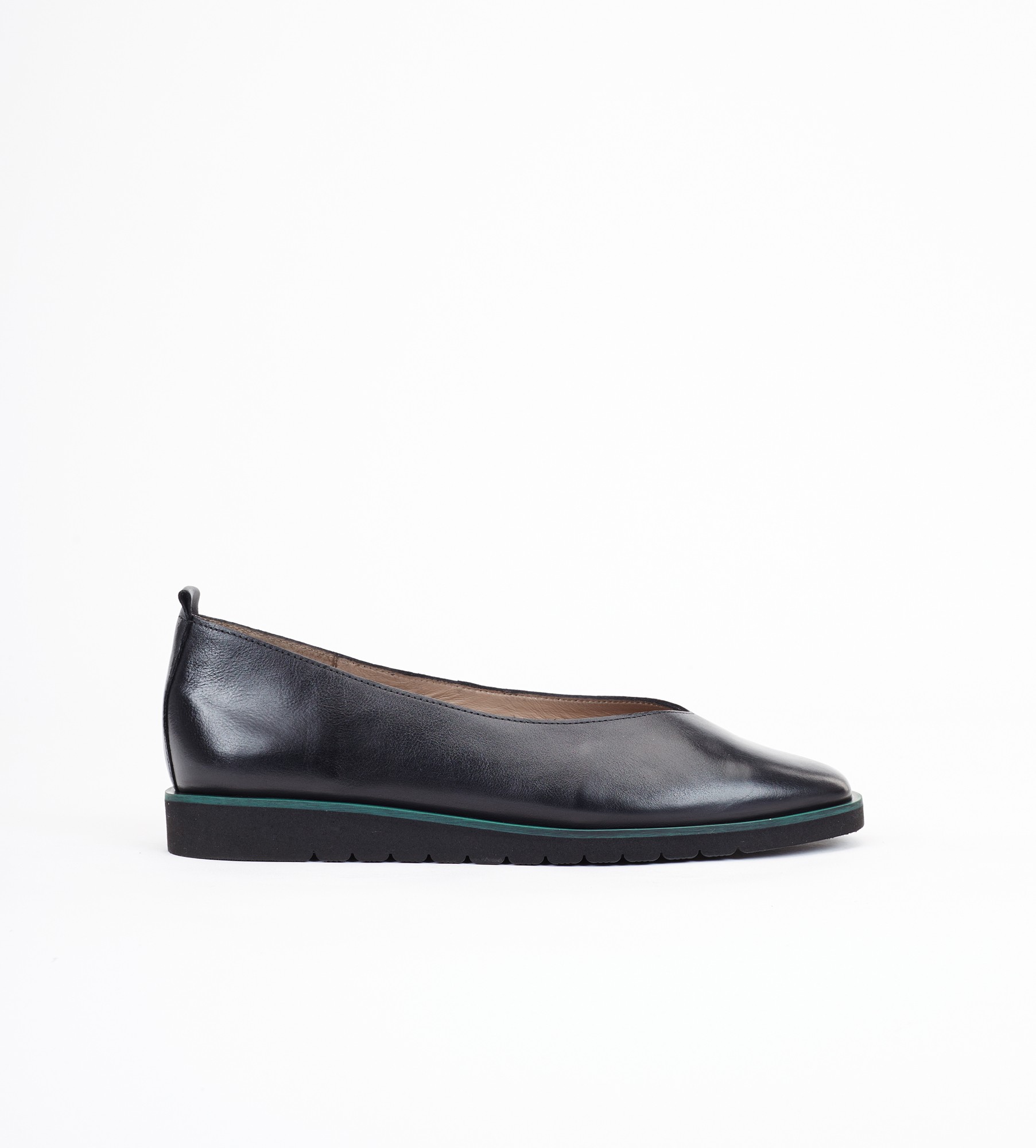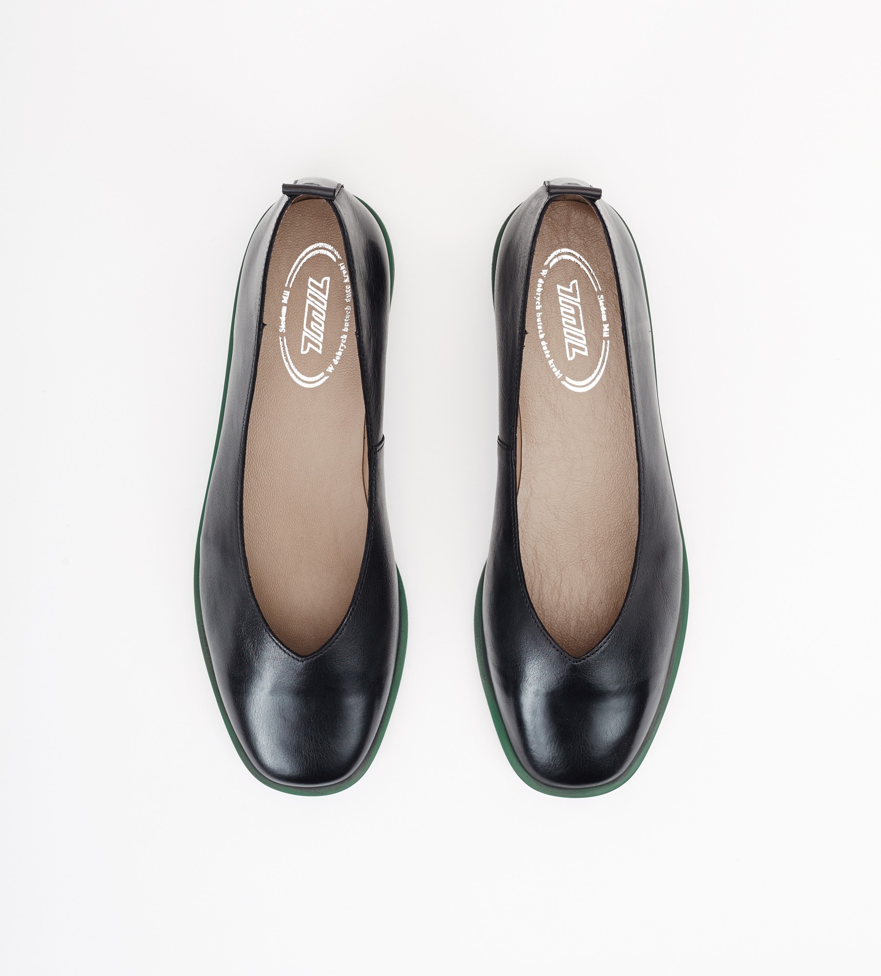 Czarne baleriny klasyczne i wygodne obuwie wykonane z naturalnej skóry cielęcej. Charakteryzują się ryflowaną, lekką podeszwą oraz zielonym otokiem, co dodaje im wyjątkowego stylu. Wnętrze i wkładka z miękkiej skóry jagnięcej zapewniają komfort noszenia i idealny mikroklimat dla stóp. Baleriny mają niski obcas o wysokości 2 cm , co sprawia, że są idealne na różne okazje, łącząc elegancję z wygodą.