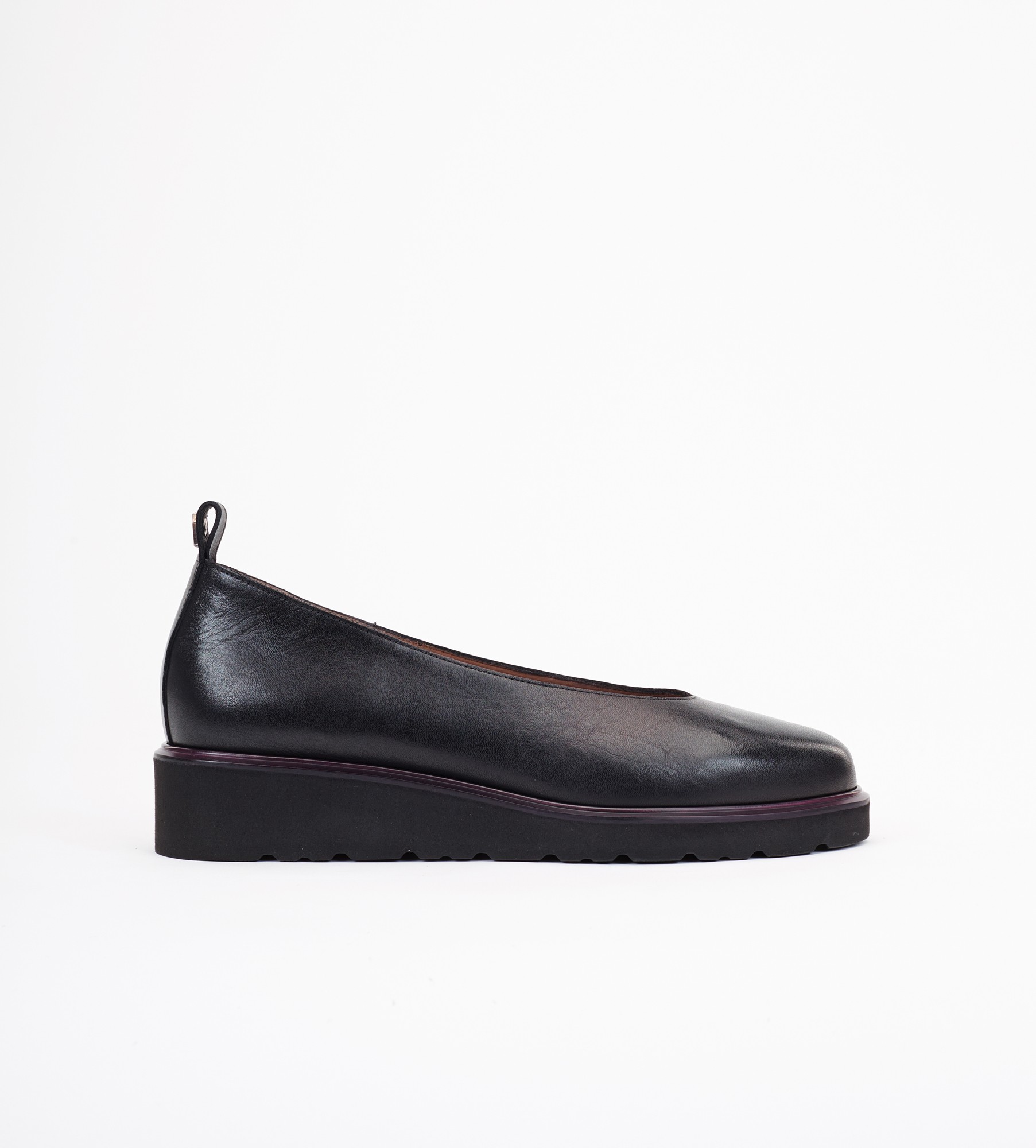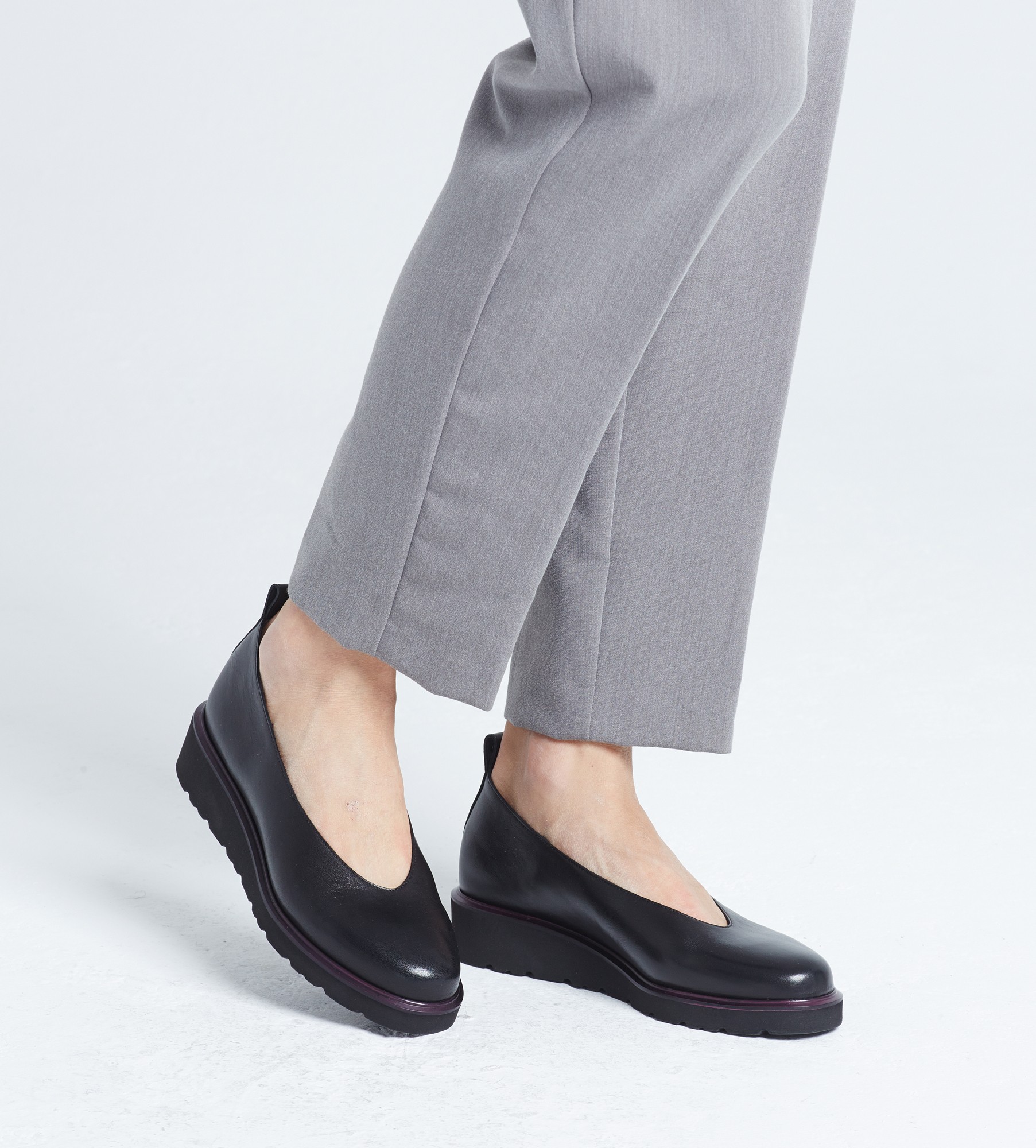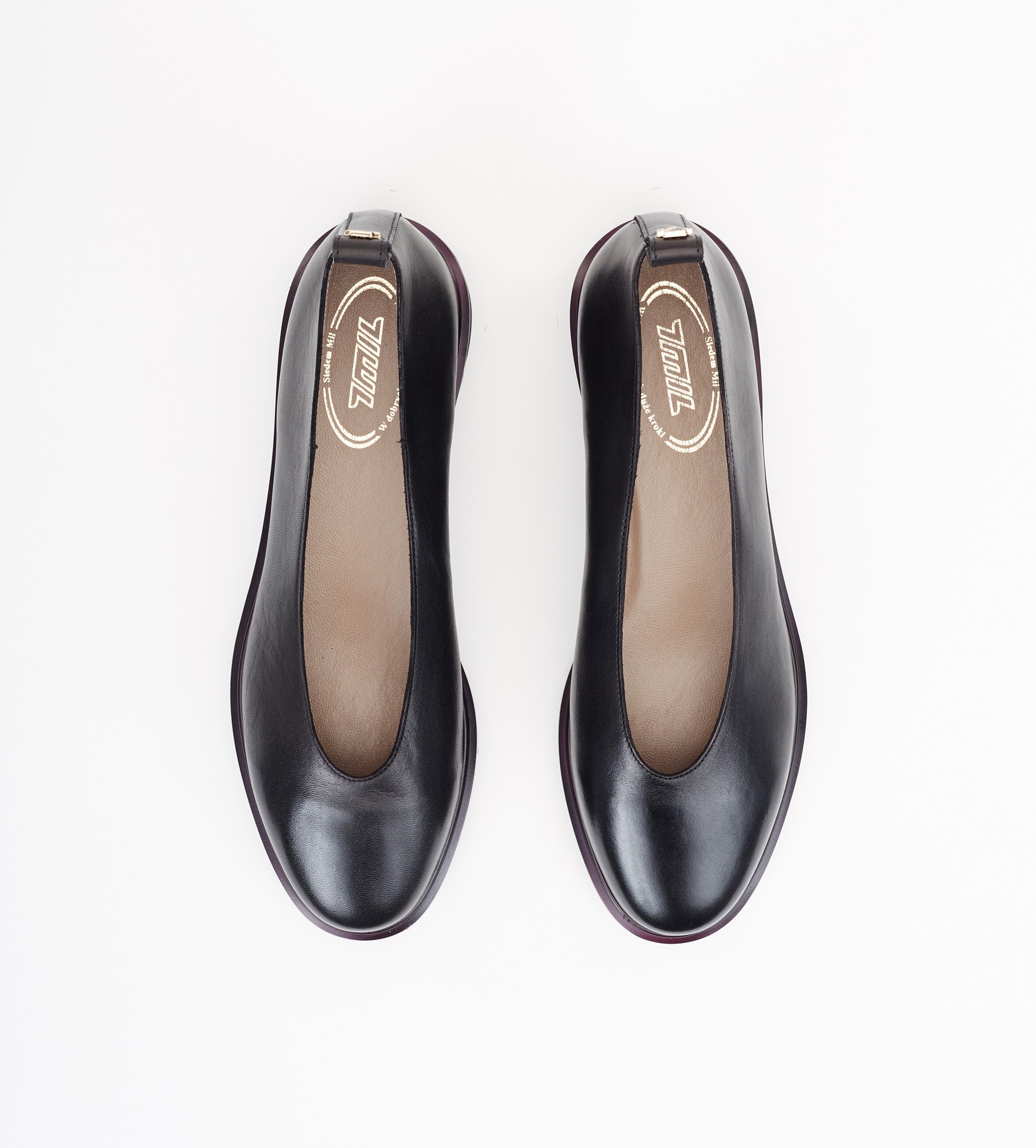 Czarne baleriny wykonane z wysokiej jakości naturalnej skóry cielęcej to połączenie klasycznego stylu i nowoczesnych rozwiązań, które z pewnością przypadnie do gustu kobietom ceniącym zarówno styl, jak i wygodę. Czarny kolor nadaje im ponadczasowy charakter, który doskonale komponuje się z różnorodnymi stylizacjami. Efektowne wycięcie na przodzie buta nadaje im subtelności i kobiecości, fioletowy otok zaś charakteru. Baleriny posiadają bardzo wygodną podeszwę 3,5 cm, która zapewnia stabilność i wygodę podczas chodzenia. Dzięki temu są idealnym wyborem zarówno na co dzień, jak i na specjalne okazje.