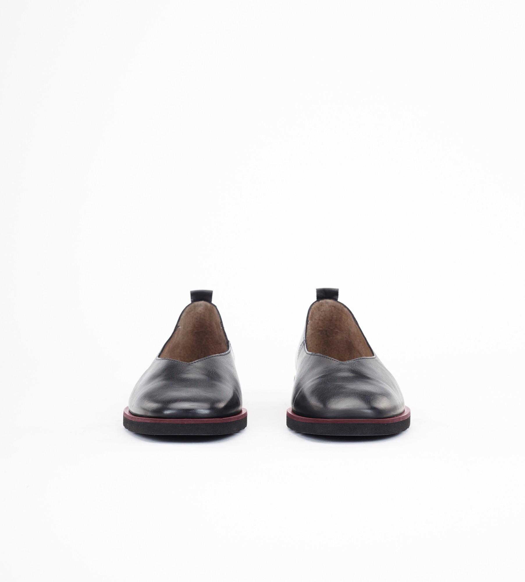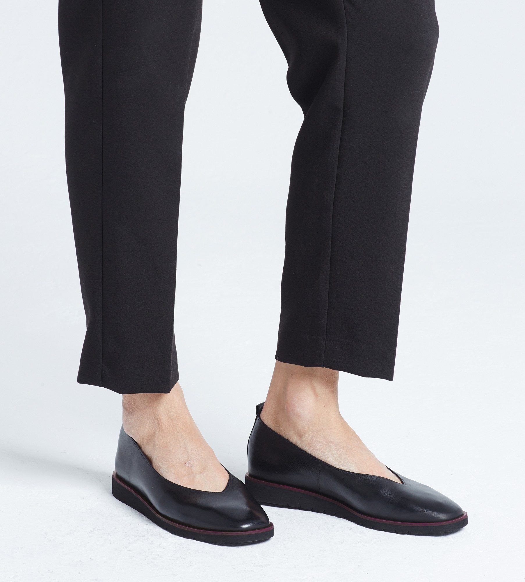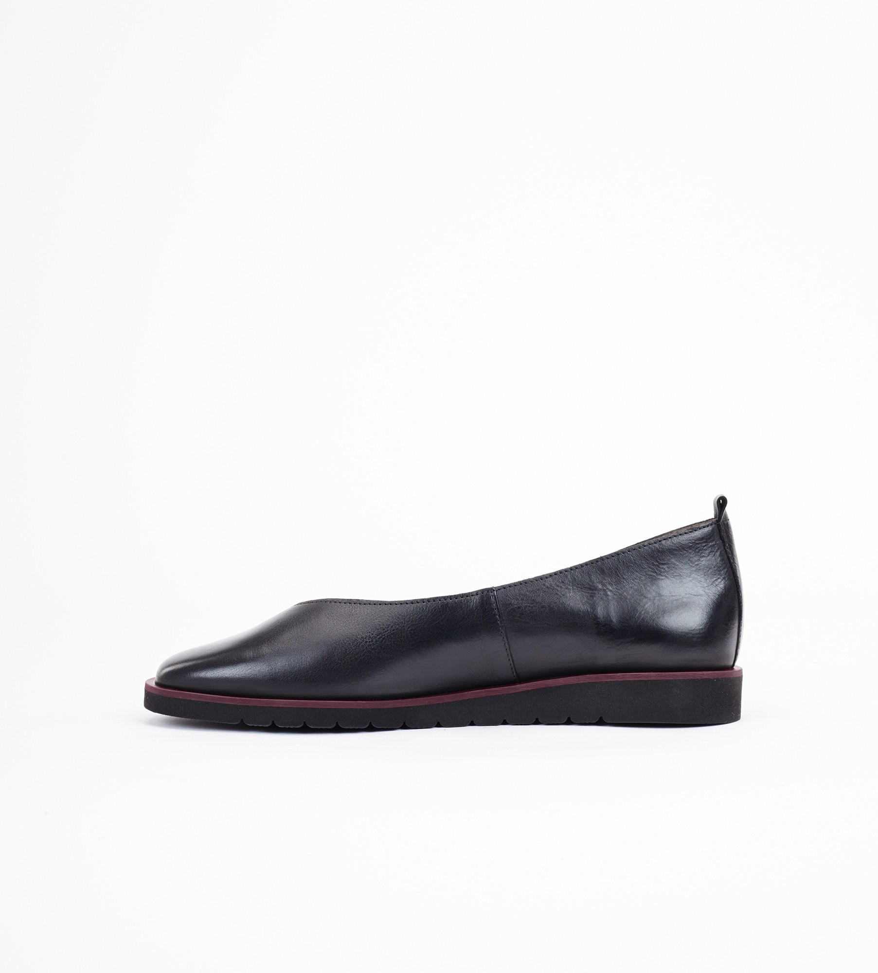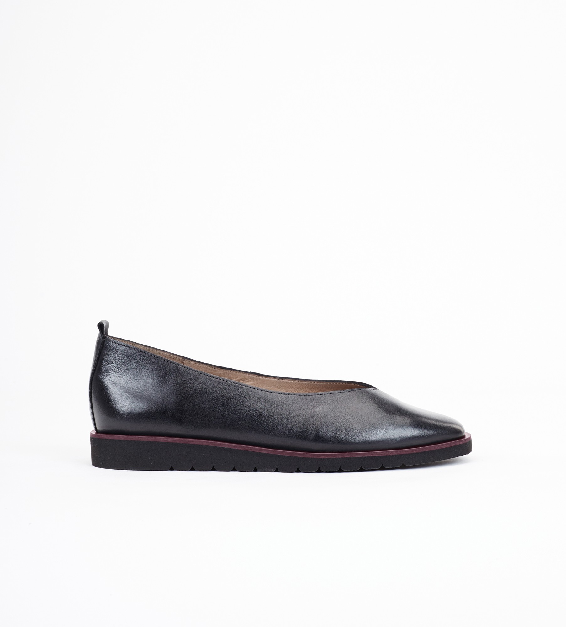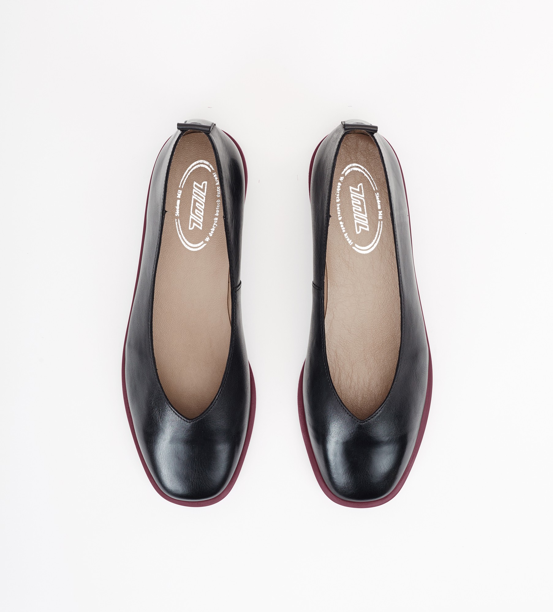 Czarne baleriny damskie to klasyczne kobiece obuwie wykonane z naturalnej skóry cielęcej. Posiadają ryflowaną, lekką podeszwę oraz fioletowy otok, dodający im subtelnego uroku. Wnętrze i wkładka wykonane są z miękkiej skóry jagnięcej, co zapewnia komfort noszenia i idealny mikroklimat dla stóp. Te baleriny mają niski obcas o wysokości 2 cm, łącząc wygodę z modnym wyglądem, idealne do codziennych stylizacji.