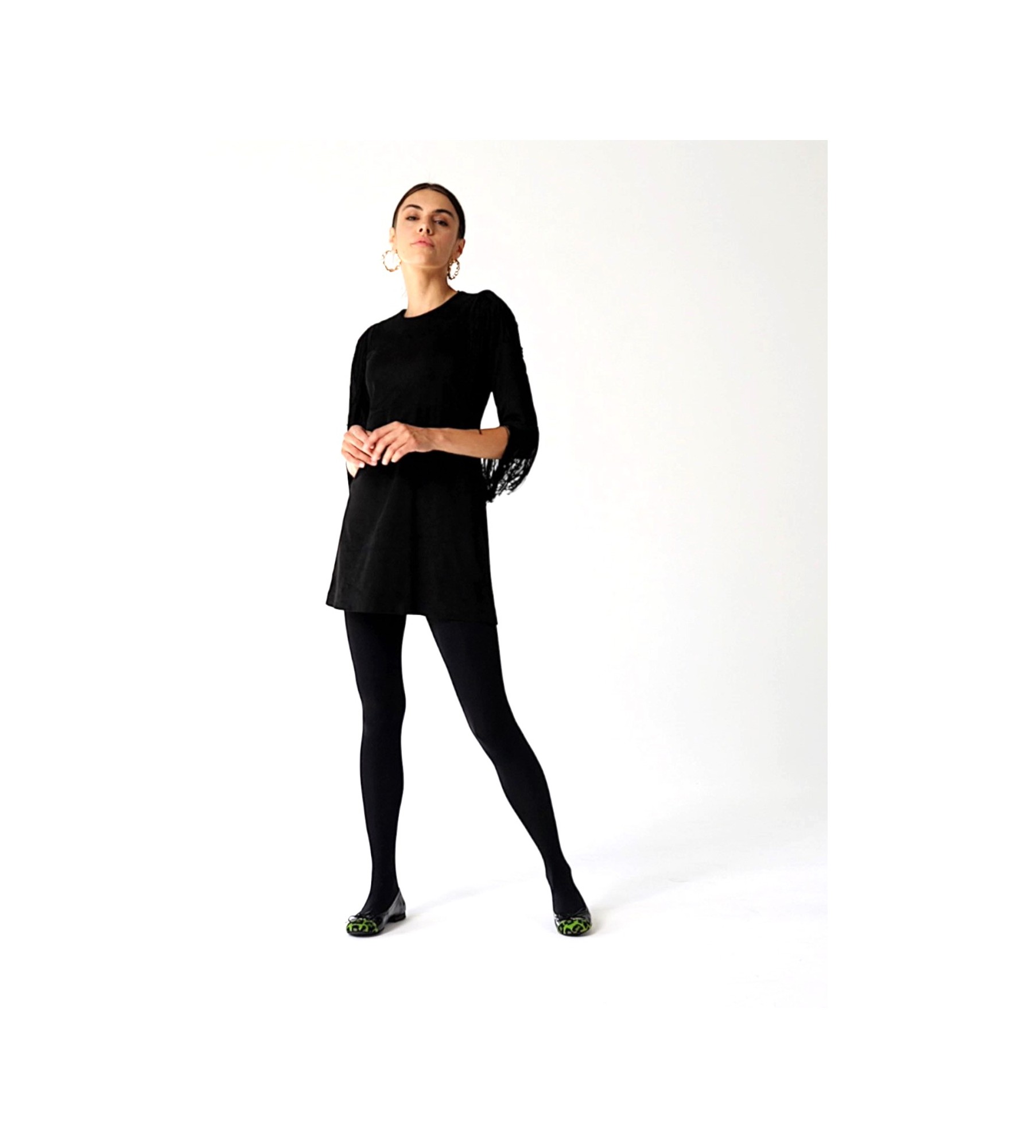 Zestaw czarne baleriny z motywem zwierzęcym z wąskimi czarnymi spodniami i oversize'owym swetrem w odcieniu ciepłego karmelu. Dodaj długi płaszcz w kolorze oliwkowym oraz dużą torebkę typu shopper. Całość uzupełnij szalem w jesiennych odcieniach, aby podkreślić stylowy, a jednocześnie wygodny look na chłodniejsze dni.