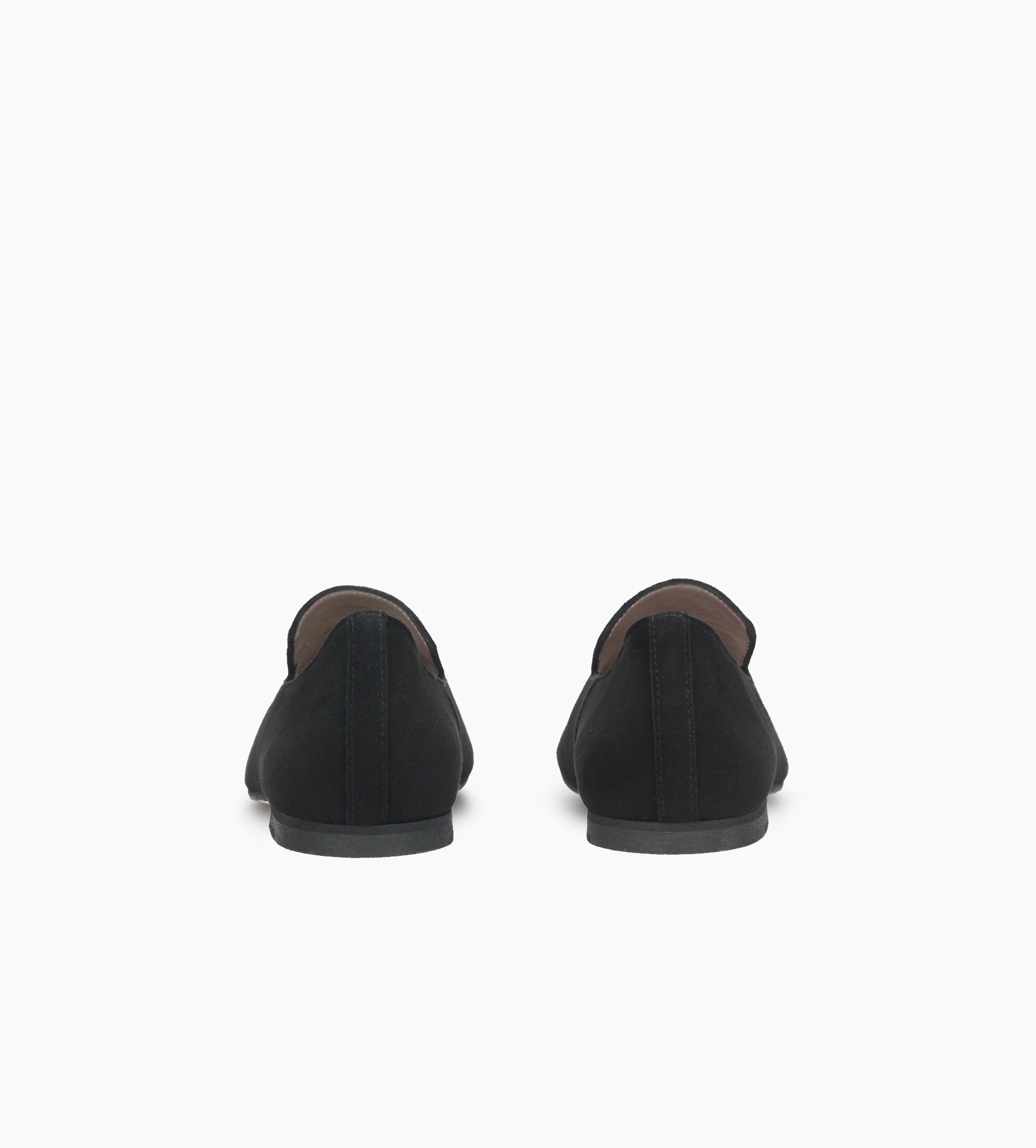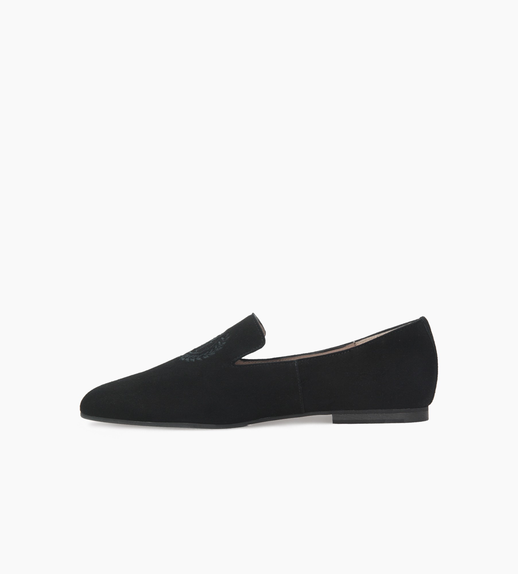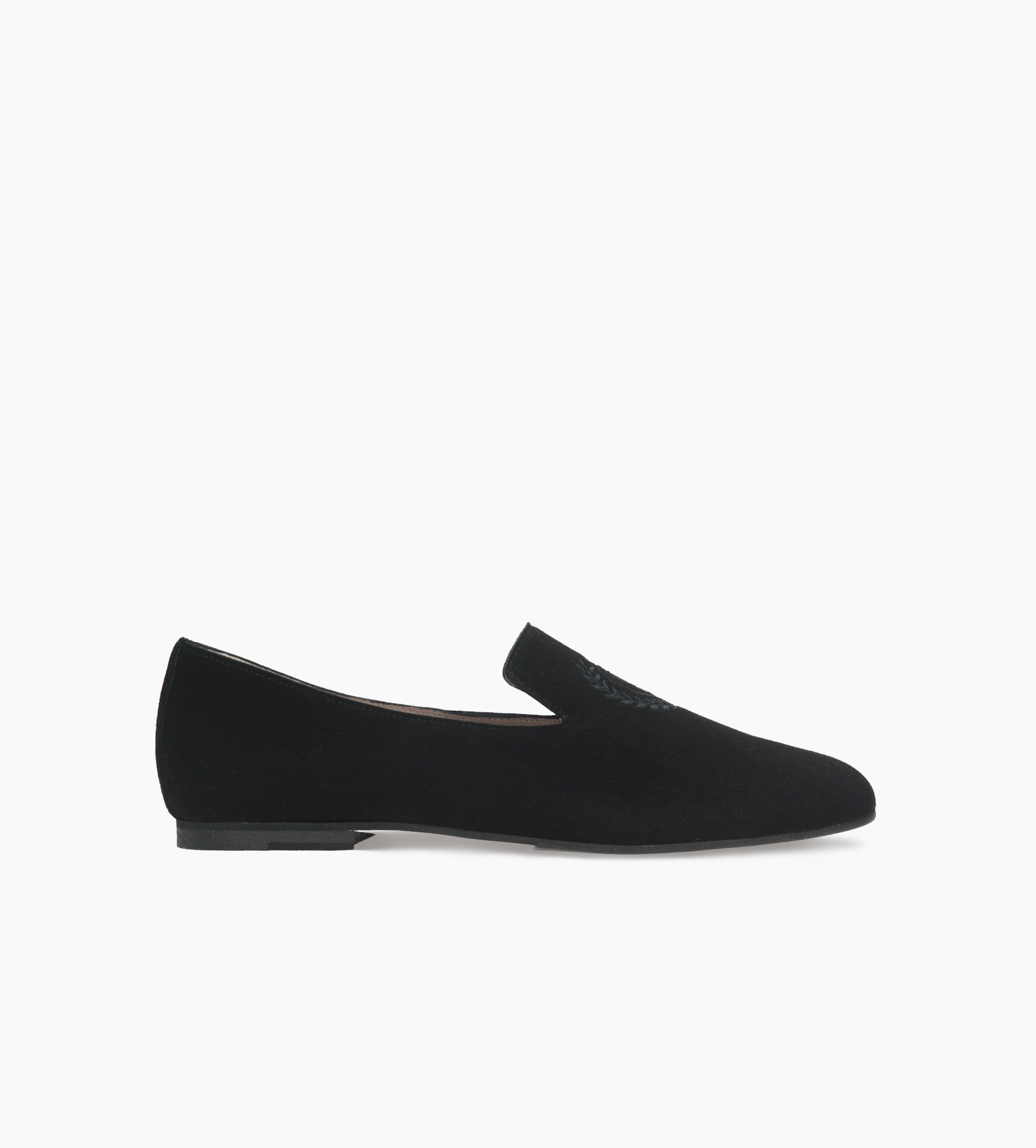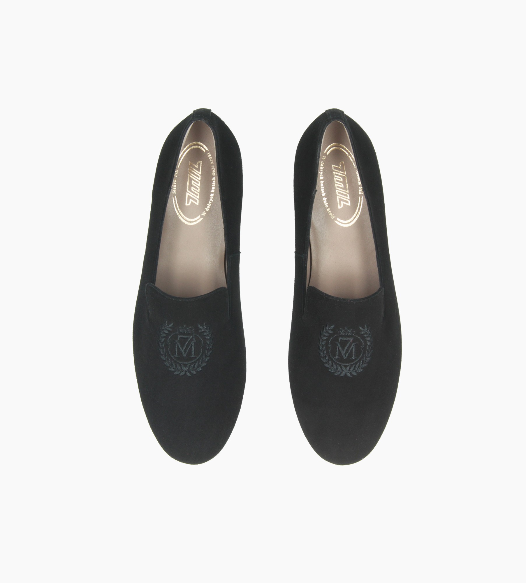 Czarne baleriny damskie wykonane z naturalnej skóry zamszowej, zachwycają miękkością i subtelnym, matowym wykończeniem. Wnętrze buta wyściełane zostało delikatną skórą jagnięcą, która doskonale dopasowuje się do stopy, zapewniając komfort noszenia przez cały dzień. Na przodzie cholewki umieszczono haftowany monogram marki w eleganckim, wieńcowym zdobieniu, który dodaje butom ekskluzywnego charakteru i podkreśla ich wygląd.