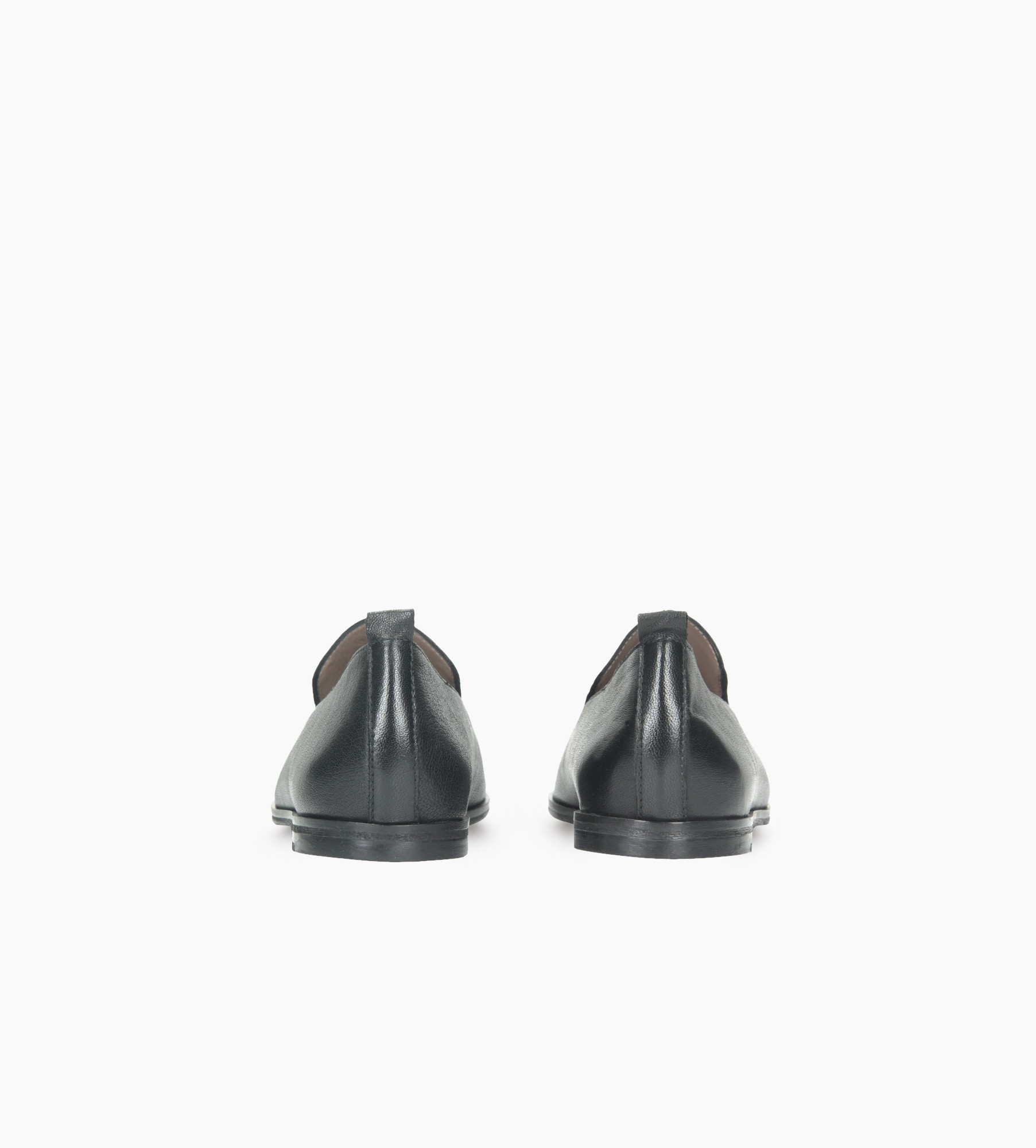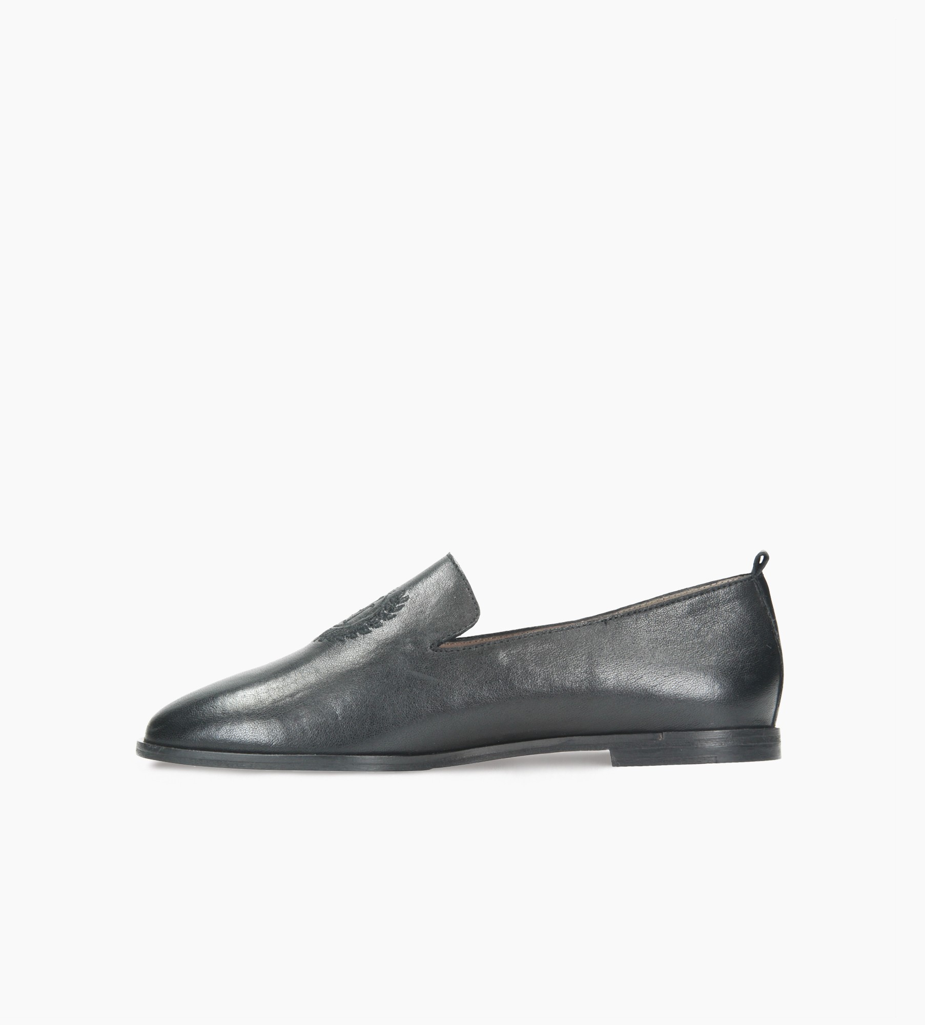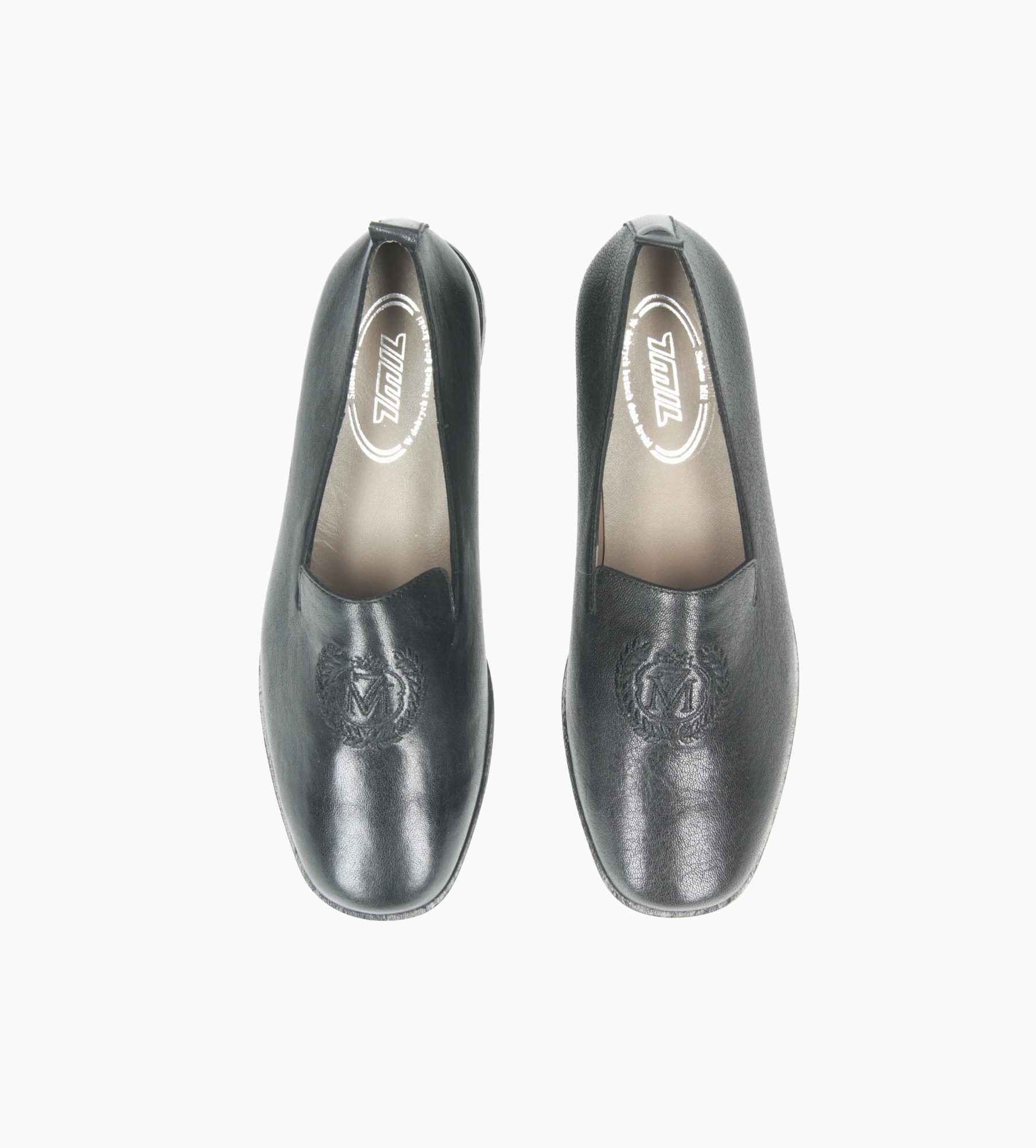 Eleganckie czarne baleriny damskie, które harmonijnie łączą klasyczny styl z nowoczesnymi detalami. Wykonane z najwyższej jakości naturalnej skóry, gwarantują trwałość oraz komfort użytkowania. Wnętrze buta wyściełane jest miękką skórą jagnięcą, co zapewnia wyjątkową wygodę nawet podczas długotrwałego noszenia.​ Cholewka balerin ozdobiona jest subtelnym, wyszywanym monogramem marki, dodającym butom unikalnego charakteru i podkreślającym ich ekskluzywny design. Klasyczny fason z zaokrąglonym noskiem sprawia, że model ten jest uniwersalny i ponadczasowy.