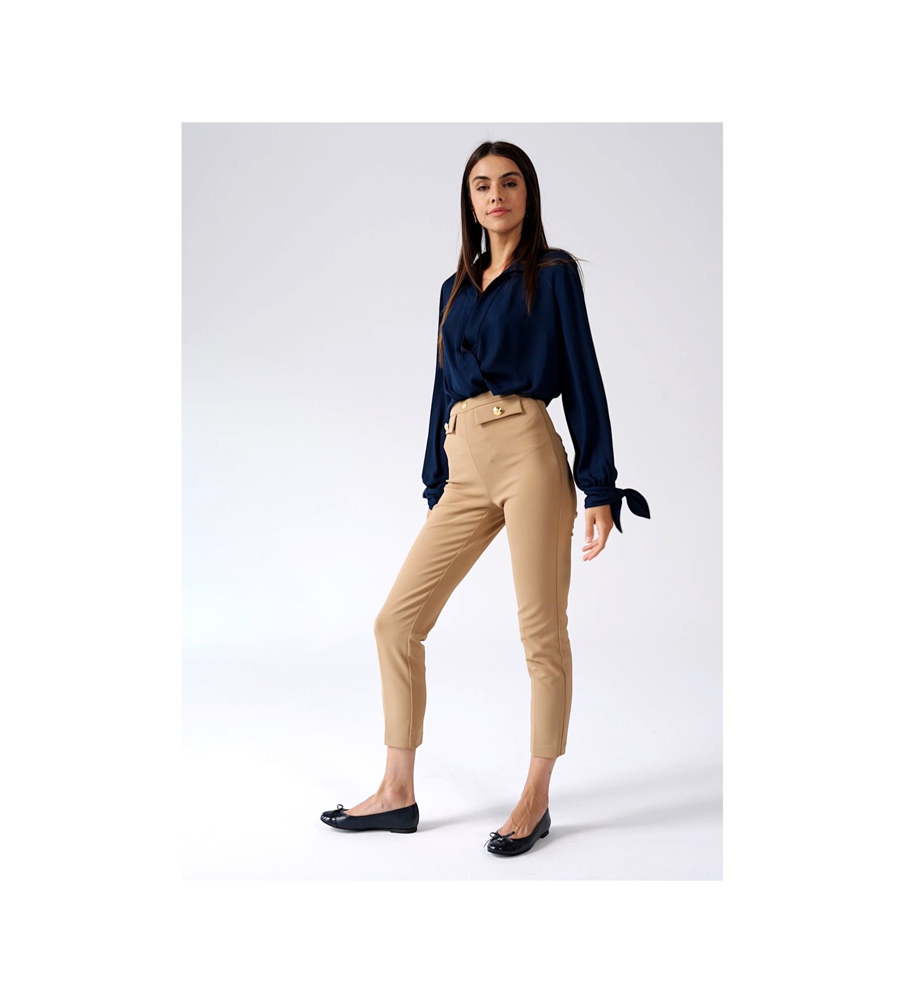 Połącz granatowe baleriny z dopasowanymi, bordowymi spodniami oraz kremowym, kaszmirowym swetrem. Dodaj długi, beżowy płaszcz oraz szalik w odcieniach granatu i burgundu. Ta stylizacja łączy klasyczne jesienne kolory, tworząc elegancki i przytulny look na chłodniejsze dni.