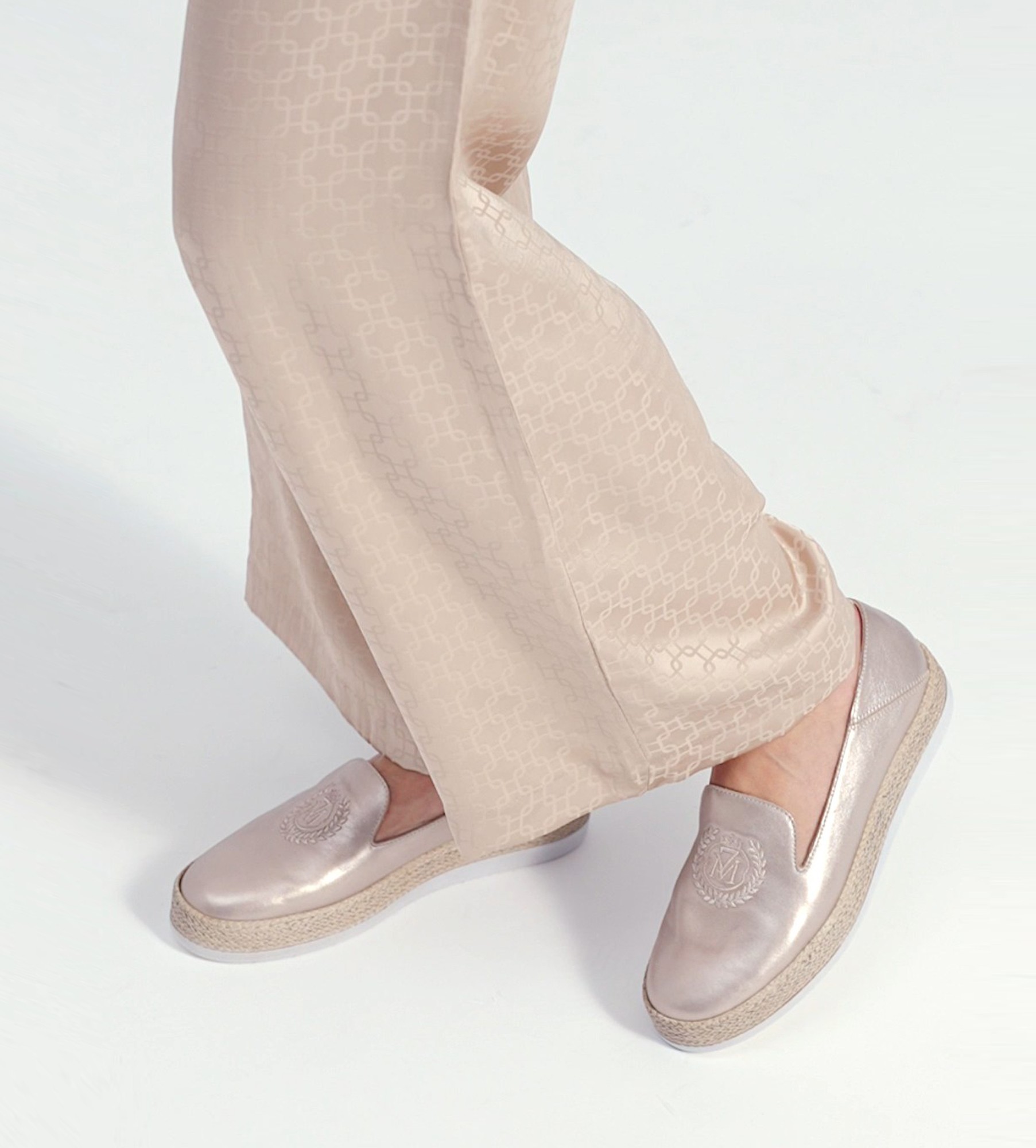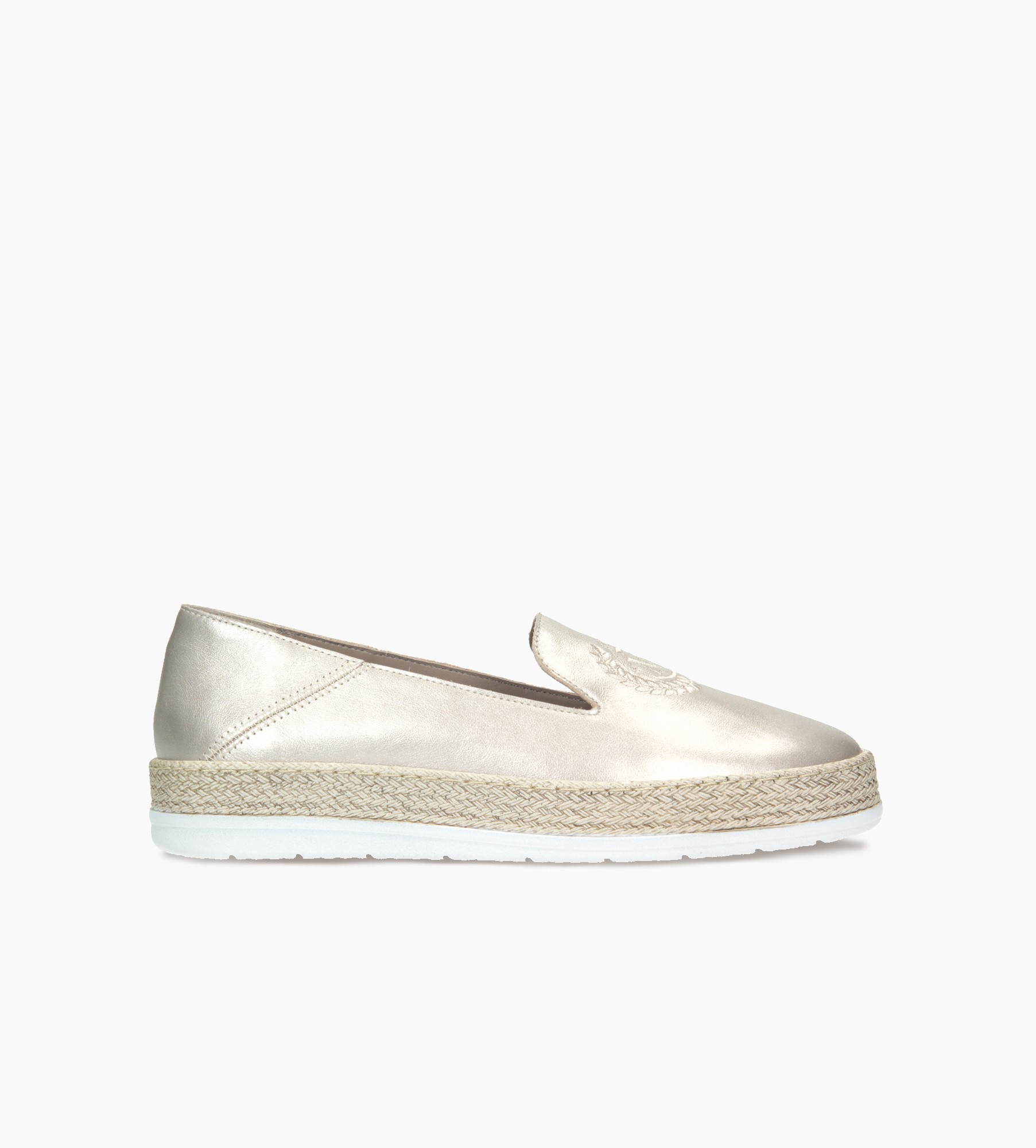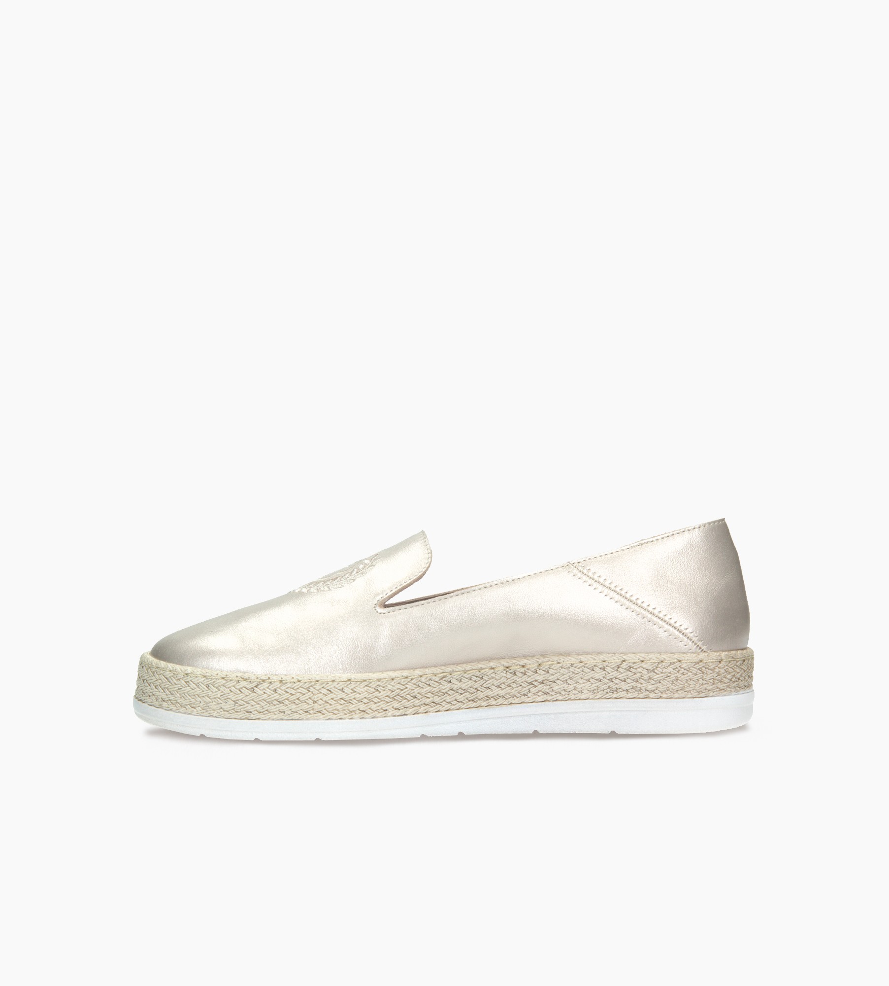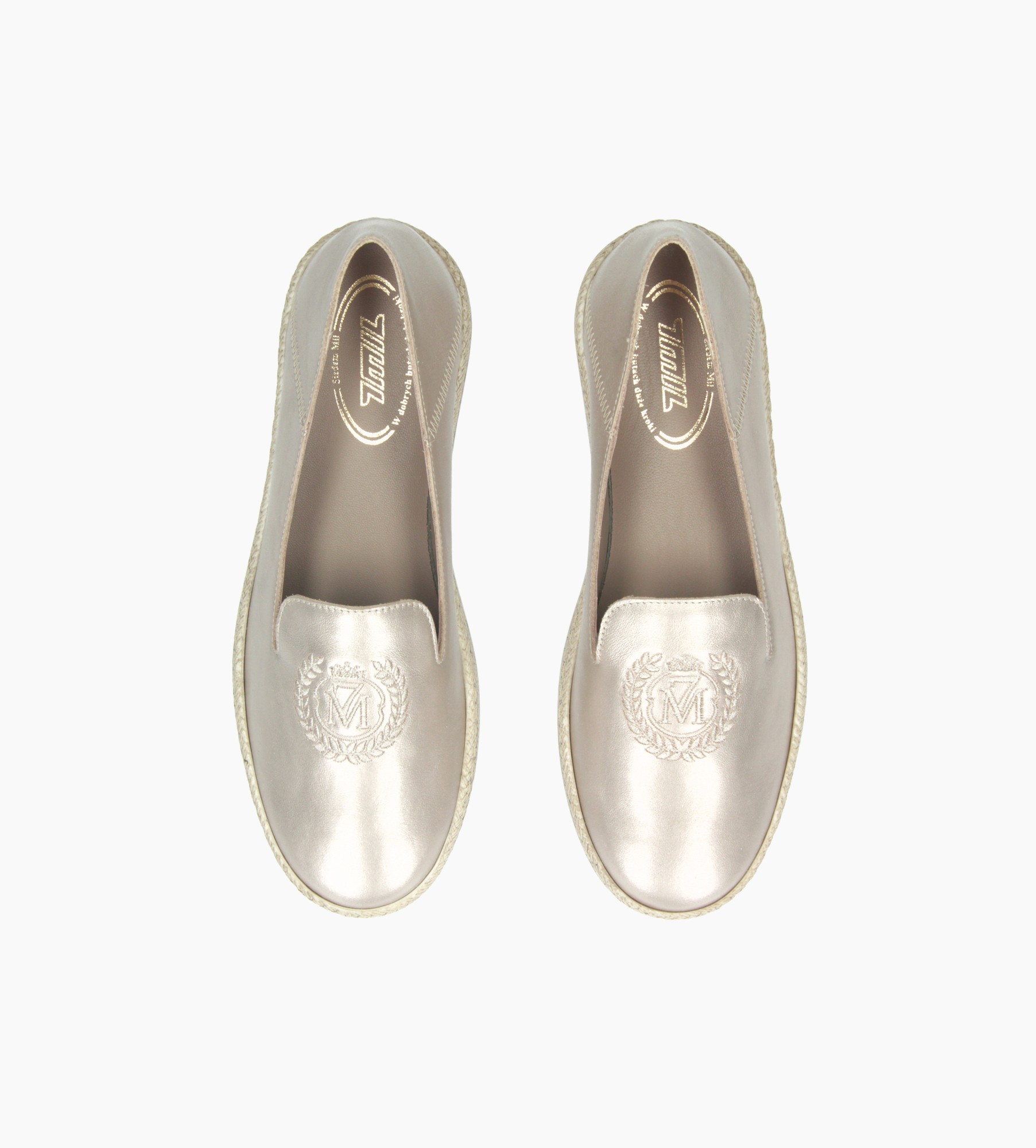 Złote baleriny damskie to wyjątkowy model łączący elegancję z casualowym, letnim akcentem. Wykonane z wysokiej jakości skóry, wyróżniają się subtelnym połyskiem, który dodaje im luksusowego charakteru. Kontrastowa, biała podeszwa z delikatnym słomianym wykończeniem nadaje butom lekkości i naturalnego uroku, inspirowanego stylem espadryli. Cholewkę zdobi precyzyjnie wyszywane logo, które podkreśla prestiżowy design modelu. To idealne obuwie zarówno do codziennych stylizacji, jak i bardziej eleganckich zestawów na wiosnę i lato, łącząc komfort i ponadczasowy styl.