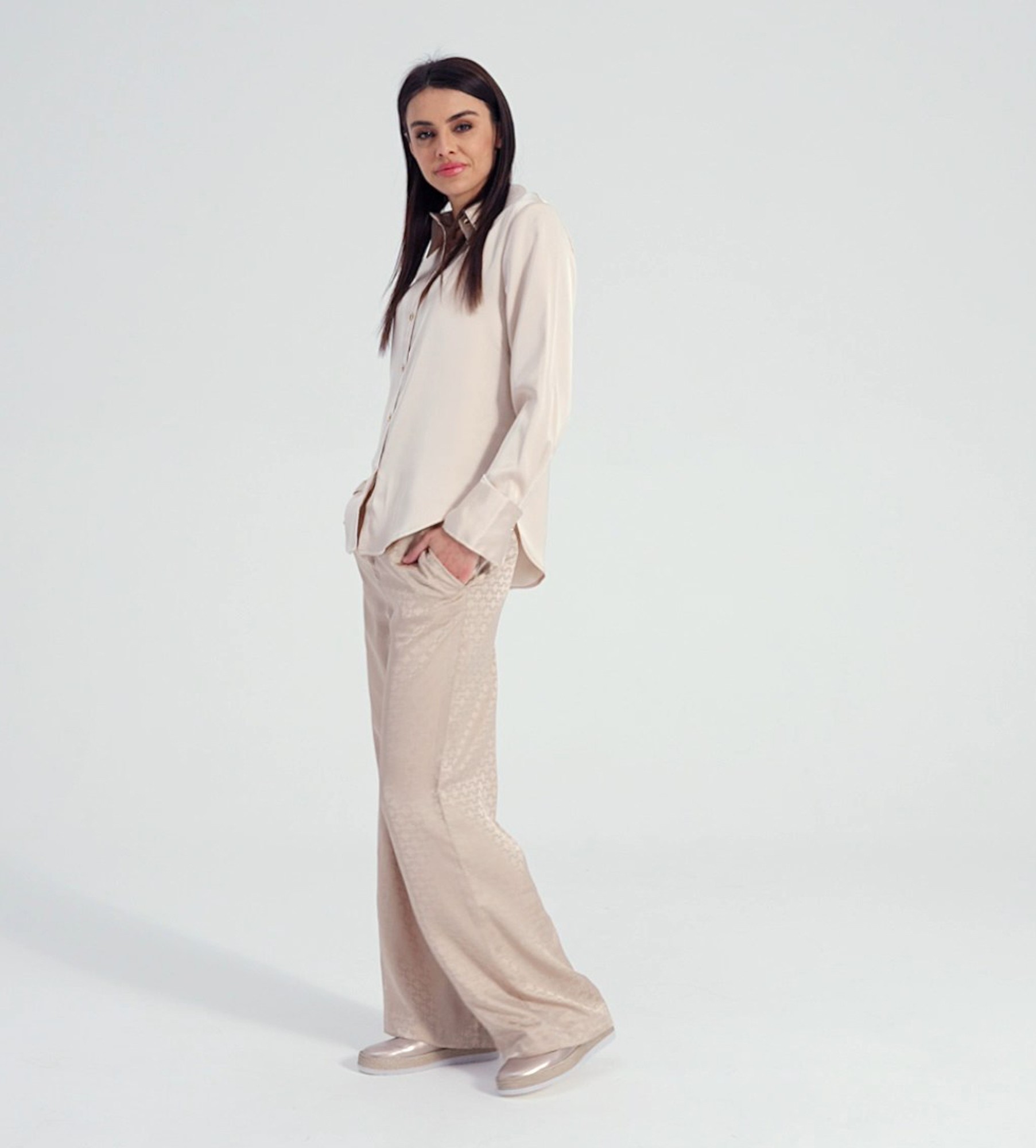 Dla bardziej codziennego, ale nadal eleganckiego looku połącz złote baleriny z jasnoróżowymi cygaretkami i dopasowanym topem w kolorze waniliowym. Na chłodniejsze dni świetnie sprawdzi się oversizowa marynarka w odcieniu kawy z mlekiem. Dodatkiem do stylizacji będzie beżowa listonoszka oraz okulary przeciwsłoneczne w stylu retro. To świetny wybór dla kobiet ceniących wygodę i ponadczasowy styl w miejskich warunkach.