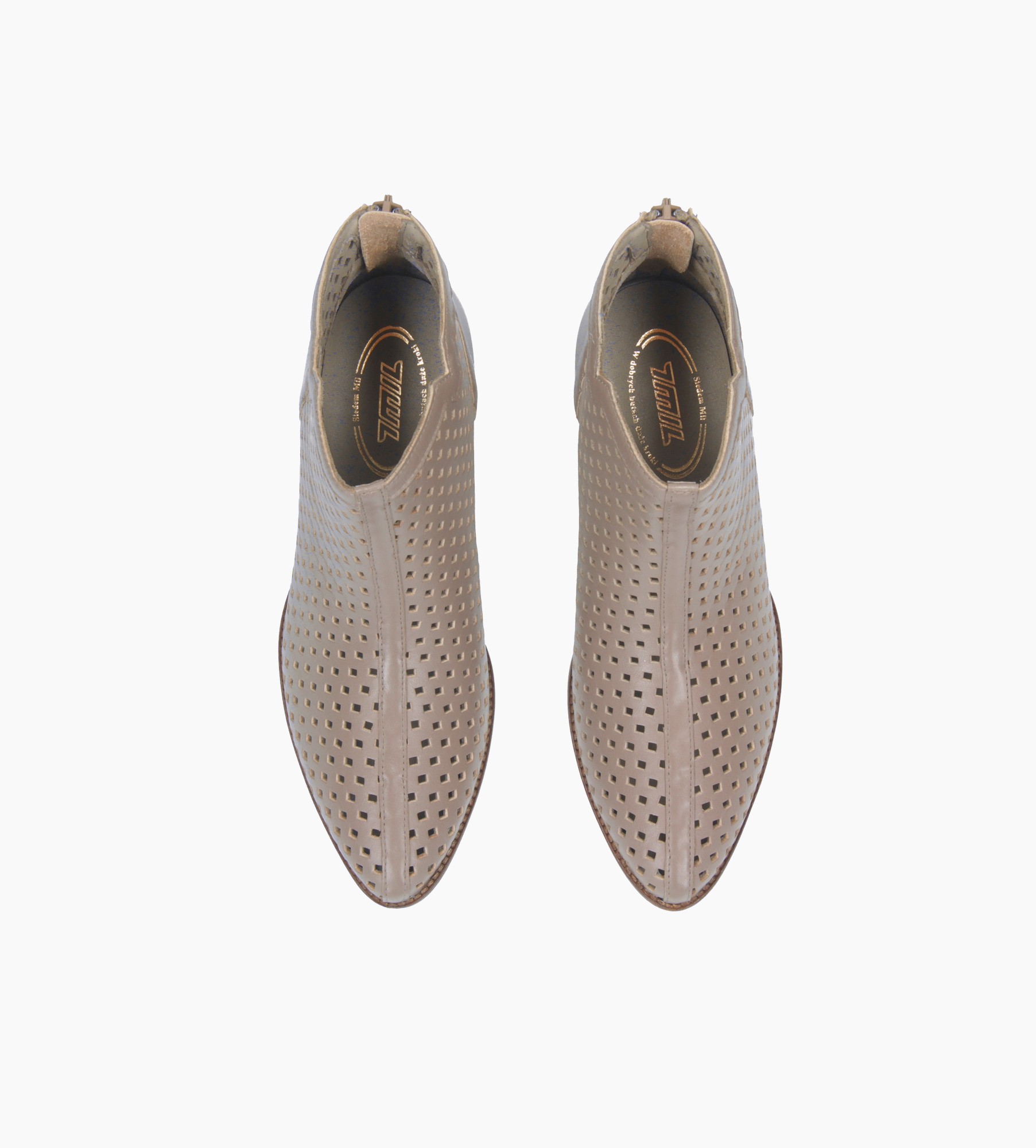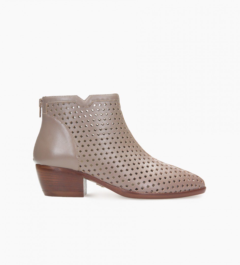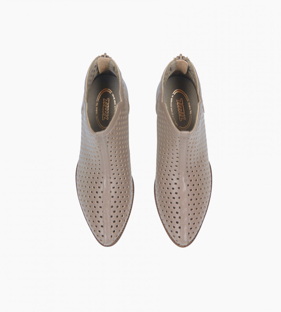 Beżowe botki damskie wykonane z naturalnej, ażurowo perforowanej skóry to doskonały wybór na sezon przejściowy. Ich delikatna struktura zapewnia odpowiednią cyrkulację powietrza, co sprawia, że są komfortowe nawet w cieplejsze dni. Miękka, jagnięca skóra wewnątrz buta gwarantuje wyjątkową wygodę noszenia przez cały dzień. Stabilny, drewniany obcas o optymalnej wysokości dodaje sylwetce lekkości, nie obciążając stóp. Subtelne wycięcie w linii cholewki i zapięcie na suwak z tyłu to praktyczne i estetyczne rozwiązania, które podkreślają nowoczesny charakter butów.