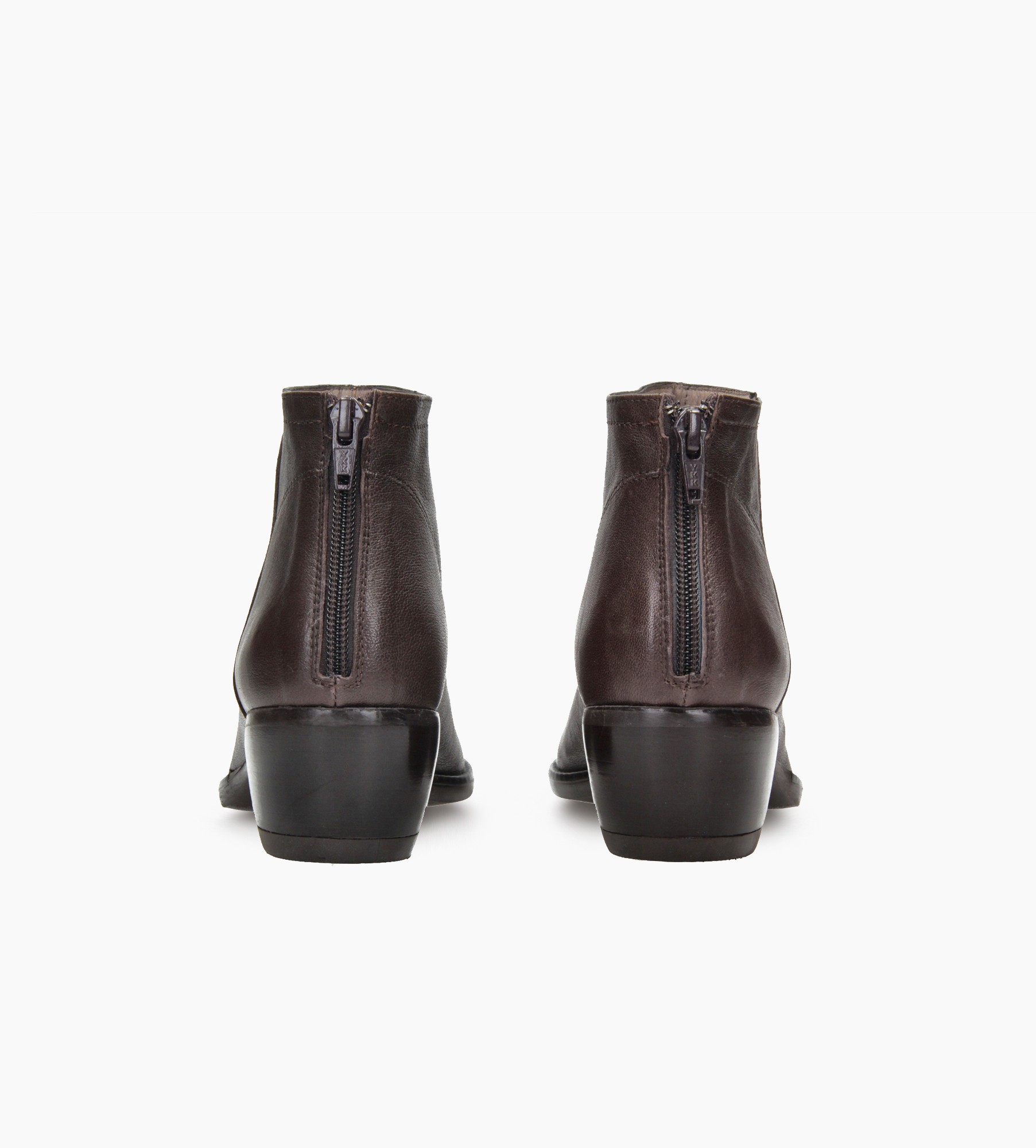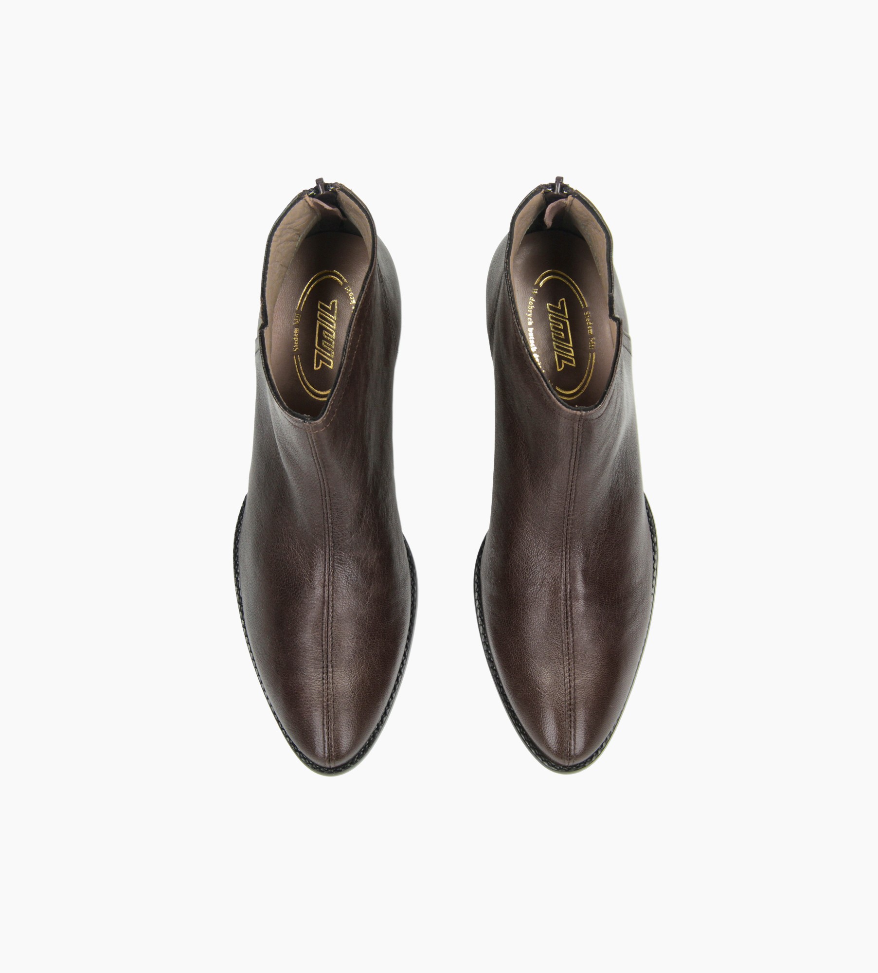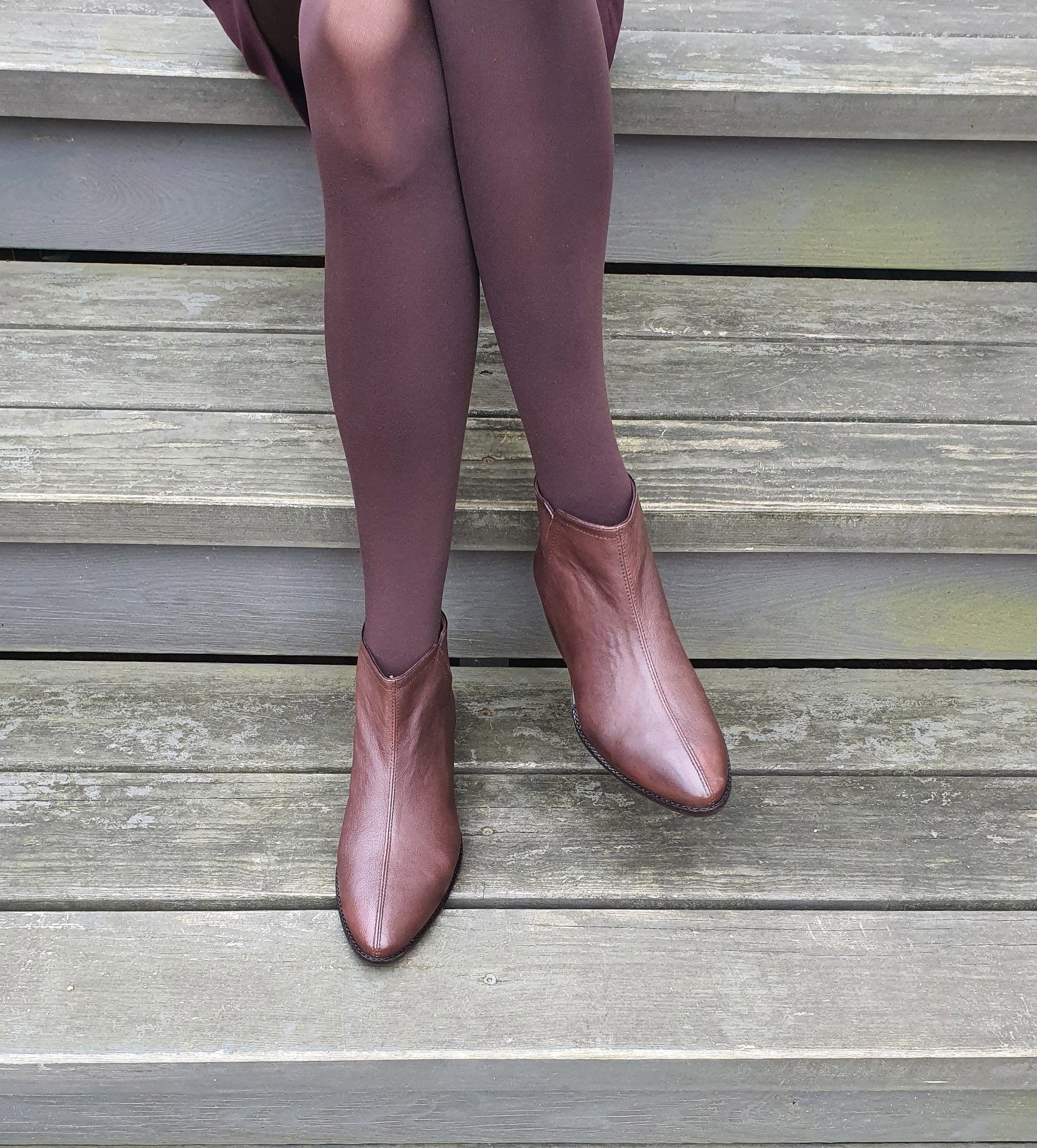 Stylowe i niezwykle wygodne botki damskie wykonane z miękkiej, naturalnej skóry w ciepłym odcieniu brązu. Wnętrze wykończone jest delikatną skórą jagnięcą, która otula stopę i zapewnia komfort noszenia nawet przez cały dzień. Model osadzony jest na wygodnym, stabilnym obcasie o idealnej wysokości, który optycznie wysmukla sylwetkę, a jednocześnie pozostaje bardzo komfortowy. Botki mają elastyczną podeszwę, która doskonale amortyzuje kroki i dostosowuje się do ruchów stopy. Zapinane z tyłu na praktyczny suwak, który ułatwia zakładanie i dodaje całości nowoczesnego charakteru.
