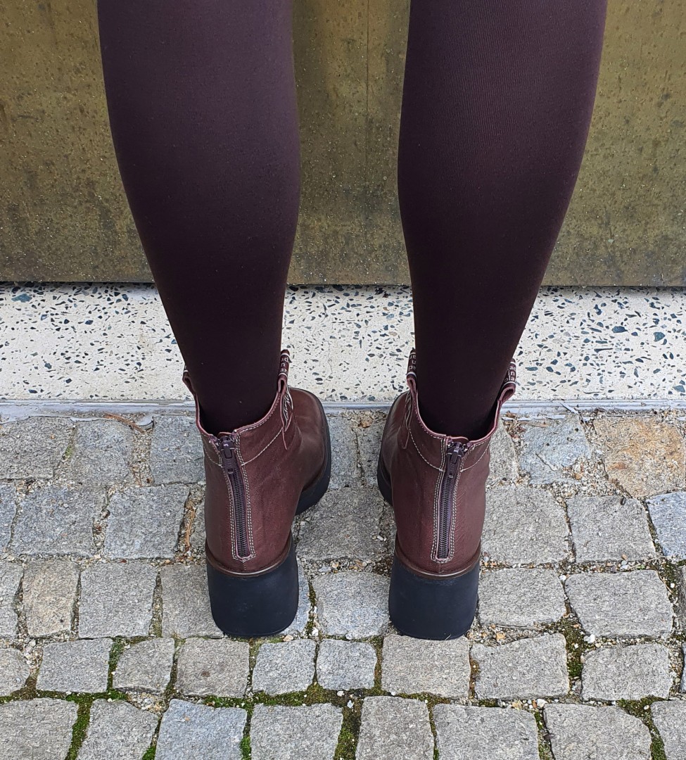 Damskie botki wykonane z naturalnej skóry licowej w głębokim, czekoladowym odcieniu. Wnętrze wyściełane miękką skórą jagnięcą zapewnia wyjątkowy komfort termiczny oraz przyjemność noszenia nawet przez cały dzień. Model osadzony jest na stabilnym, szerokim obcasie o wysokości 8 cm, który zapewnia optymalne podparcie i dodaje sylwetce elegancji. Zapięcie w formie praktycznego suwaka umieszczonego z tyłu ułatwia zakładanie i zdejmowanie obuwia, nie zaburzając czystej linii cholewki. Subtelnym, a zarazem charakterystycznym akcentem są dekoracyjne wstążki z logo marki, umieszczone po bokach buta.