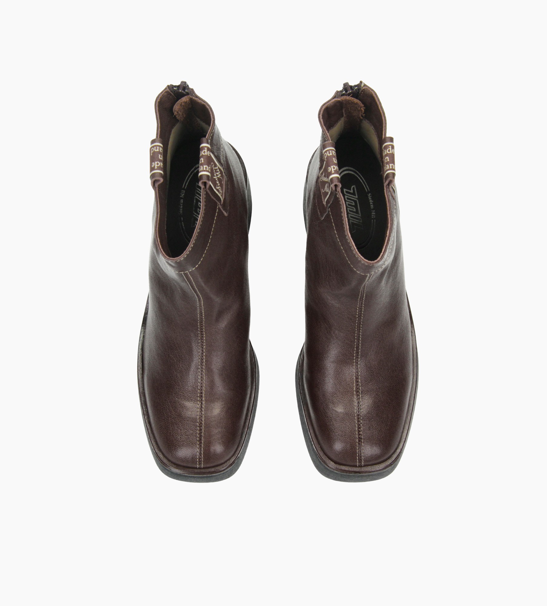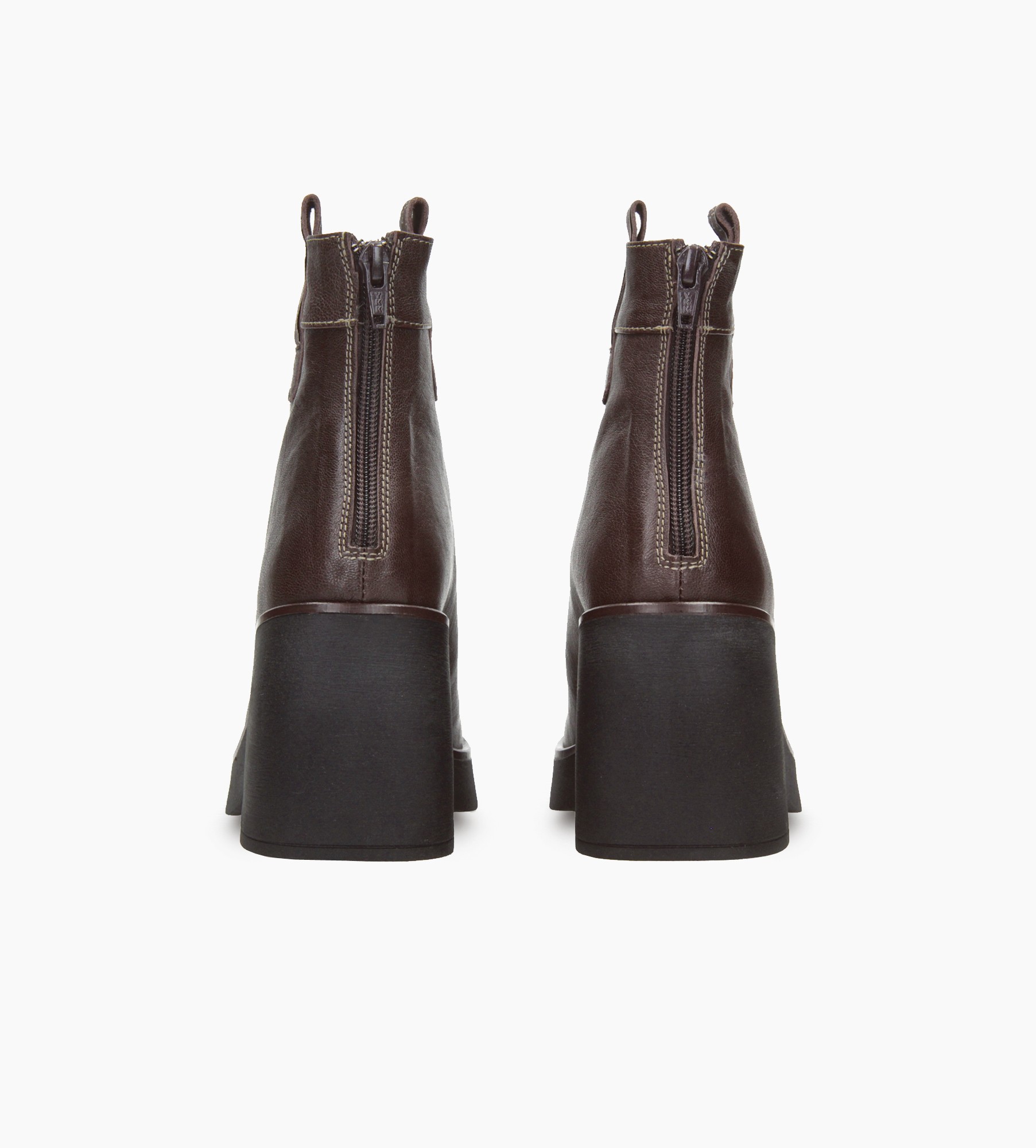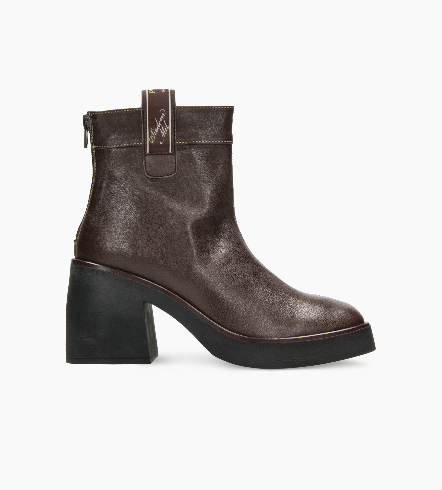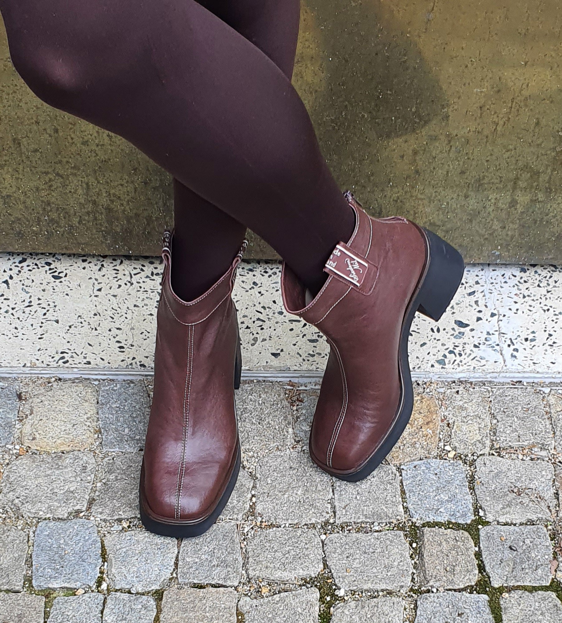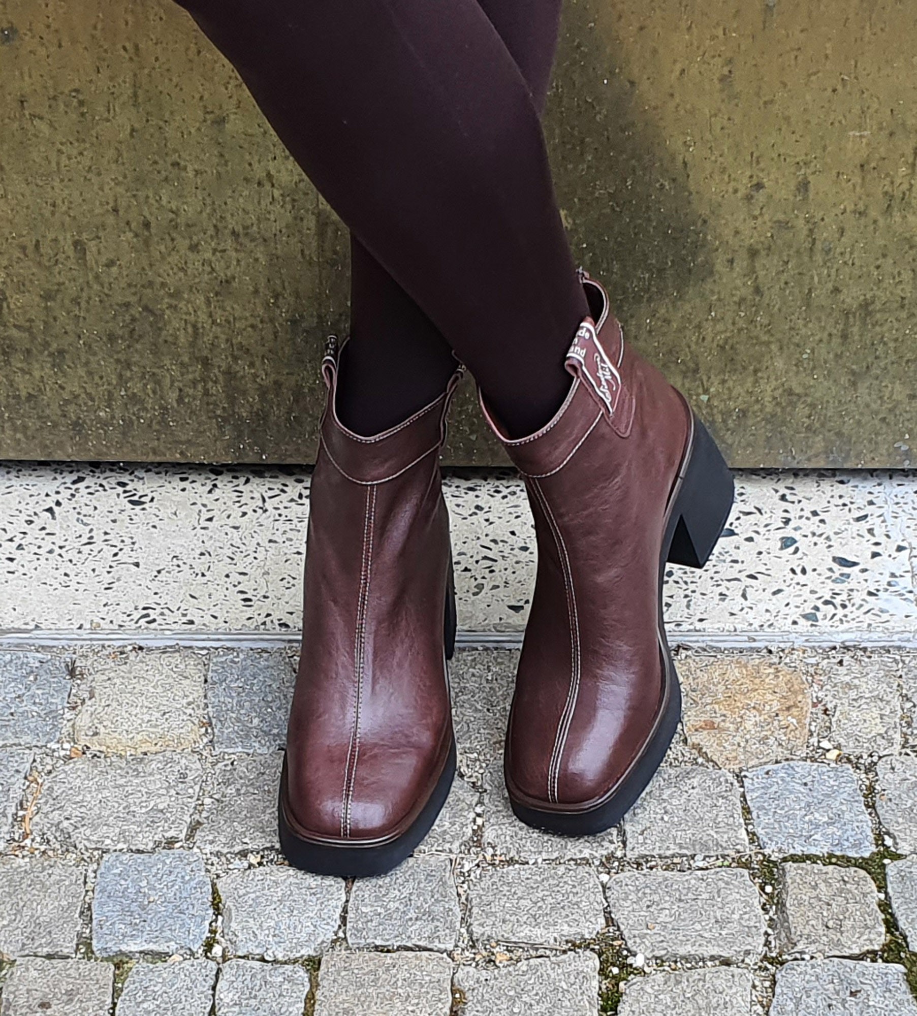 Damskie botki wykonane z naturalnej skóry licowej w głębokim, czekoladowym odcieniu. Wnętrze wyściełane miękką skórą jagnięcą zapewnia wyjątkowy komfort termiczny oraz przyjemność noszenia nawet przez cały dzień. Model osadzony jest na stabilnym, szerokim obcasie o wysokości 8 cm, który zapewnia optymalne podparcie i dodaje sylwetce elegancji. Zapięcie w formie praktycznego suwaka umieszczonego z tyłu ułatwia zakładanie i zdejmowanie obuwia, nie zaburzając czystej linii cholewki. Subtelnym, a zarazem charakterystycznym akcentem są dekoracyjne wstążki z logo marki, umieszczone po bokach buta.