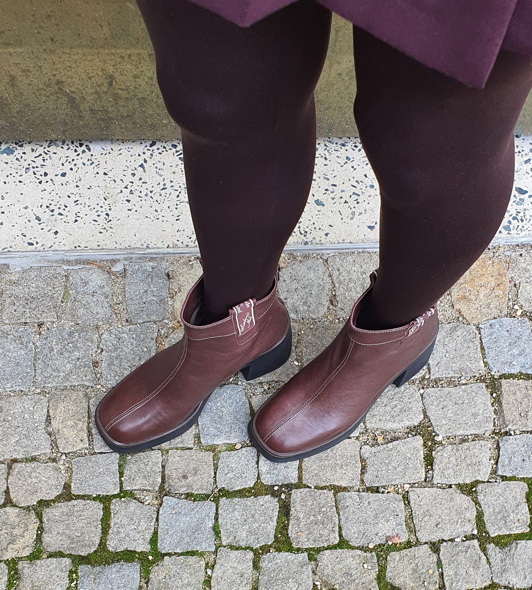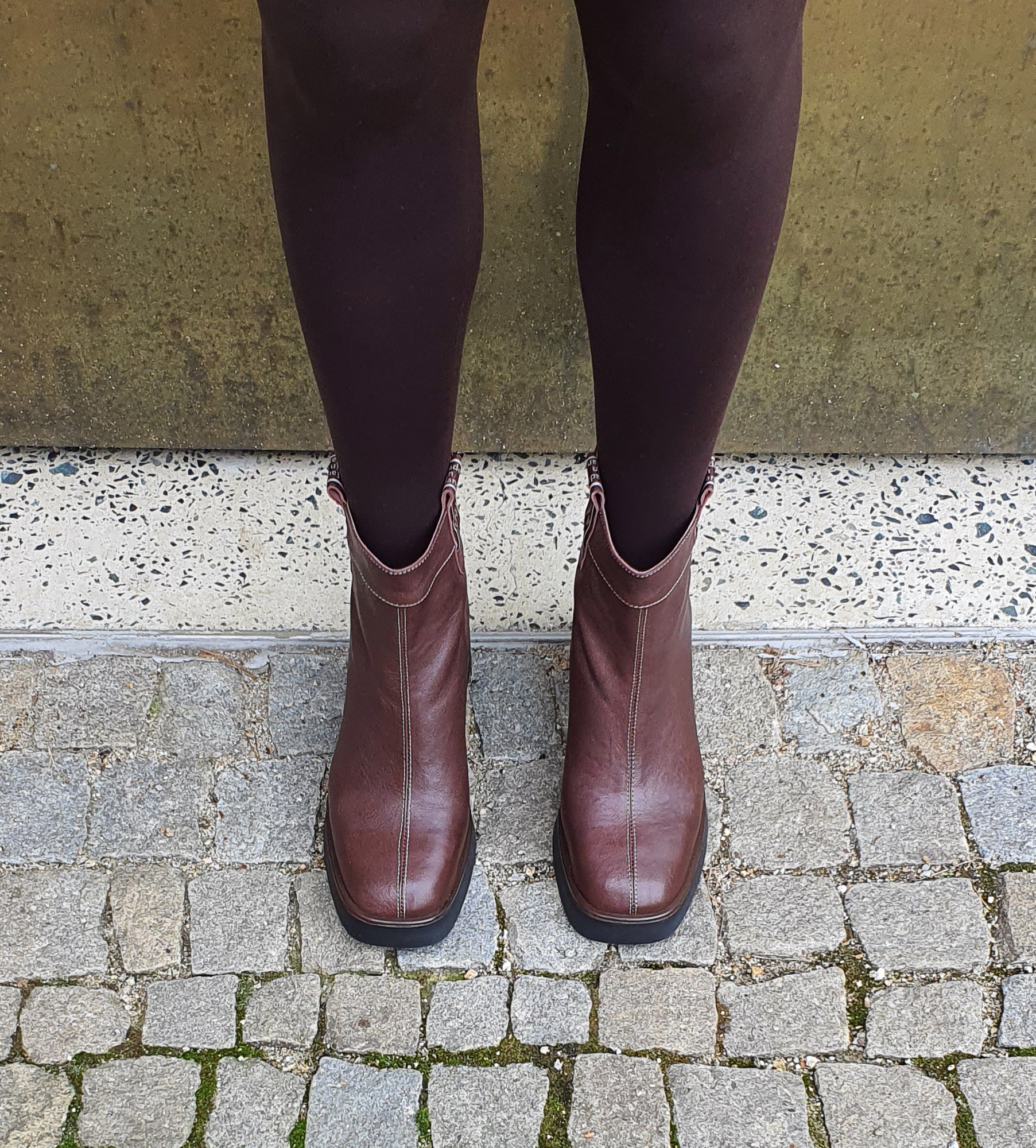 Wybierz szerokie spodnie w kant w odcieniu ciepłego brązu i zestaw je z dopasowanym, dzianinowym golfem w kolorze kości słoniowej. Na wierzch załóż krótszy wełniany płaszcz lub marynarkę w kratę, a stylizację dopełnij skórzaną listonoszką i okularami w grubych oprawkach. Brązowe botki na wysokim obcasie dodają elegancji i wysmuklają sylwetkę, a tylny suwak i wstążki z logo subtelnie przyciągają uwagę.
