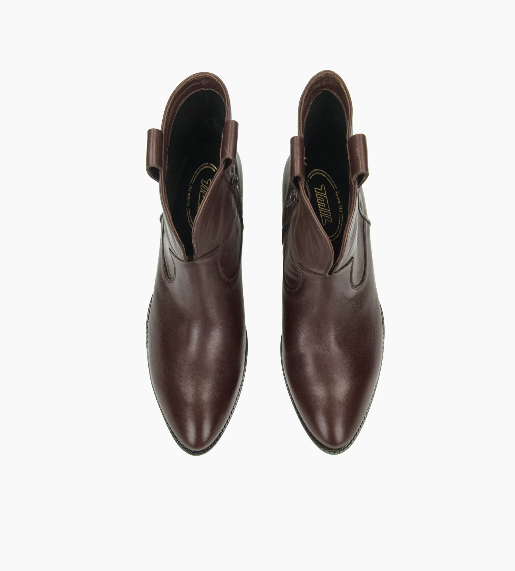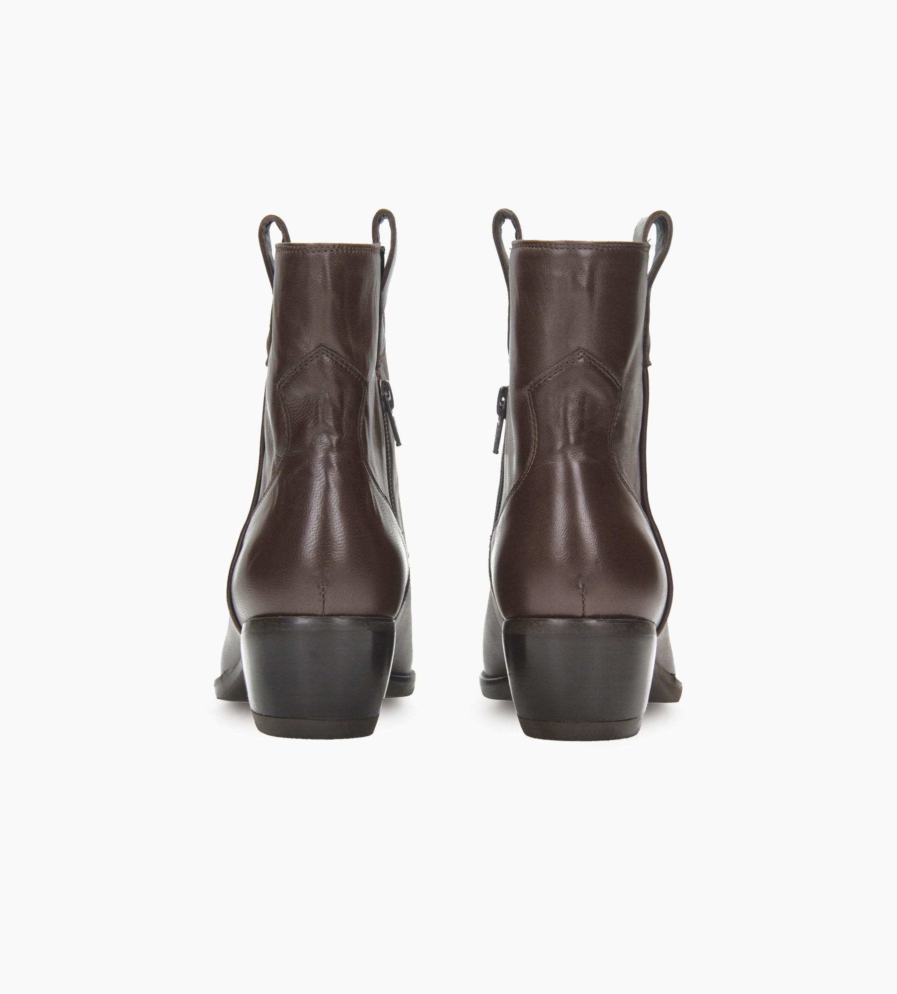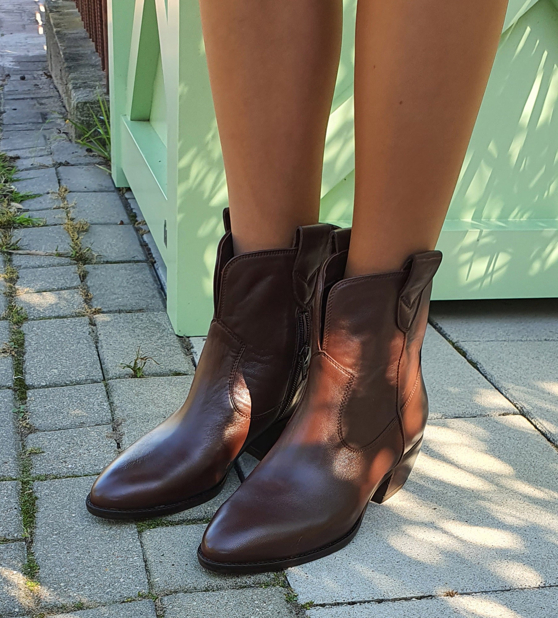 Wyjątkowo stylowe botki damskie wykonane z naturalnej skóry licowej w głębokim, czekoladowym odcieniu to doskonałe połączenie elegancji i komfortu. Ich wnętrze zostało wyściełane miękką skórą jagnięcą, która zapewnia luksusowe uczucie otulenia i wygodę przez cały dzień .Smukły kształt cholewki, subtelne przeszycia oraz niskie, stabilne obcasy nadają modelowi kobiecego charakteru z delikatną nutą stylu western. Brązowa skóra pięknie komponuje się zarówno z jesiennymi, jak i wiosennymi kolorami garderoby, czyniąc ten model niezwykle uniwersalnym.