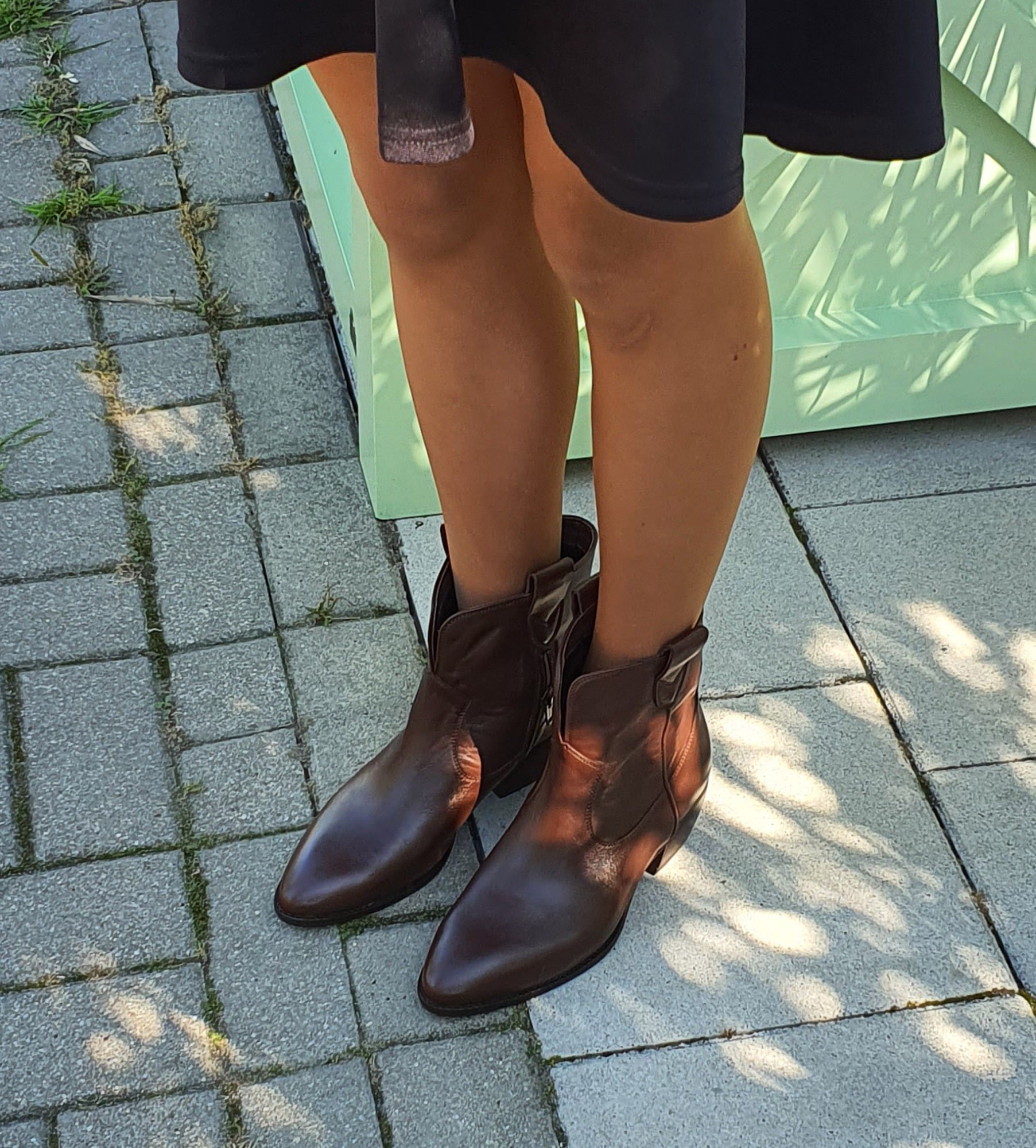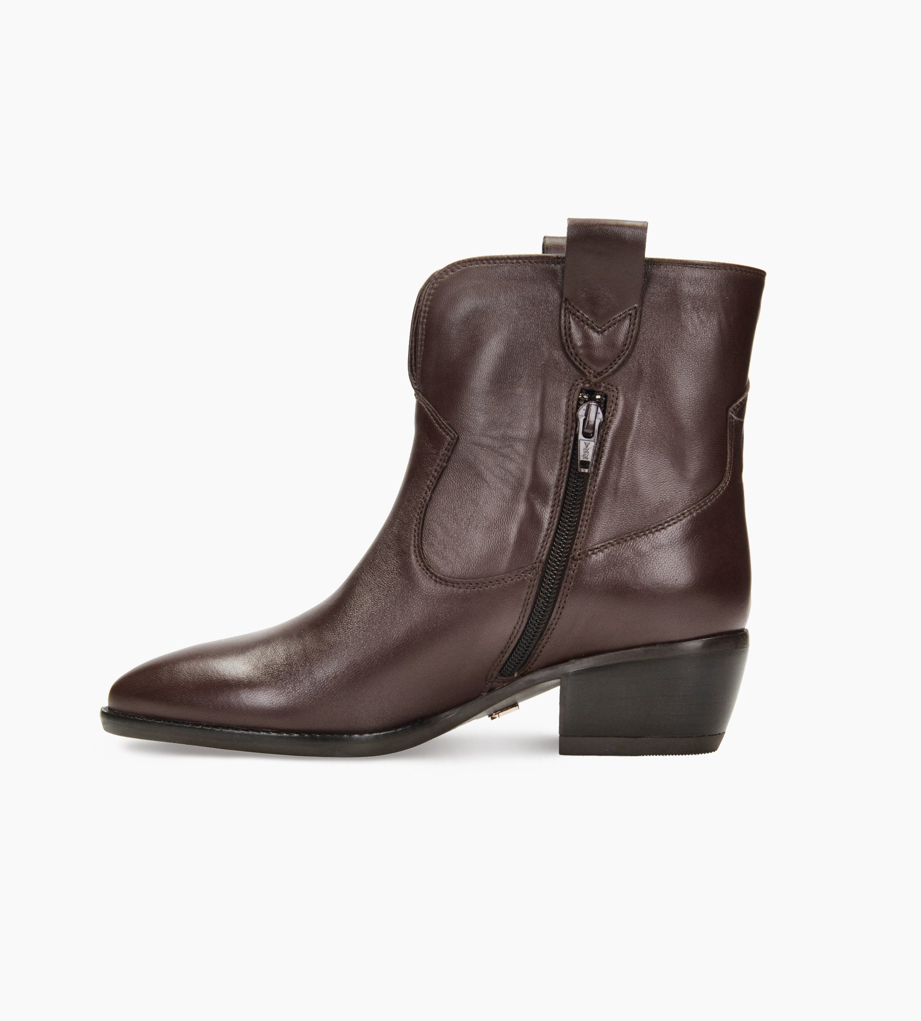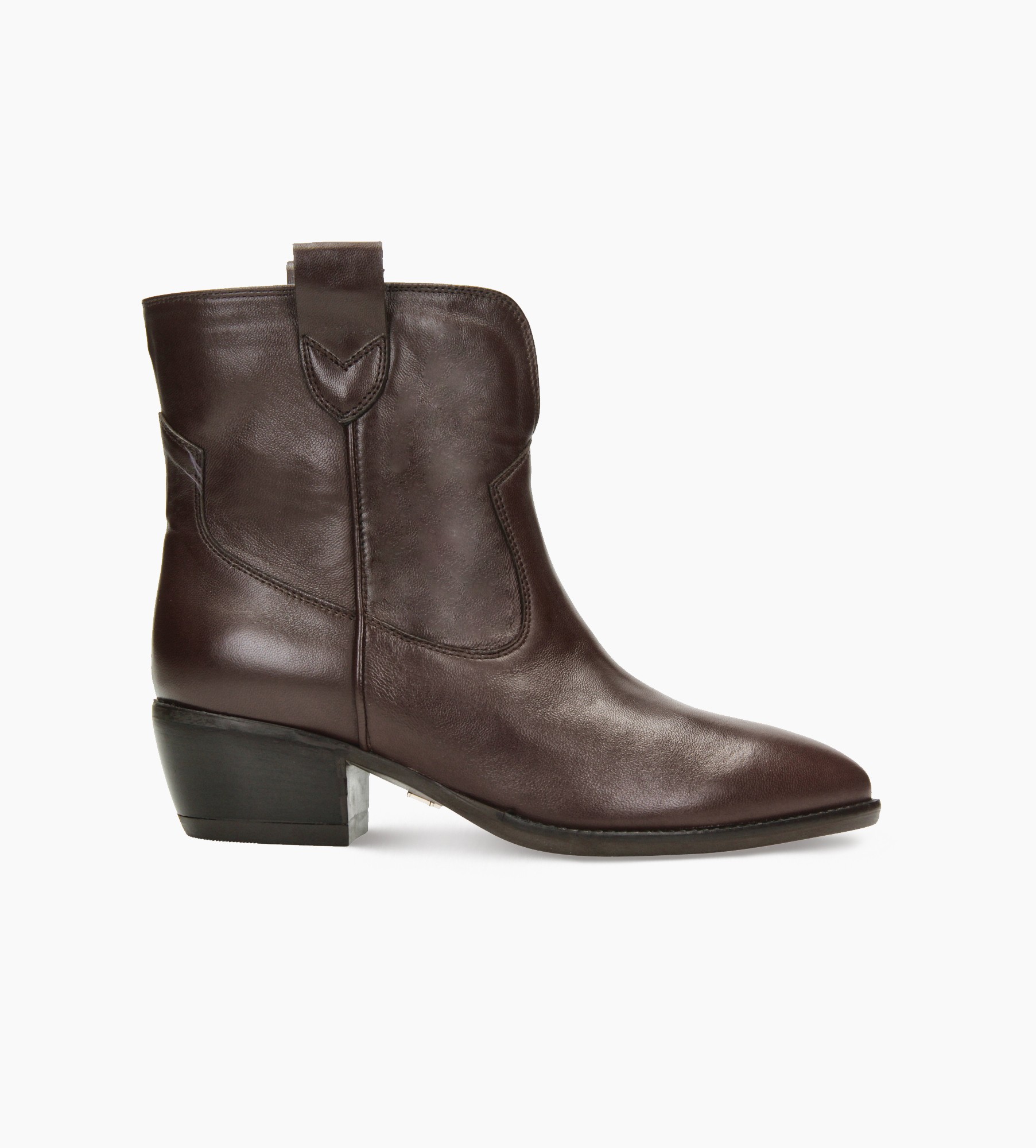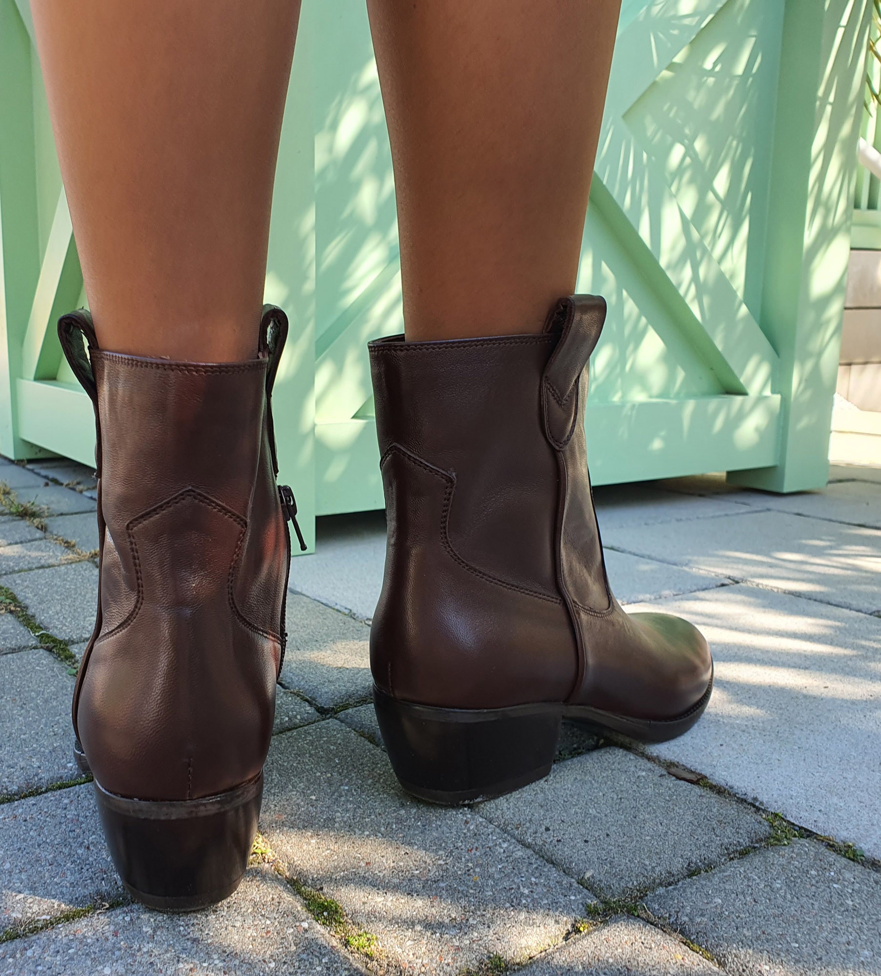 Wyjątkowo stylowe botki damskie wykonane z naturalnej skóry licowej w głębokim, czekoladowym odcieniu to doskonałe połączenie elegancji i komfortu. Ich wnętrze zostało wyściełane miękką skórą jagnięcą, która zapewnia luksusowe uczucie otulenia i wygodę przez cały dzień .Smukły kształt cholewki, subtelne przeszycia oraz niskie, stabilne obcasy nadają modelowi kobiecego charakteru z delikatną nutą stylu western. Brązowa skóra pięknie komponuje się zarówno z jesiennymi, jak i wiosennymi kolorami garderoby, czyniąc ten model niezwykle uniwersalnym.