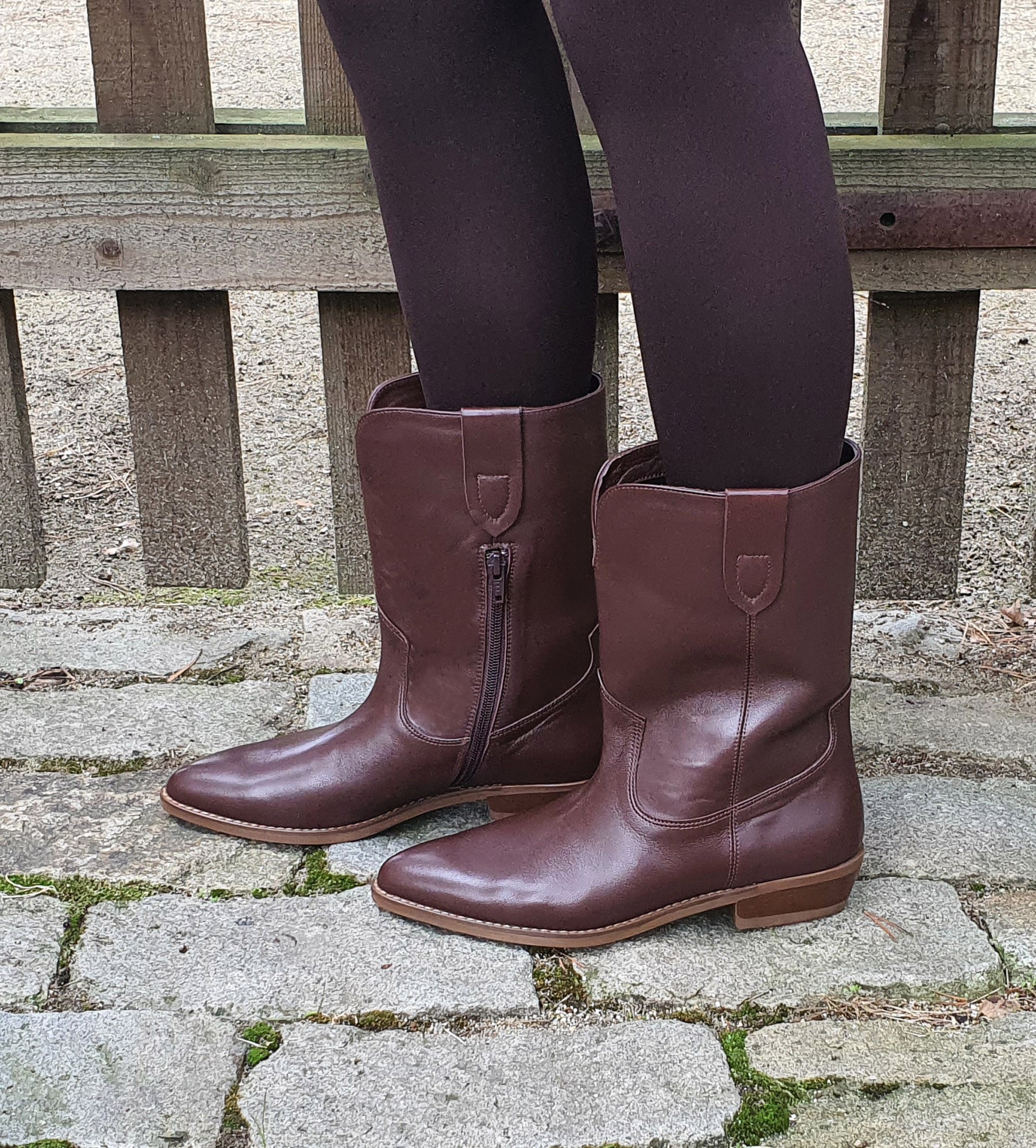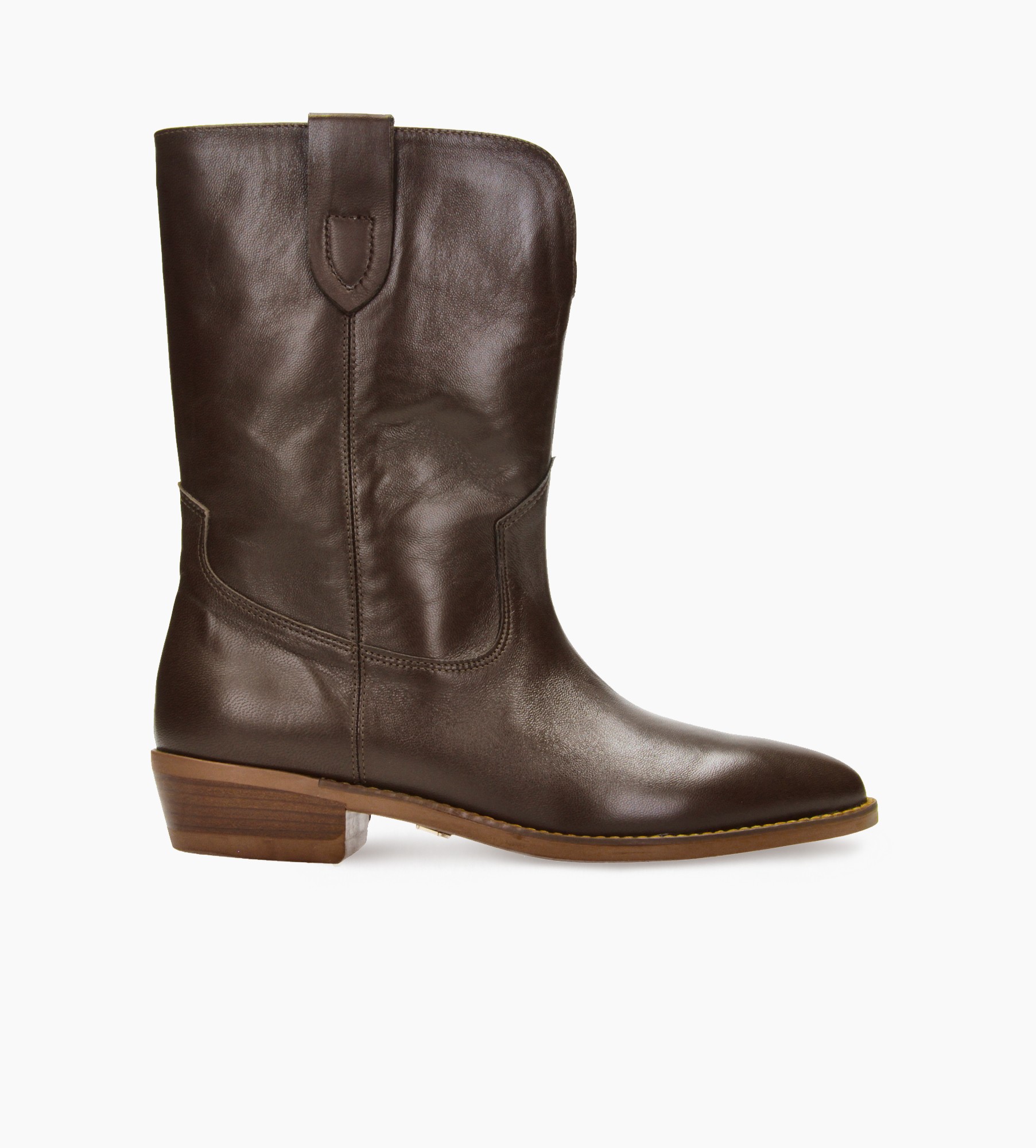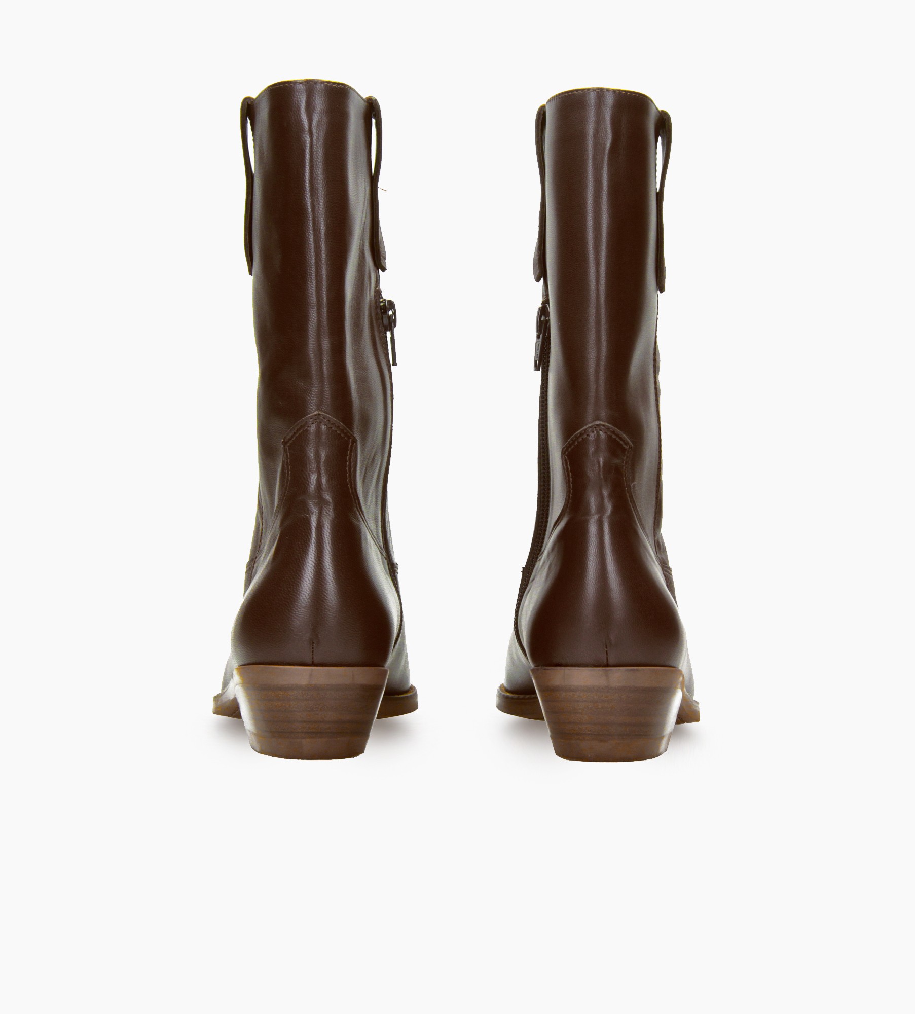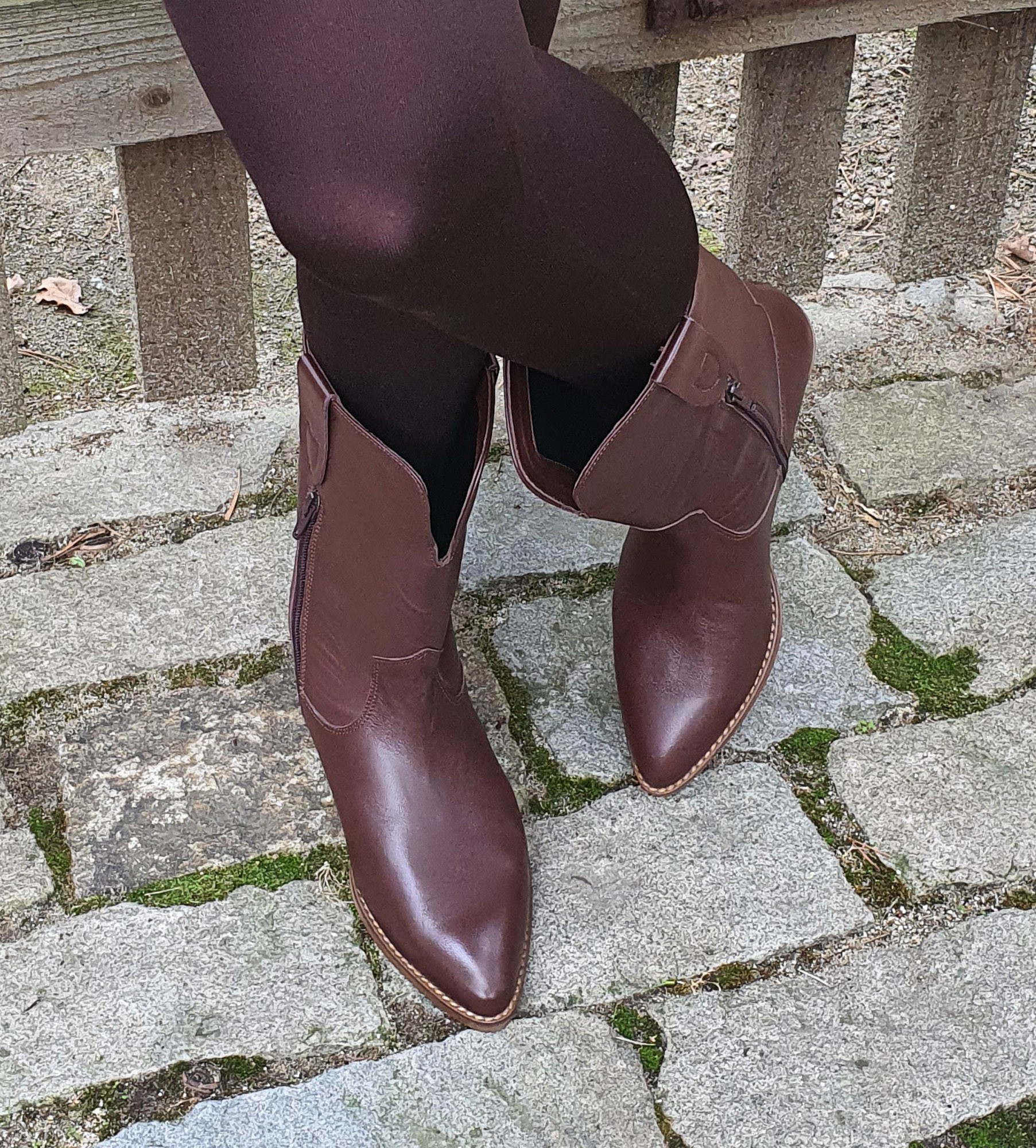 Botki łączące klasyczny design kowbojek z wygodą codziennego użytkowania. Wykonane z naturalnej skóry w odcieniu głębokiego brązu, wyróżniają się charakterystyczną cholewką z ozdobnymi przeszyciami i skórzanymi szlufkami u góry. Model zapinany w połowie na zamek, a w połowie wkładany, zapewnia wygodne zakładanie i idealne dopasowanie do łydki. Stabilny obcas i lekko wydłużony nosek dodają sylwetce smukłości, a kontrastowa podeszwa podkreśla ich stylowy, rustykalny charakter. To idealne buty dla kobiet, które cenią wygodę, charakter i modowy pazur w codziennych stylizacjach.