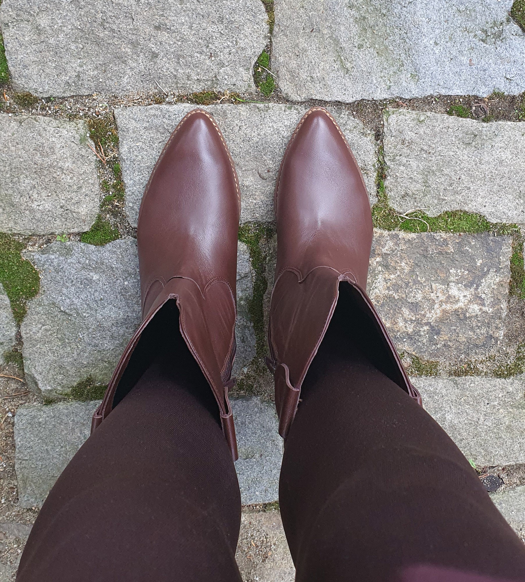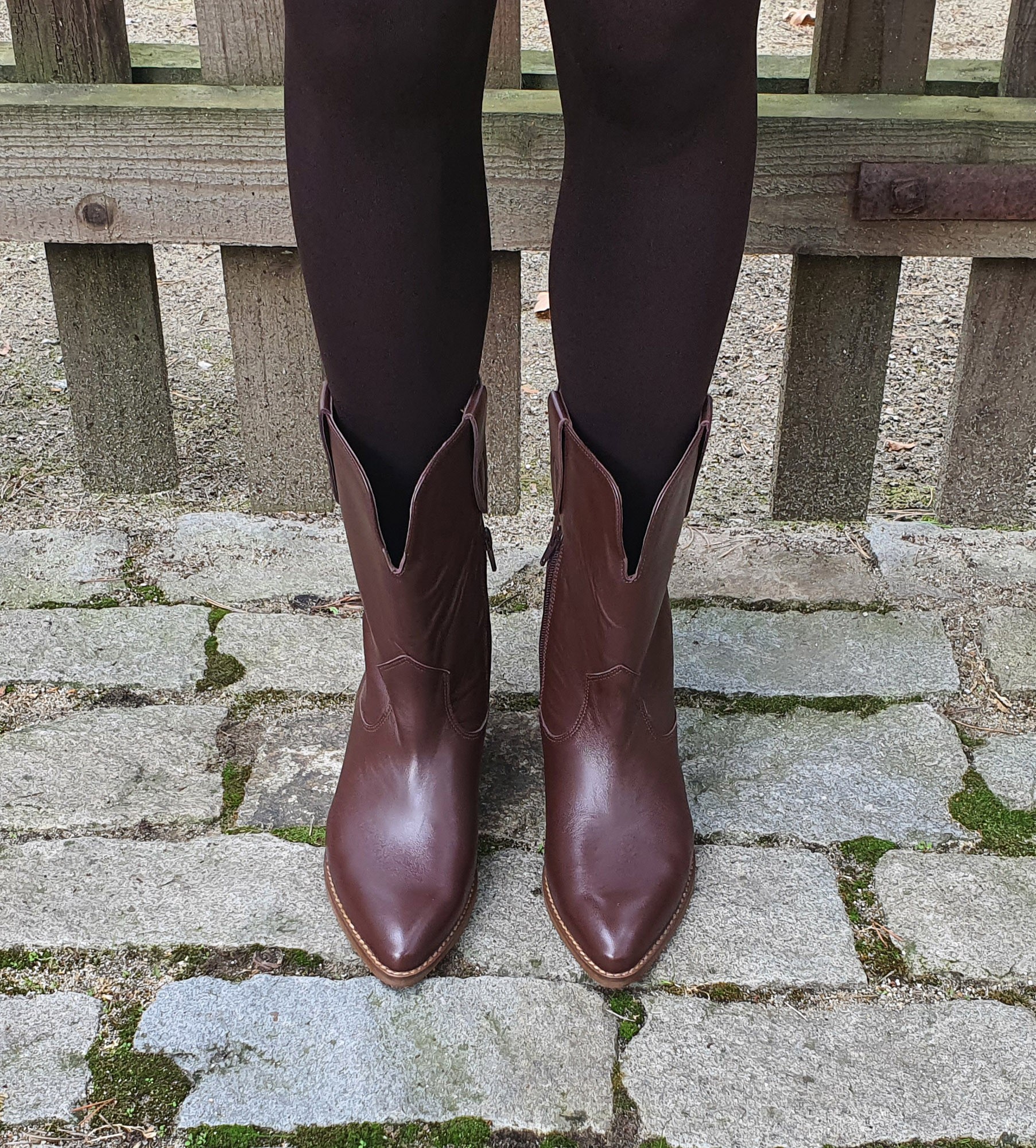 Brązowe botki w kowbojskim stylu świetnie komponują się z ciemnoniebieskimi jeansami typu straight leg oraz lekką, białą koszulą z haftowanym karczkiem. Na wierzch warto narzucić karmelowy płaszcz lub beżową marynarkę o nieco szerszym kroju. Stylizację uzupełnij zamszową torebką typu worek i biżuterią z motywem złota lub bursztynu. To zestawienie łączy westernową swobodę z miejską elegancją – idealne na spacer, kawę w ulubionej kawiarni lub wyjście do pracy w stylu „smart casual”.