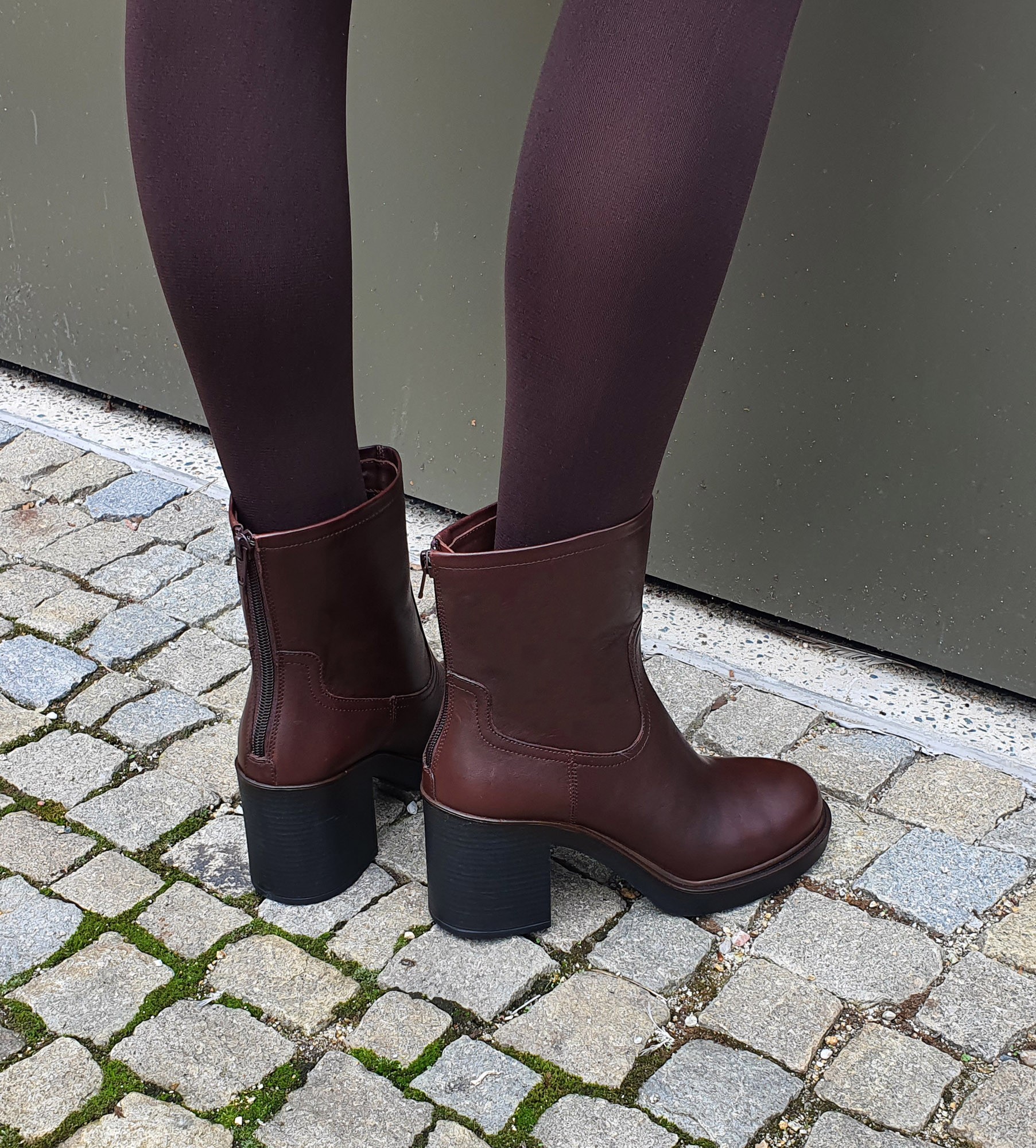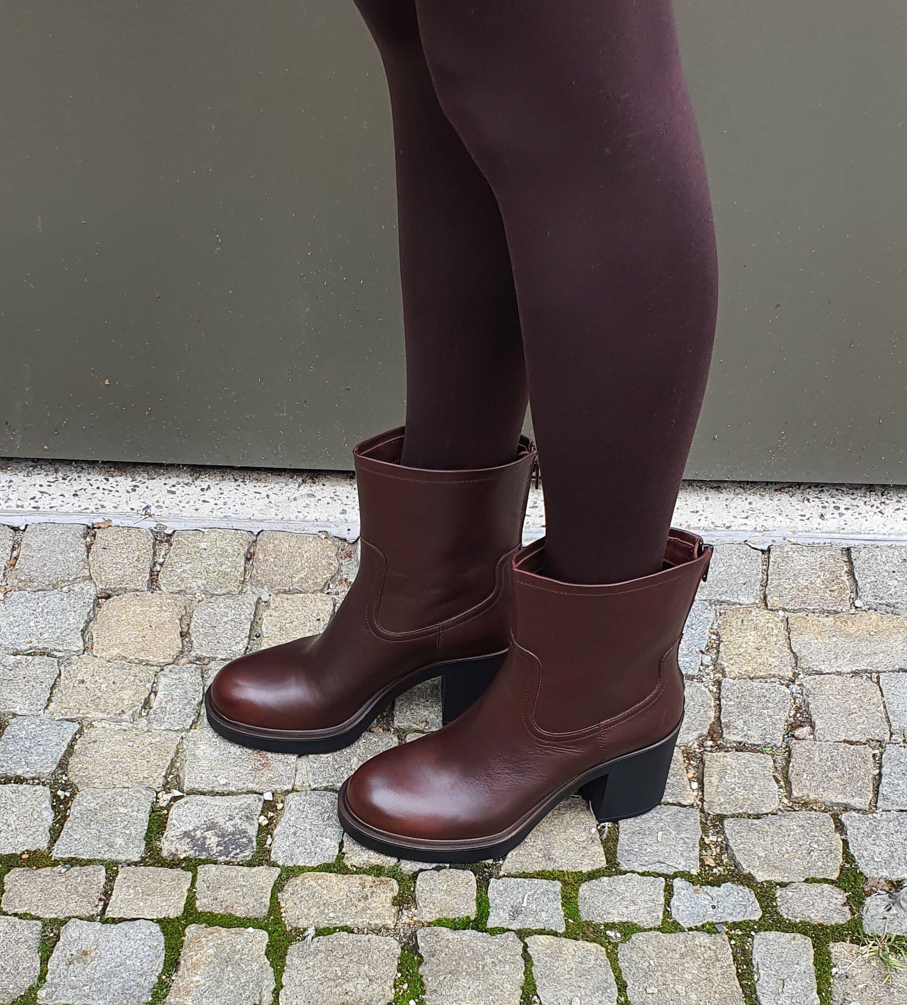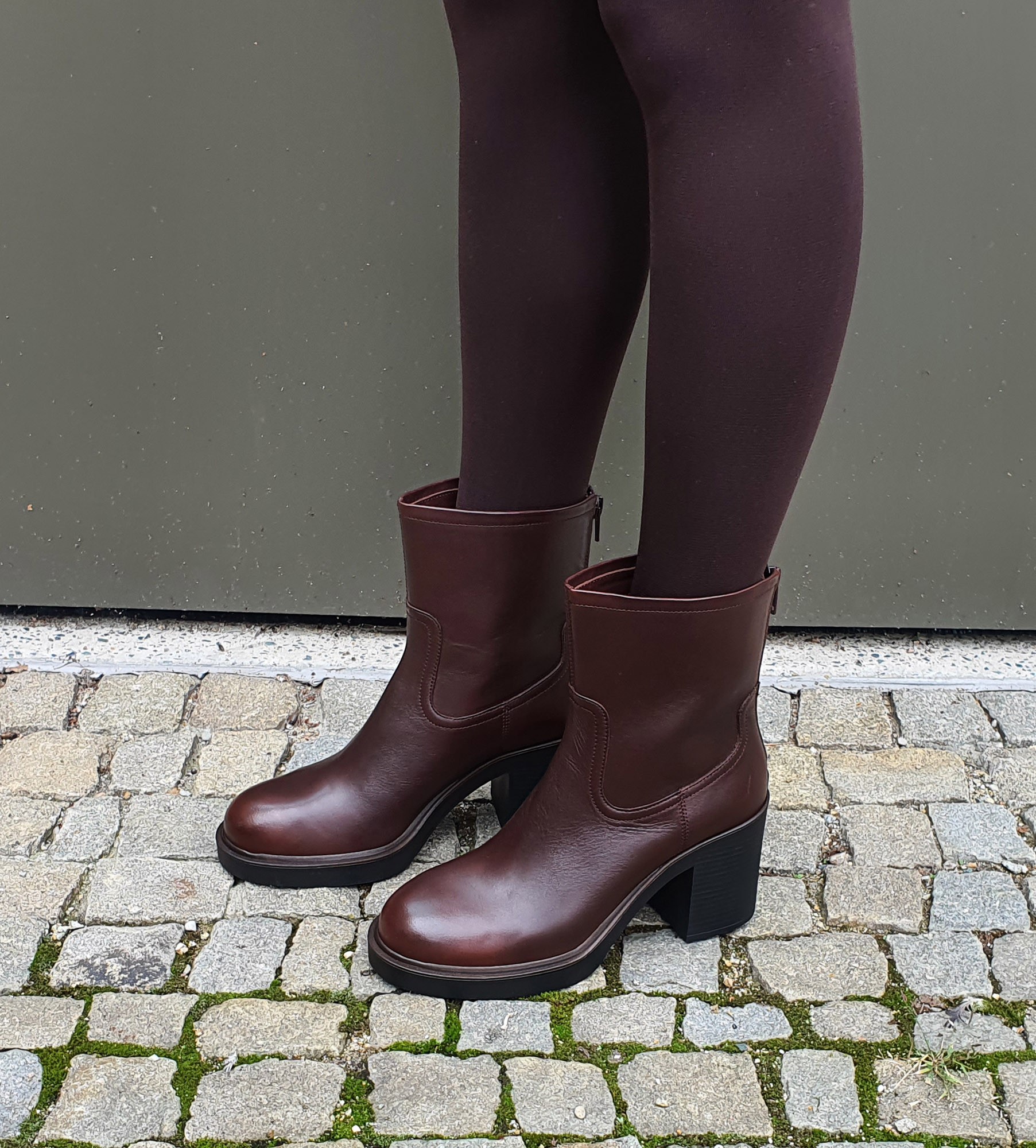 Te stylowe botki wykonane z wysokogatunkowej skóry cielęcej zachwycają prostą, a zarazem wyrazistą formą. Wyższa cholewka subtelnie obejmuje kostkę, optycznie wysmuklając nogę i nadając sylwetce lekkości. Z tyłu umieszczony został praktyczny suwak, który ułatwia zakładanie i podkreśla minimalistyczny charakter modelu. Buty osadzone są na szerokim, stabilnym obcasie oraz lekkiej platformie, co gwarantuje komfort noszenia przez cały dzień – bez względu na warunki pogodowe. Głęboki odcień czekoladowego brązu doskonale wpisuje się w jesienno-zimową paletę barw i sprawia, że botki idealnie komponują się zarówno z dzianinowymi sukienkami, jak i z klasycznymi spodniami.