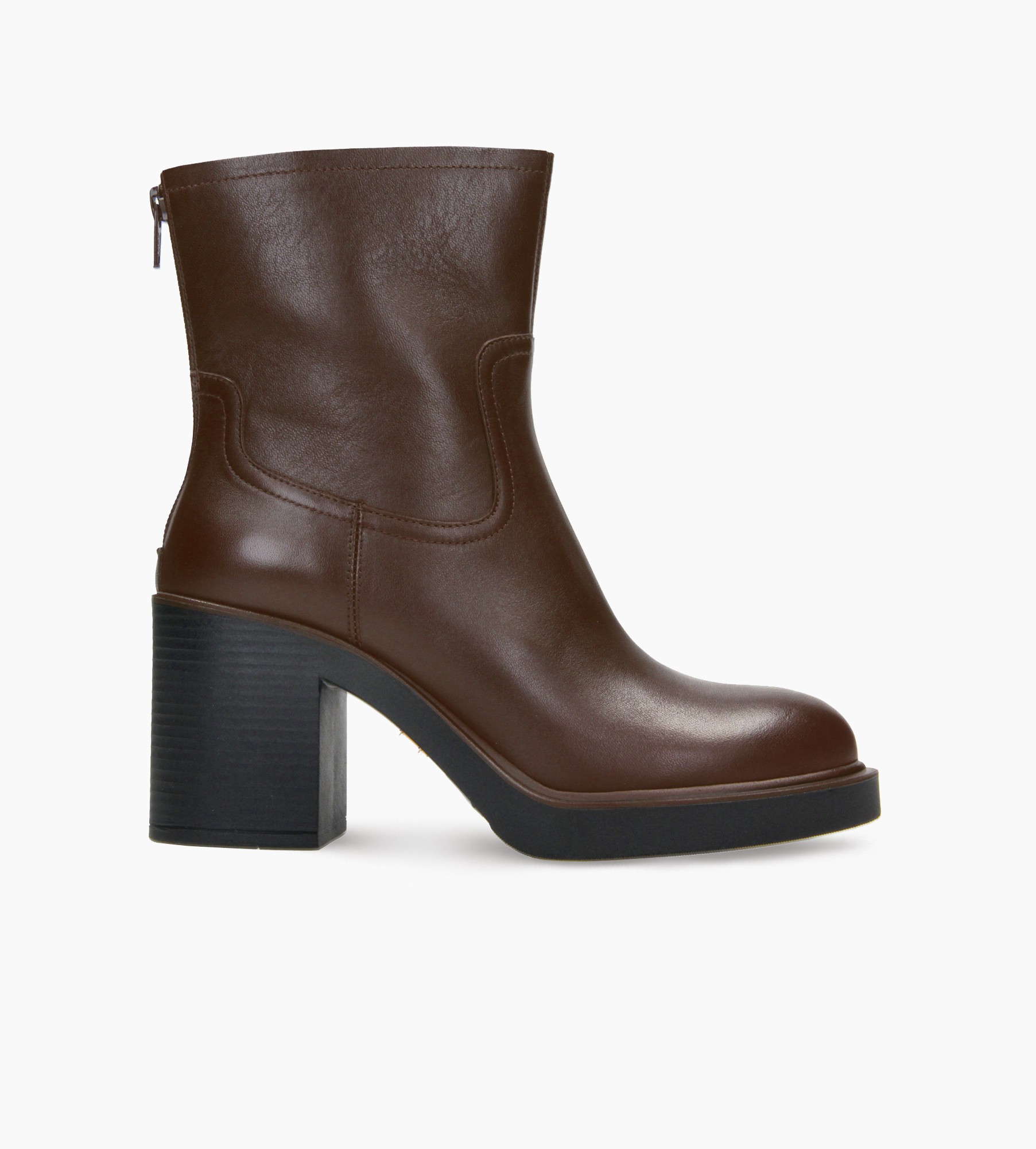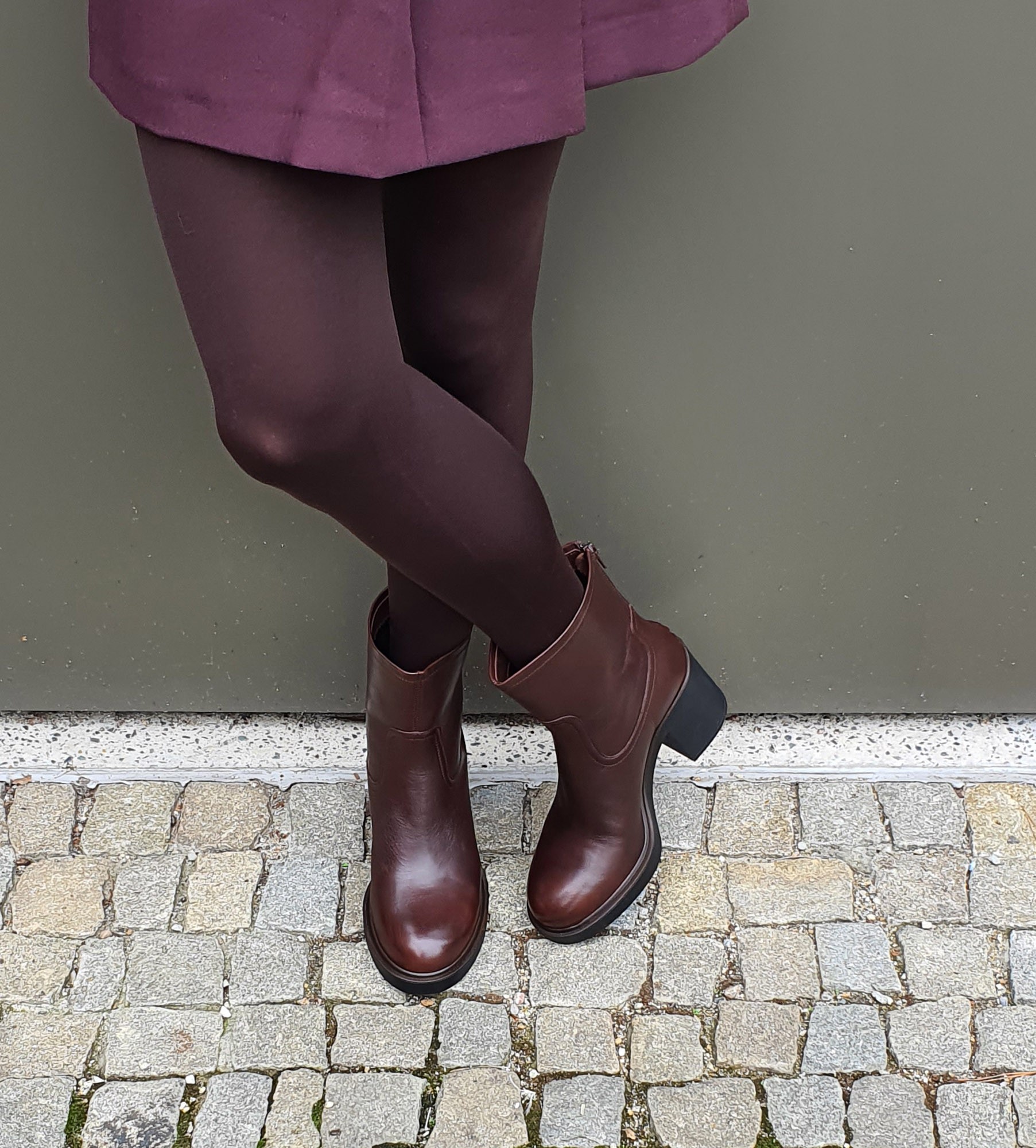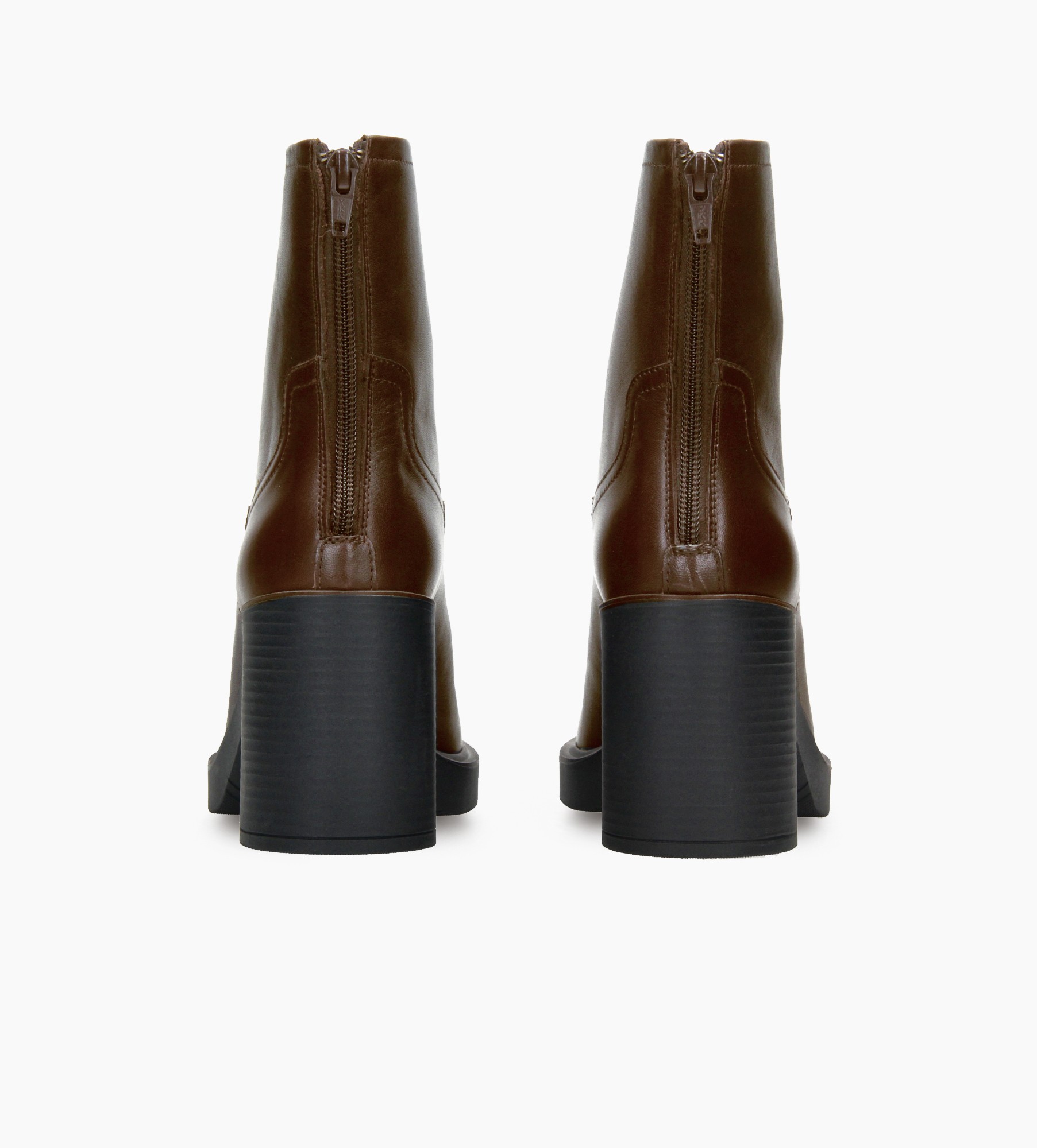 Te stylowe botki wykonane z wysokogatunkowej skóry cielęcej zachwycają prostą, a zarazem wyrazistą formą. Wyższa cholewka subtelnie obejmuje kostkę, optycznie wysmuklając nogę i nadając sylwetce lekkości. Z tyłu umieszczony został praktyczny suwak, który ułatwia zakładanie i podkreśla minimalistyczny charakter modelu. Buty osadzone są na szerokim, stabilnym obcasie oraz lekkiej platformie, co gwarantuje komfort noszenia przez cały dzień – bez względu na warunki pogodowe. Głęboki odcień czekoladowego brązu doskonale wpisuje się w jesienno-zimową paletę barw i sprawia, że botki idealnie komponują się zarówno z dzianinowymi sukienkami, jak i z klasycznymi spodniami.