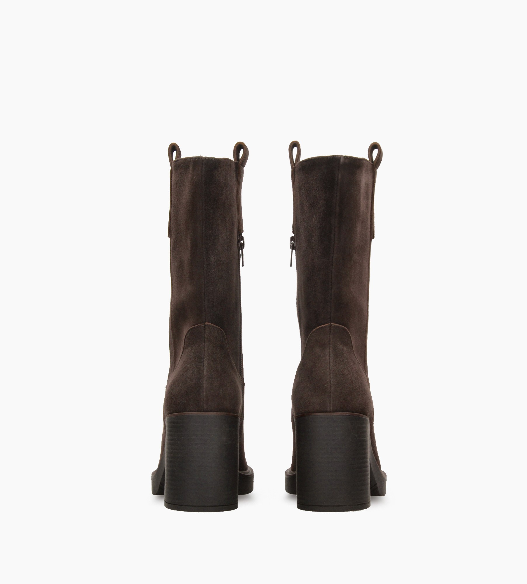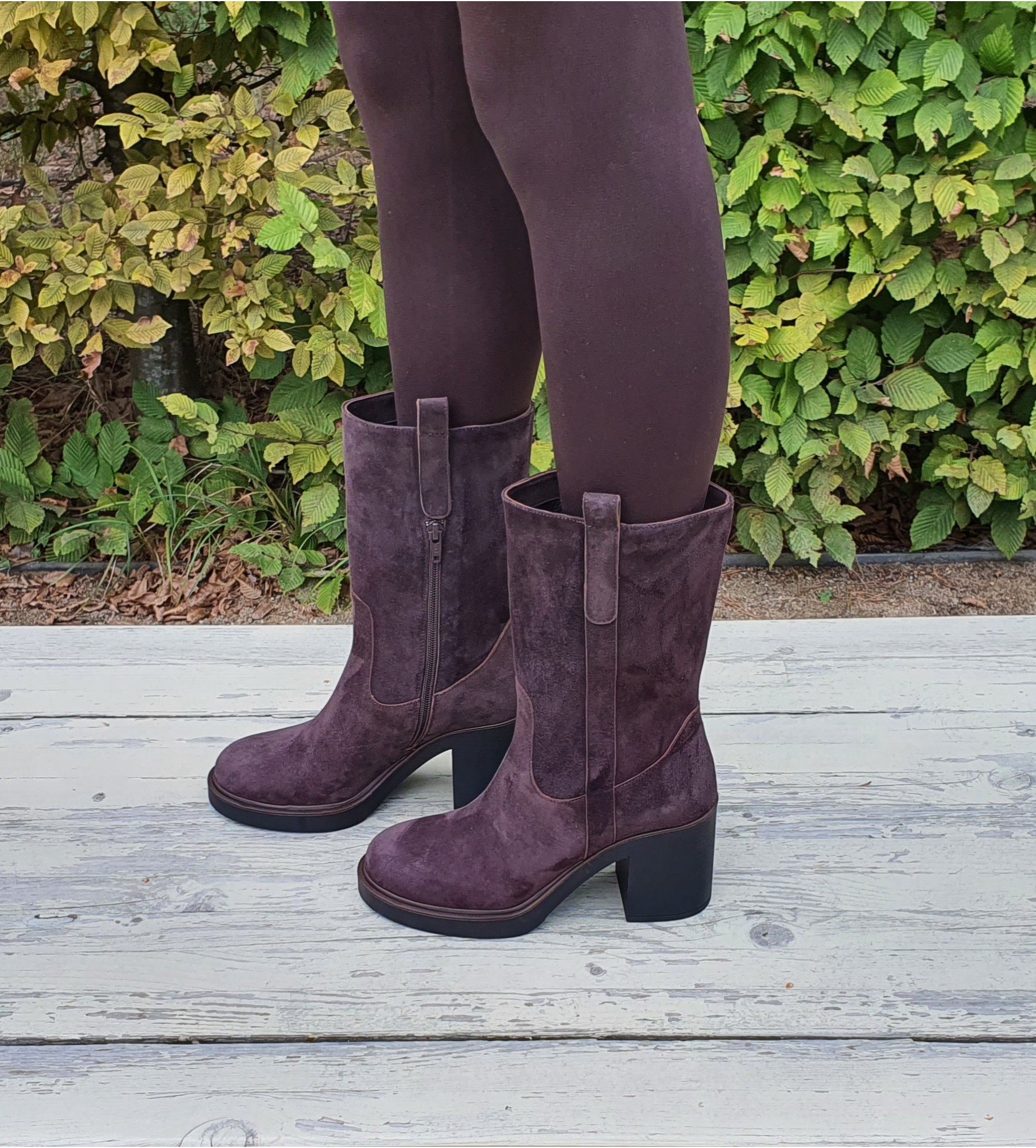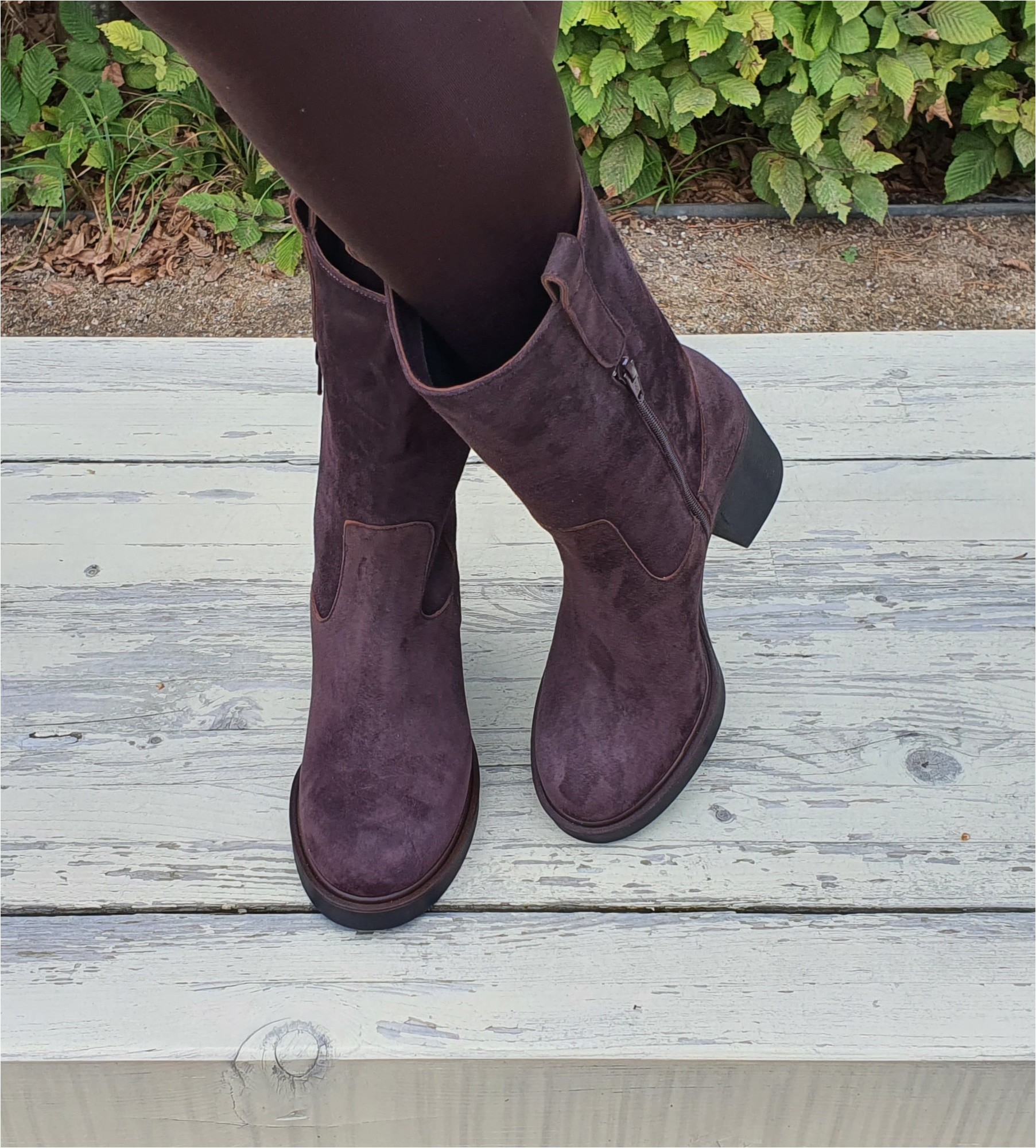 Brązowe zamszowe botki damskie wykonane z wysokiej jakości naturalnej skóry. Model osadzony na wygodnym i stabilnym klockowatym obcasie, który zapewnia komfort noszenia przez cały dzień. Cholewka sięga połowy łydki i jest zapinana z boku na zamek, co ułatwia zakładanie. Po bokach znajdują się dekoracyjne paski, nawiązujące subtelnie do stylistyki western, nadające butom unikalnego charakteru. Idealne do stylizacji casualowych i eleganckich — to uniwersalna propozycja dla kobiet ceniących połączenie wygody, mody i wyrafinowania.