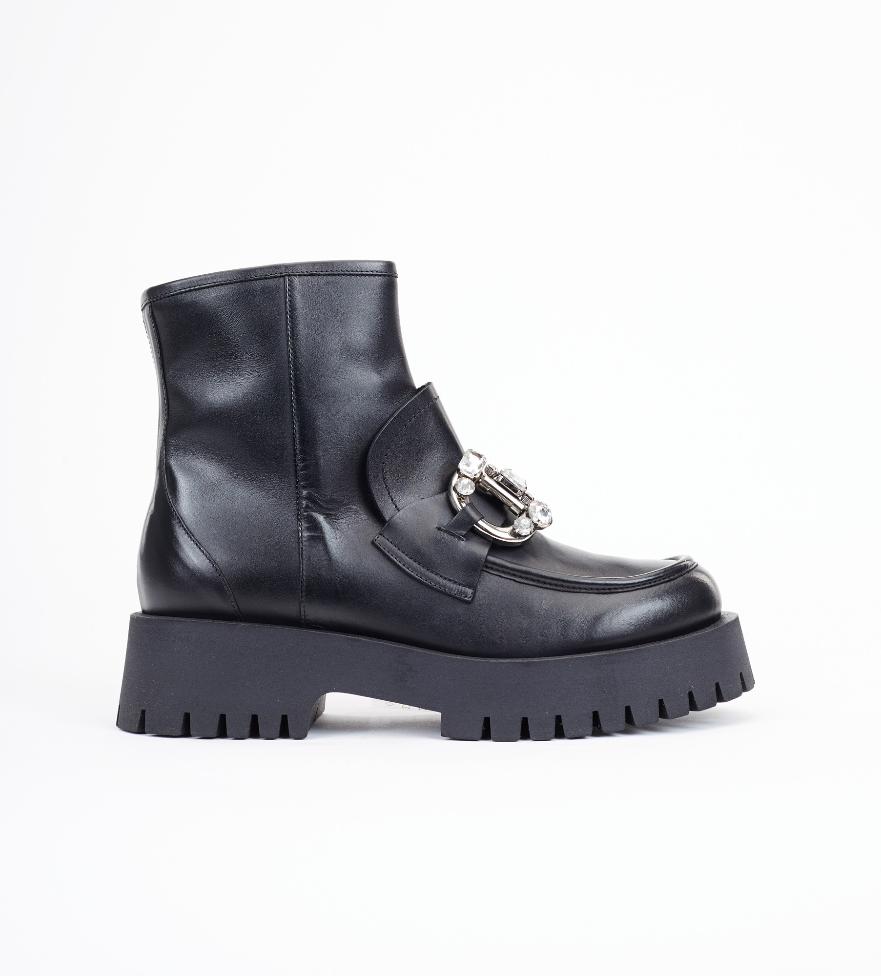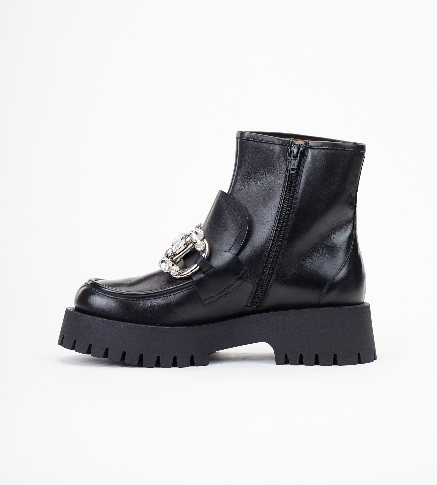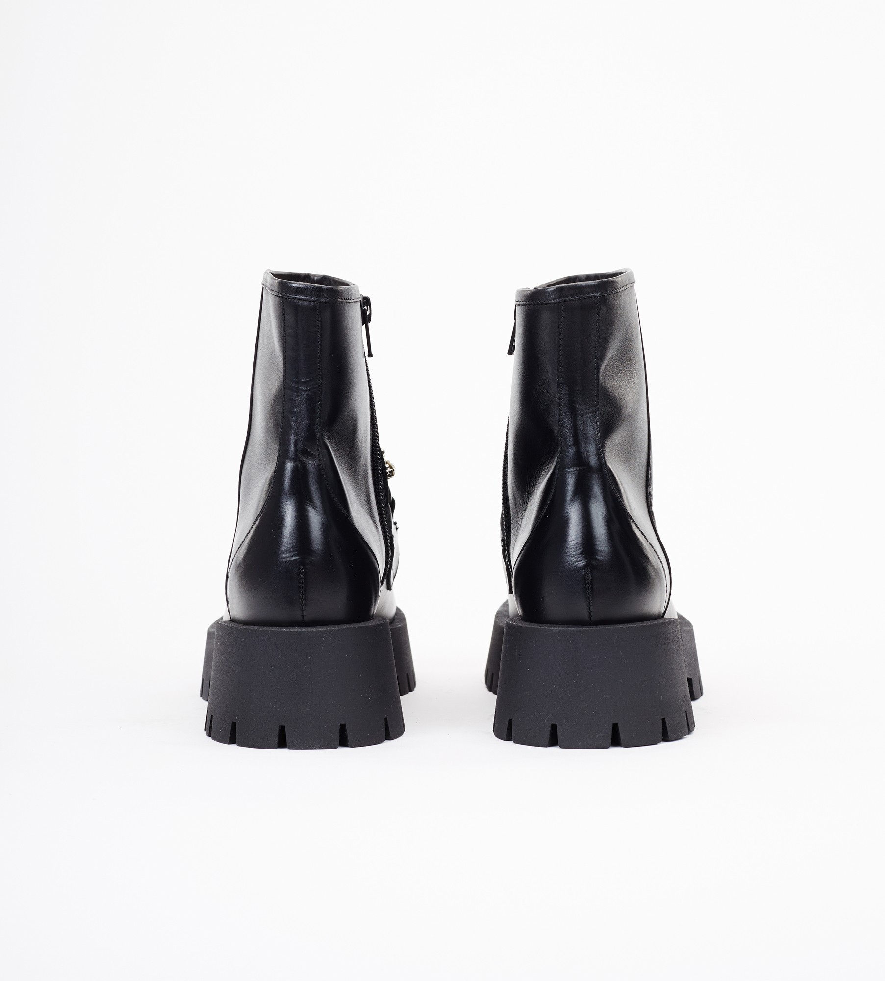 Botki damskie w czarnym kolorze to eleganckie obuwie wykonane z naturalnej skóry cielęcej. Posiadają grubą, ryflowaną podeszwę i srebrną ozdobę na przyszwie, co nadaje im nowoczesny wygląd. Wnętrze oraz wkładka wykonane są z miękkiej skóry jagnięcej, zapewniając komfort noszenia. Obcas ma wysokość 5 cm. Idealne do eleganckich, jak i codziennych stylizacji, te botki łączą w sobie wygodę i styl.