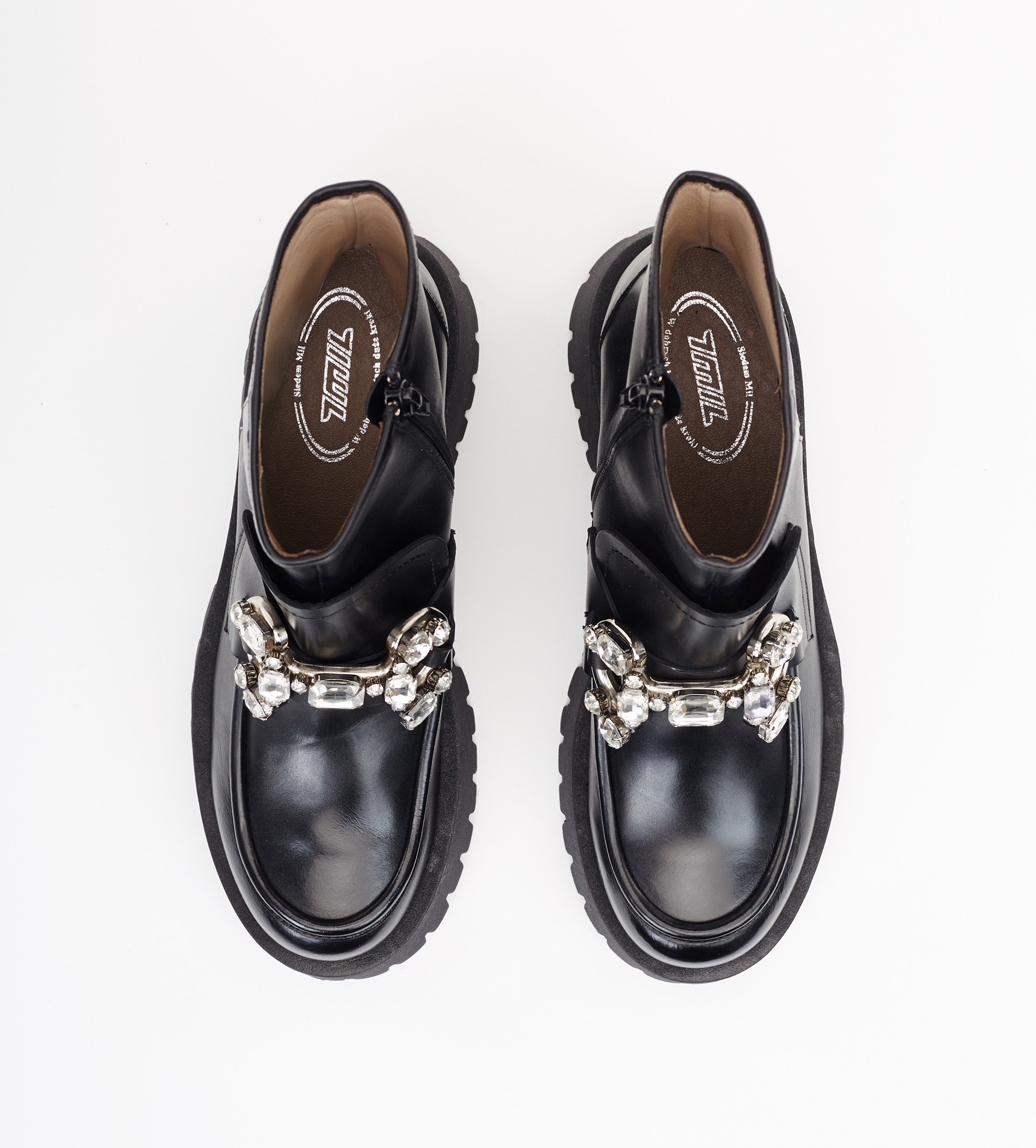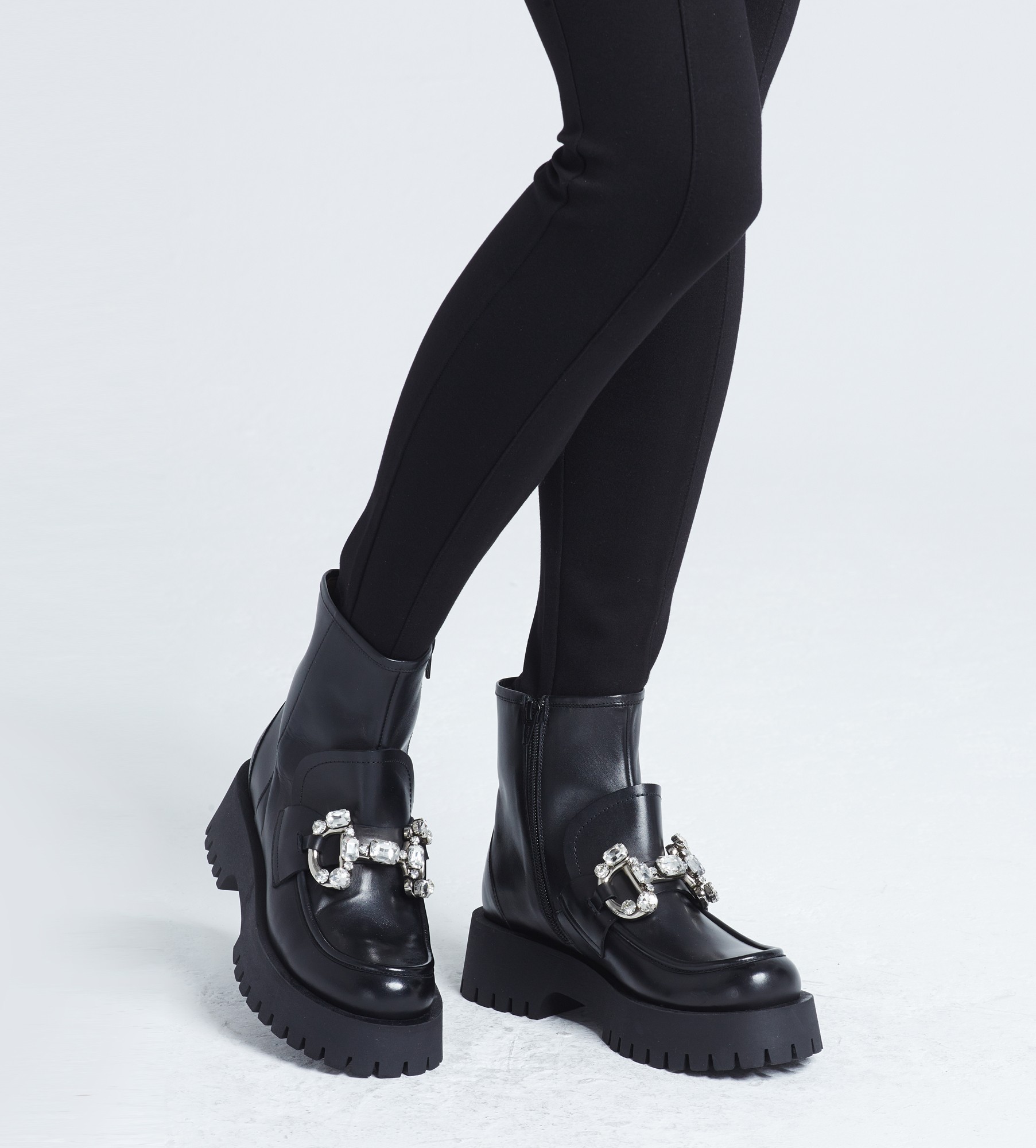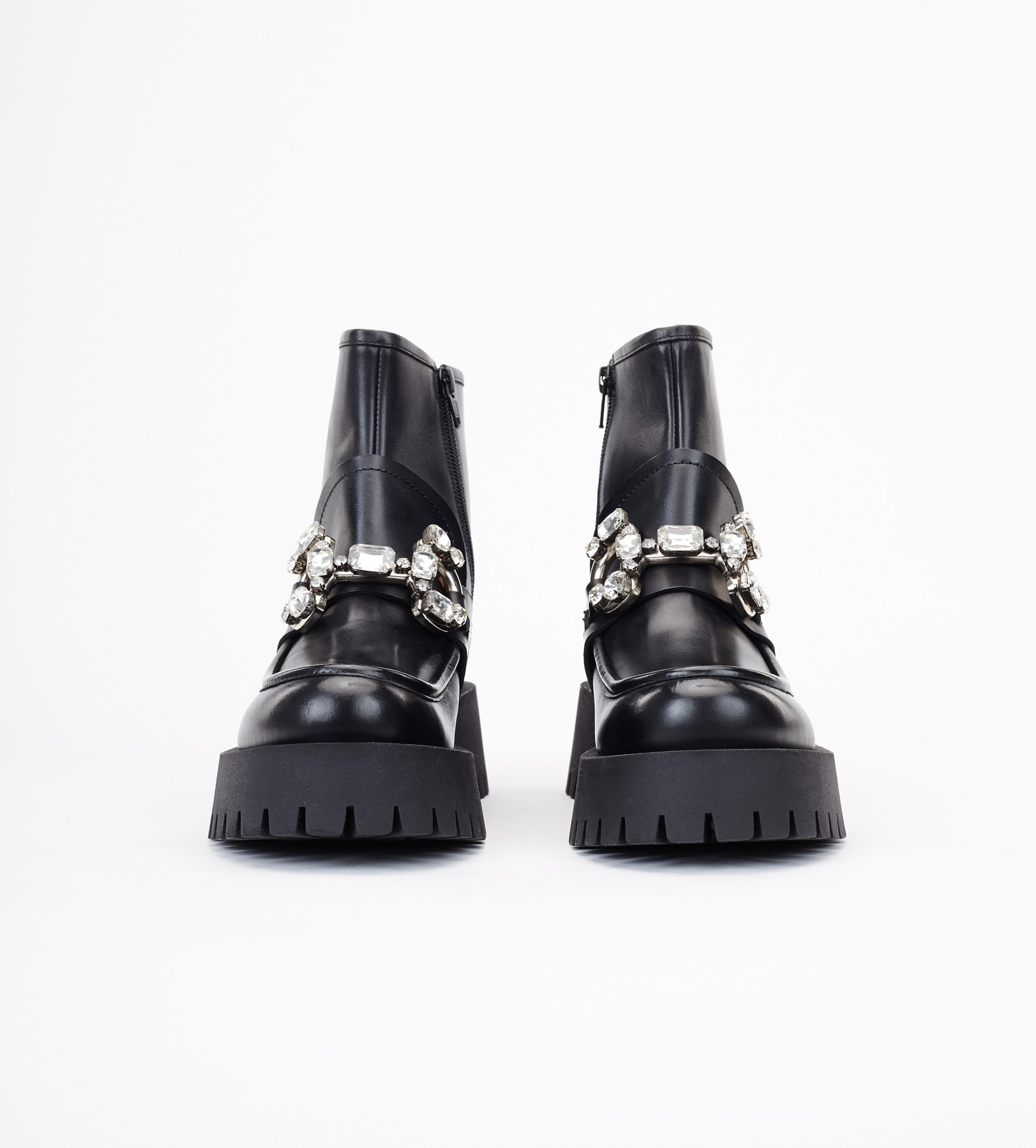 Botki damskie w czarnym kolorze to eleganckie obuwie wykonane z naturalnej skóry cielęcej. Posiadają grubą, ryflowaną podeszwę i srebrną ozdobę na przyszwie, co nadaje im nowoczesny wygląd. Wnętrze oraz wkładka wykonane są z miękkiej skóry jagnięcej, zapewniając komfort noszenia. Obcas ma wysokość 5 cm. Idealne do eleganckich, jak i codziennych stylizacji, te botki łączą w sobie wygodę i styl.