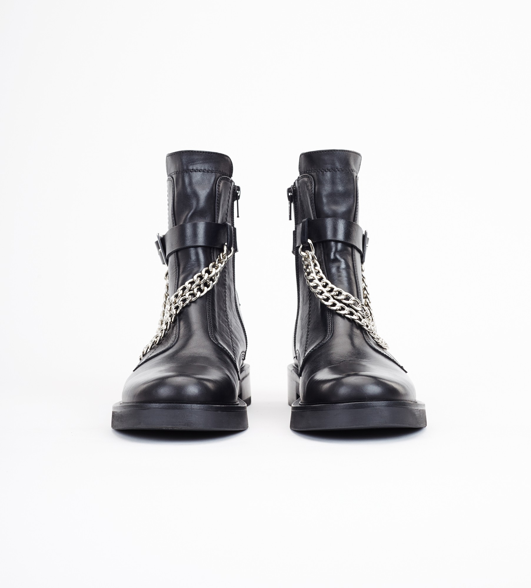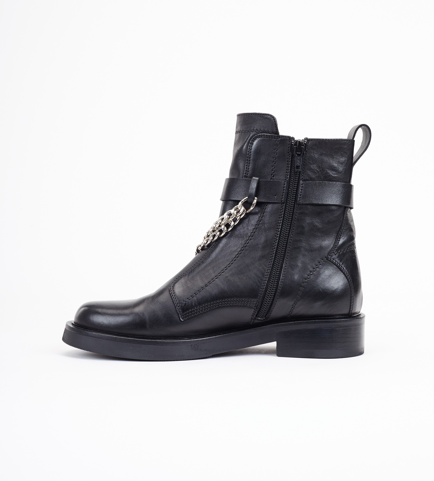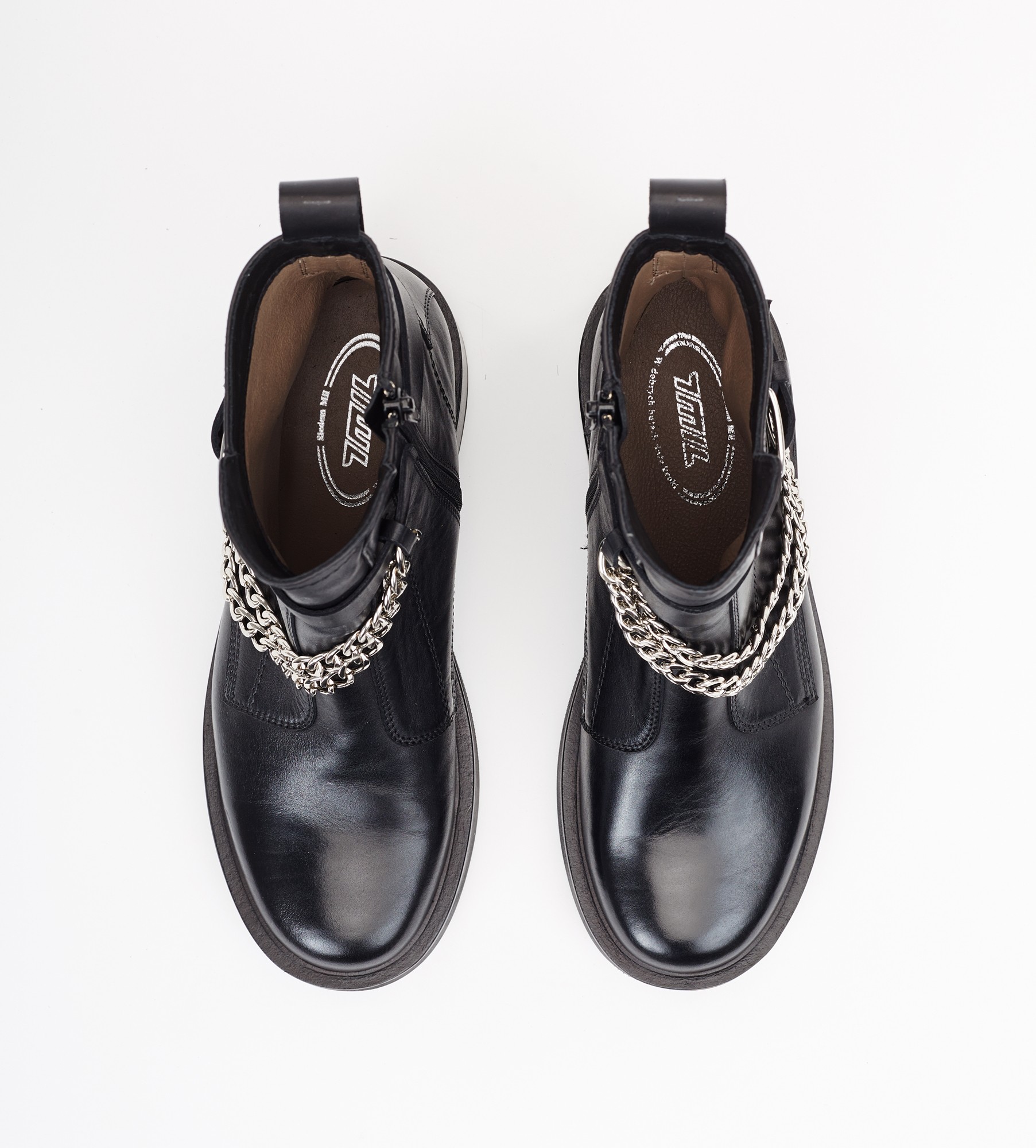 Czarne botki damskie wykonane są z naturalnej skóry cielęcej i ozdobione srebrnym łańcuchem, co dodaje im nowoczesnego charakteru. Wnętrze i wkładka z naturalnej skóry jagnięcej zapewniają wyjątkowy komfort noszenia. Botki mają stabilny obcas o wysokości 3,5 cm, idealne na różne okazje, łącząc elegancję i funkcjonalność.