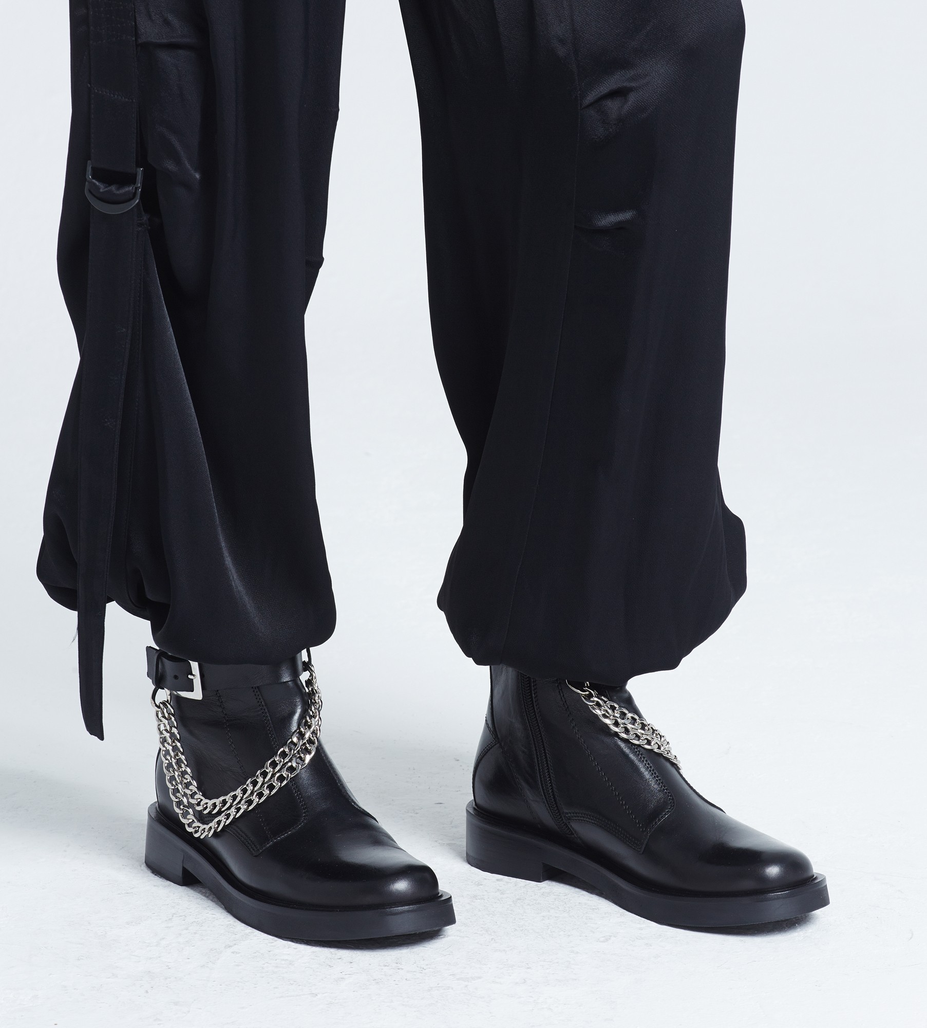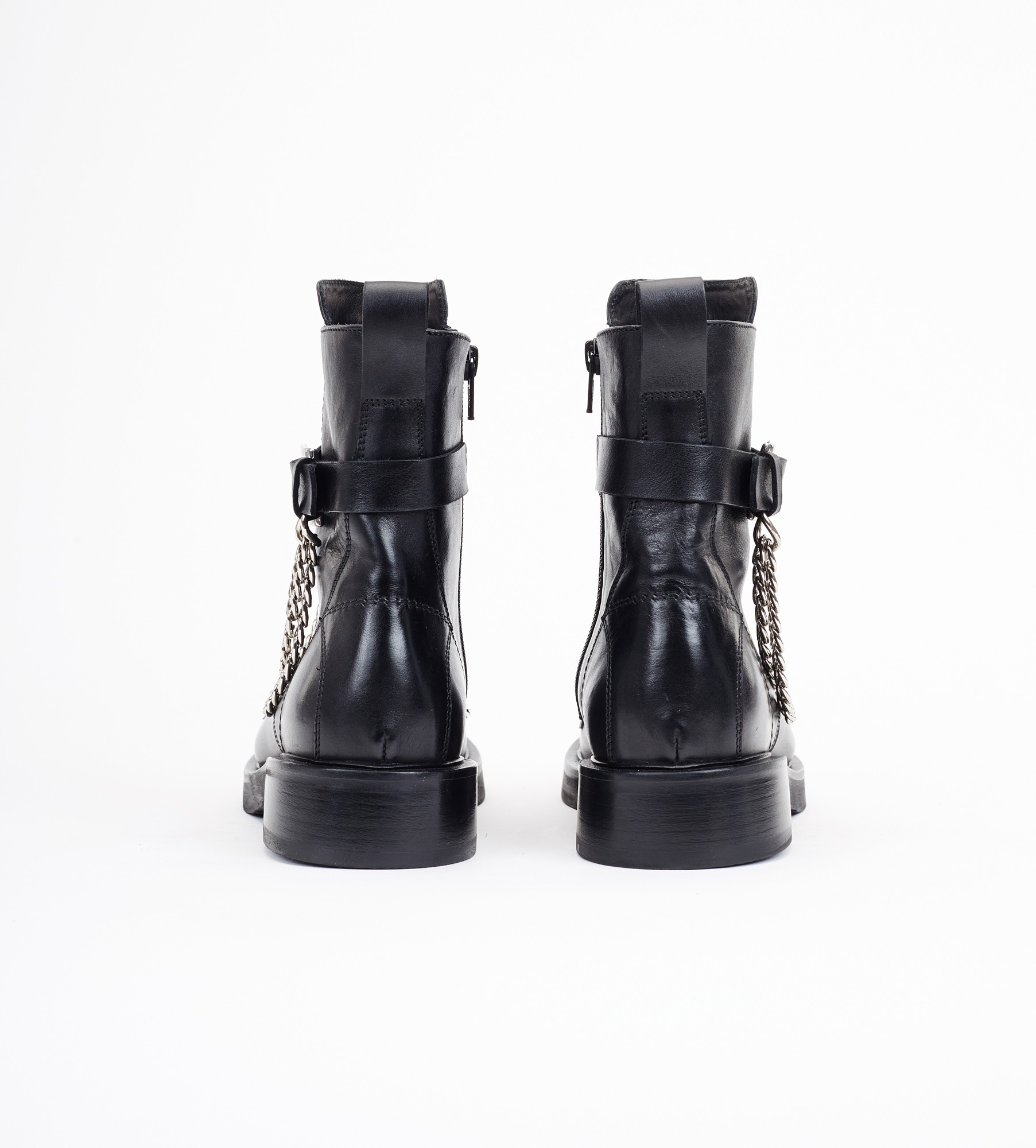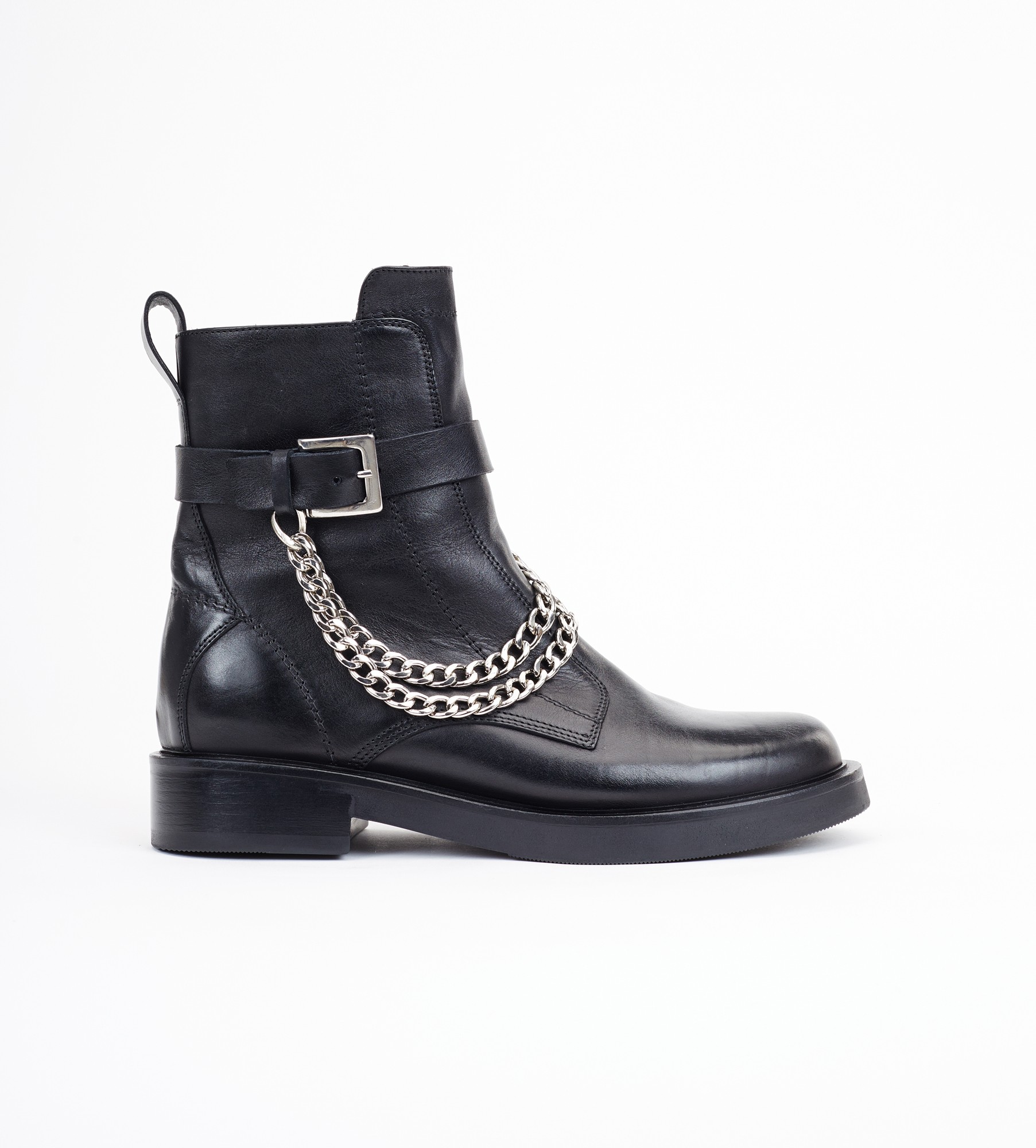 Czarne botki damskie wykonane są z naturalnej skóry cielęcej i ozdobione srebrnym łańcuchem, co dodaje im nowoczesnego charakteru. Wnętrze i wkładka z naturalnej skóry jagnięcej zapewniają wyjątkowy komfort noszenia. Botki mają stabilny obcas o wysokości 3,5 cm, idealne na różne okazje, łącząc elegancję i funkcjonalność.