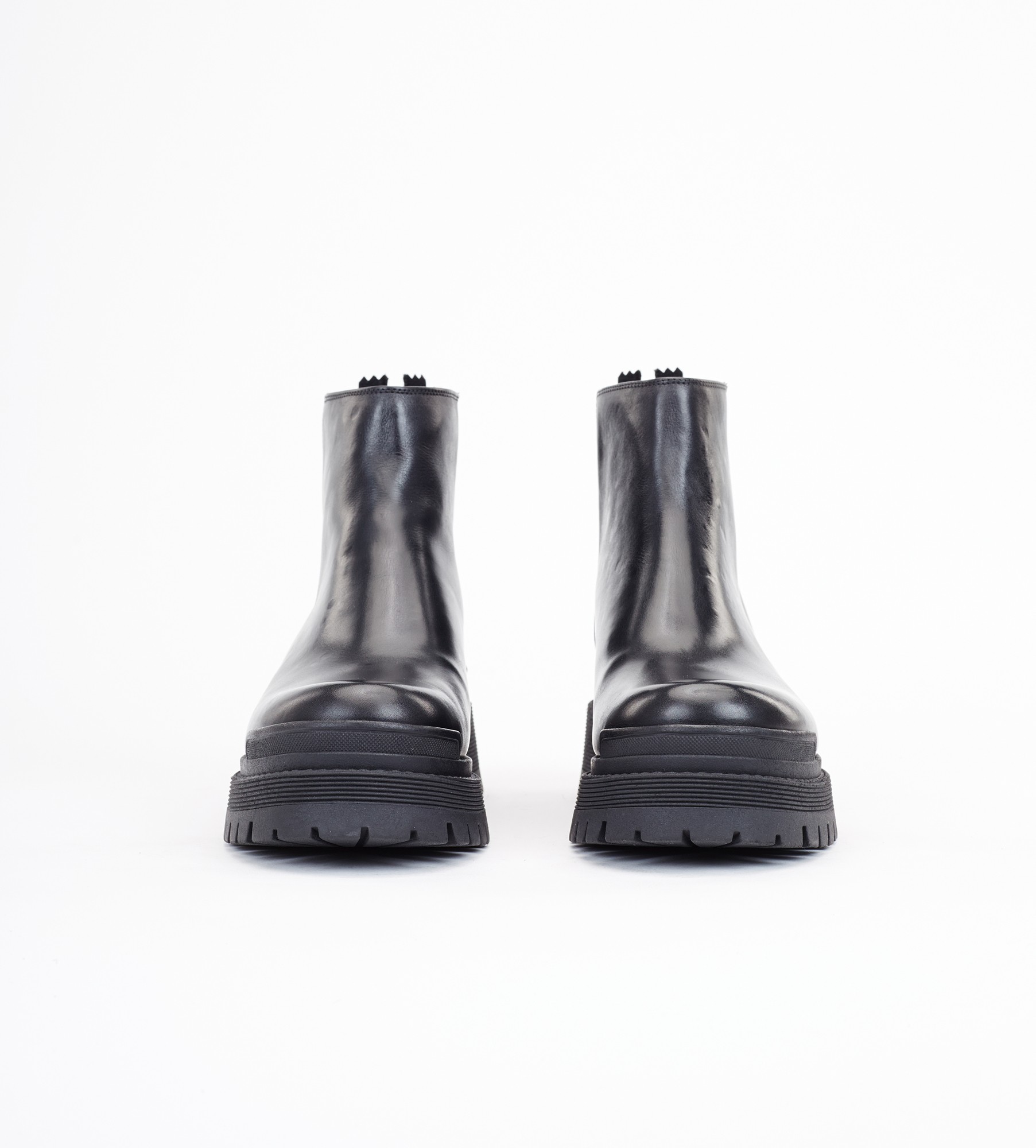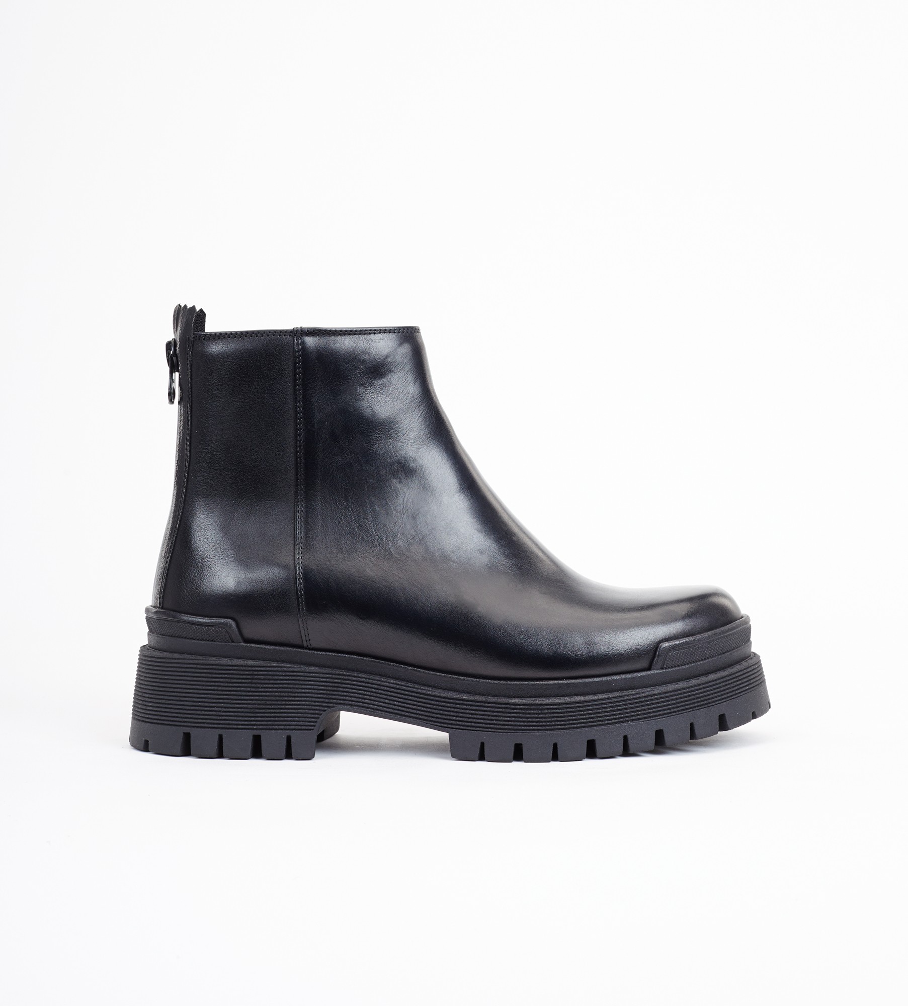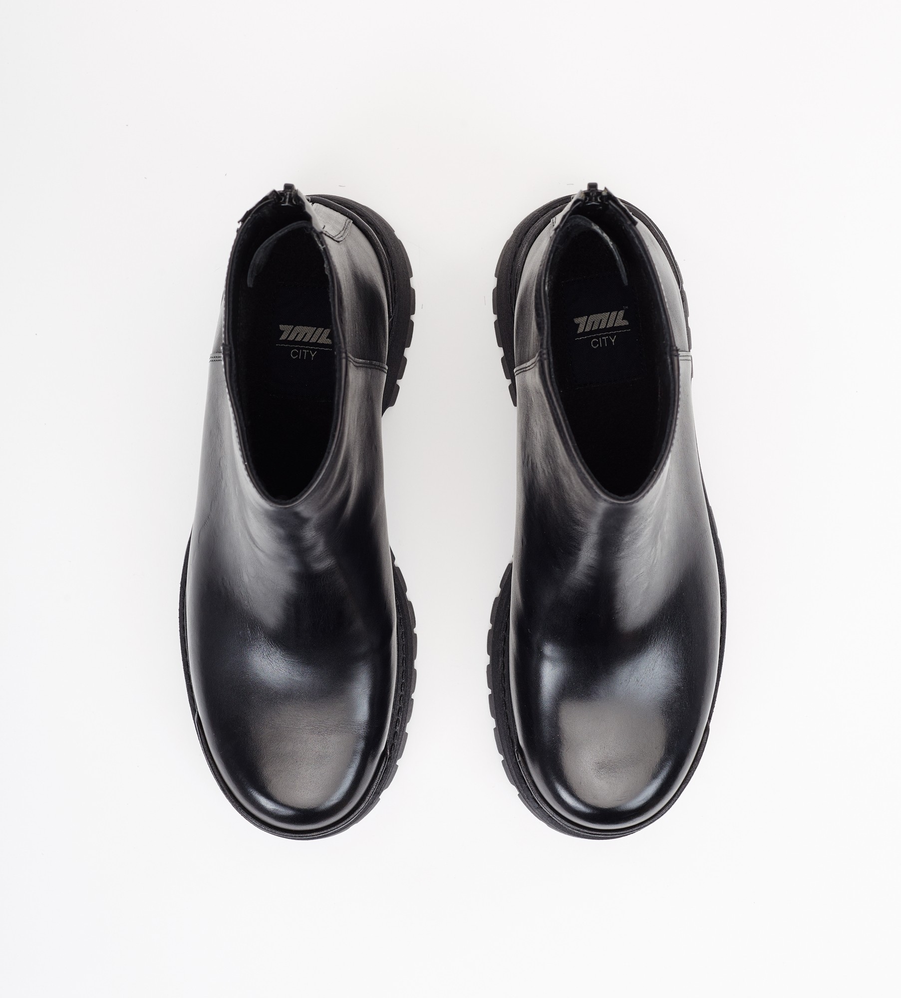 Czarne botki damskie wykonane z wysokiej jakości naturalnej skóry cielęcej, charakteryzują się eleganckim designem z grubą, trwałą podeszwą. Wnętrze i wkładka ocieplone miękkim kocykiem zapewniają komfort i ciepło w chłodniejsze dni. Botki mają stylowy obcas o wysokości 4 cm, Idealne na jesień i zimę, łączą w sobie praktyczność i kobiecy urok, dodając elegancji każdej stylizacji.