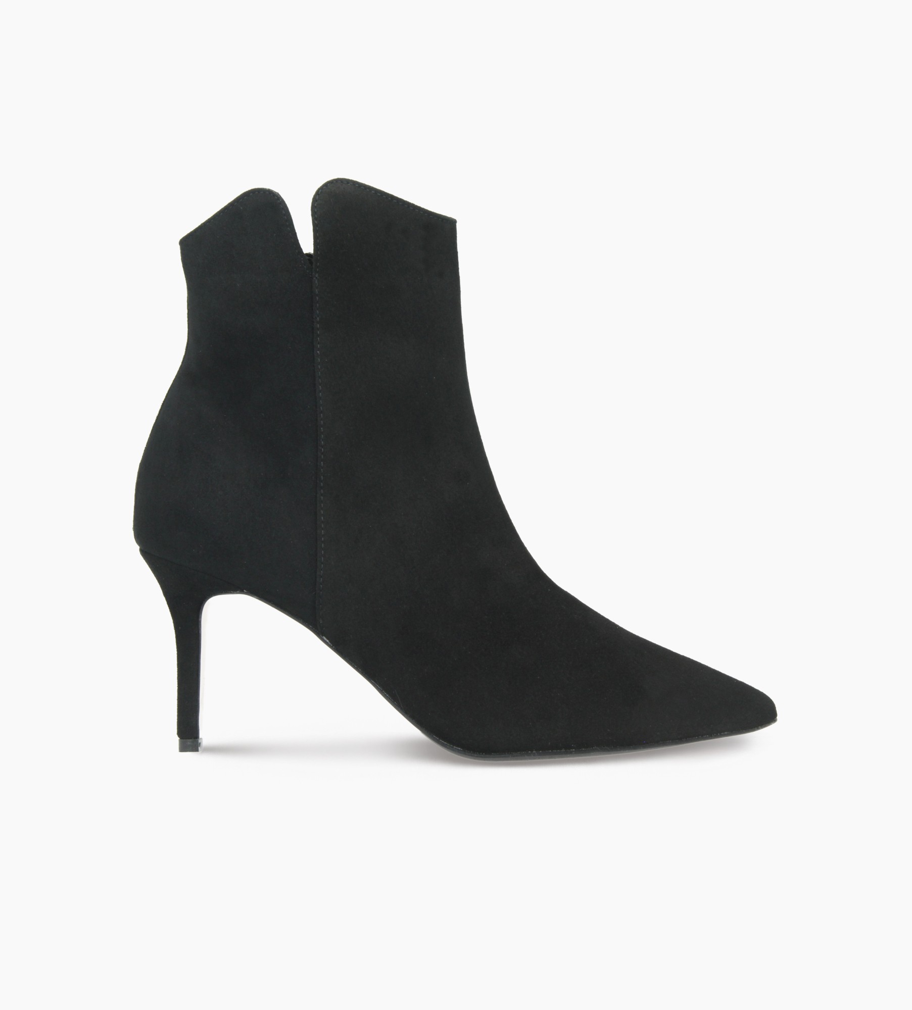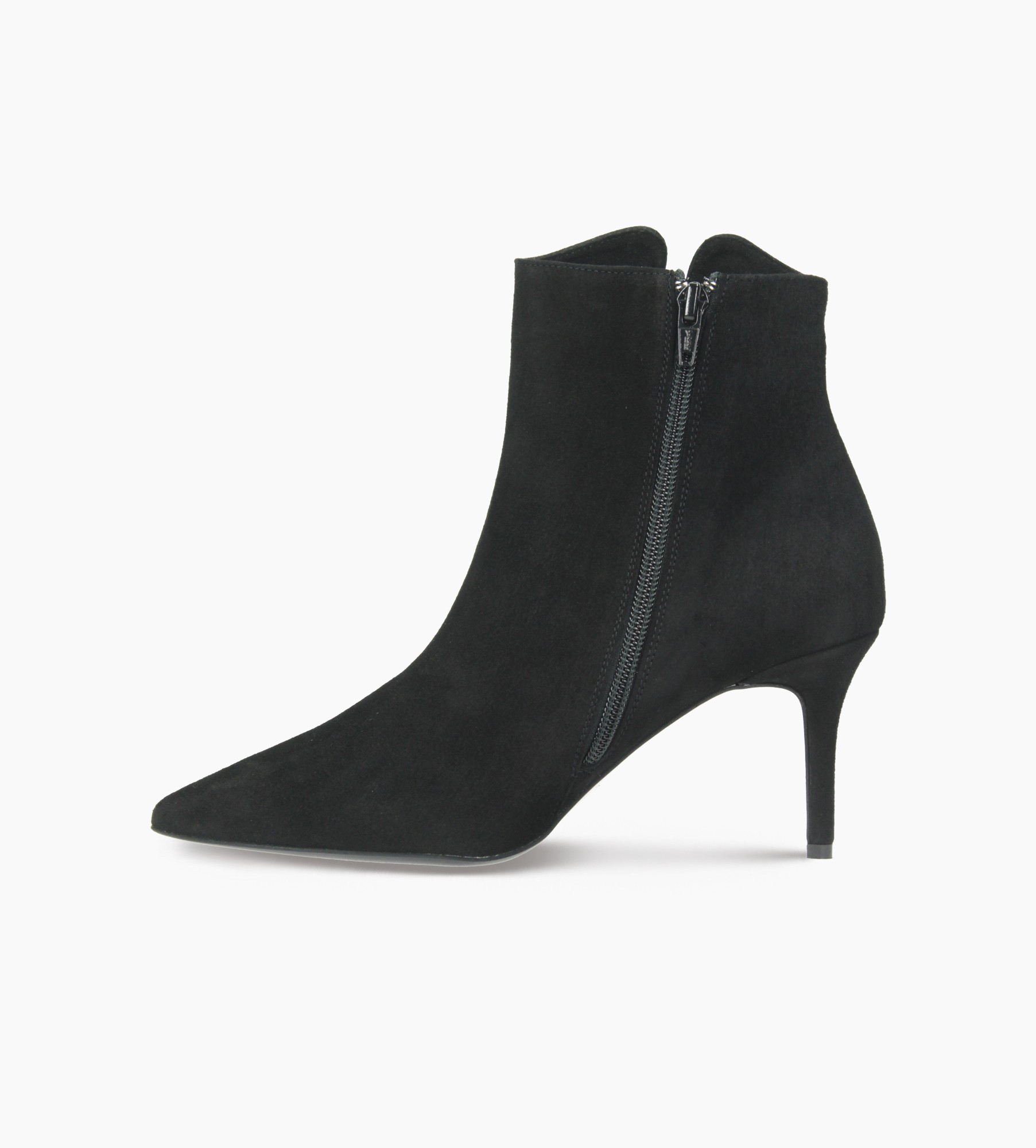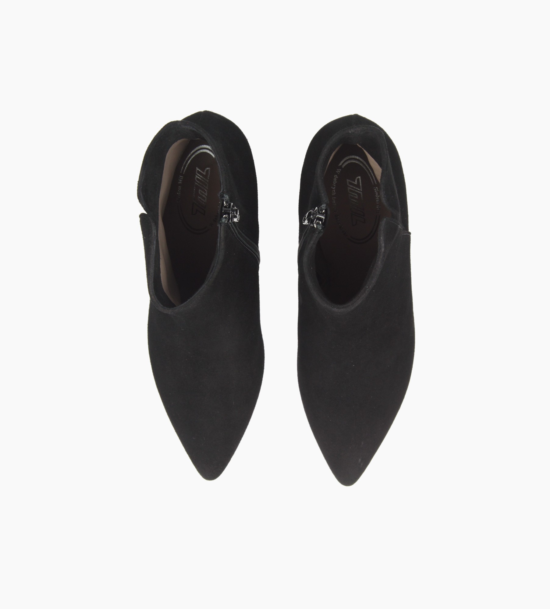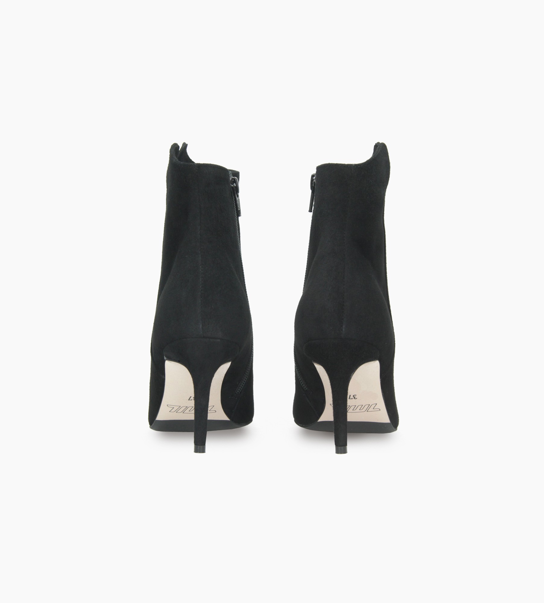 Czarne zamszowe botki damskie to elegancja w nowoczesnym wydaniu. Wykonane z wysokiej jakości zamszu, charakteryzują się głębokim, klasycznym odcieniem czerni, który doskonale uzupełnia różnorodne stylizacje. Smukły obcas dodaje sylwetce gracji, jednocześnie zapewniając komfort noszenia. Zapięcie na suwak ułatwia zakładanie, a delikatne wykończenia podkreślają ich wyrafinowany charakter. Idealne na chłodniejsze dni, botki te łączą funkcjonalność z niepowtarzalnym stylem.