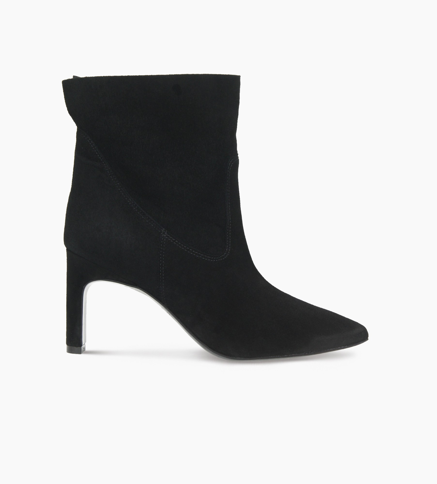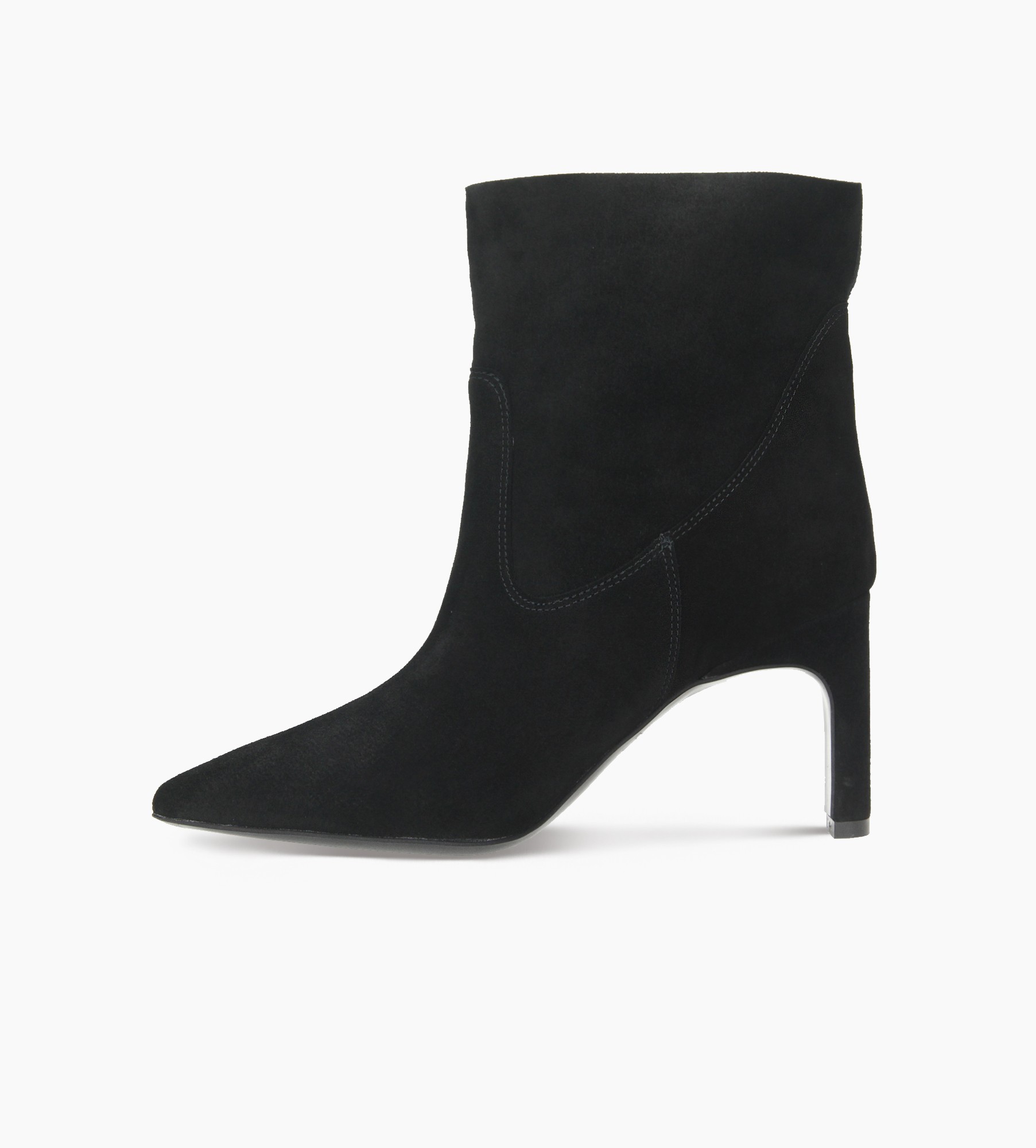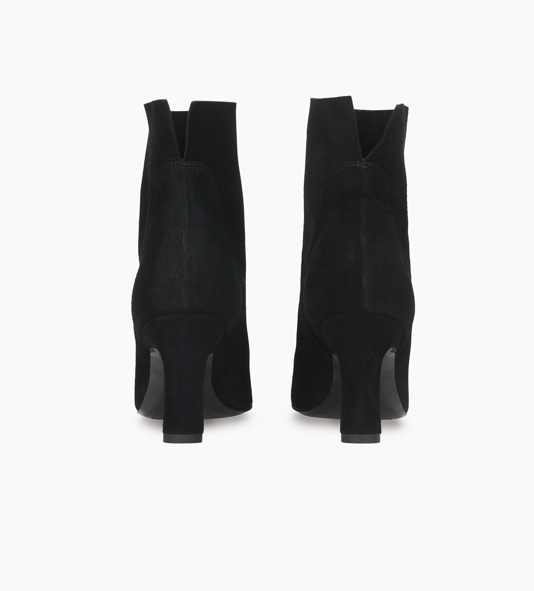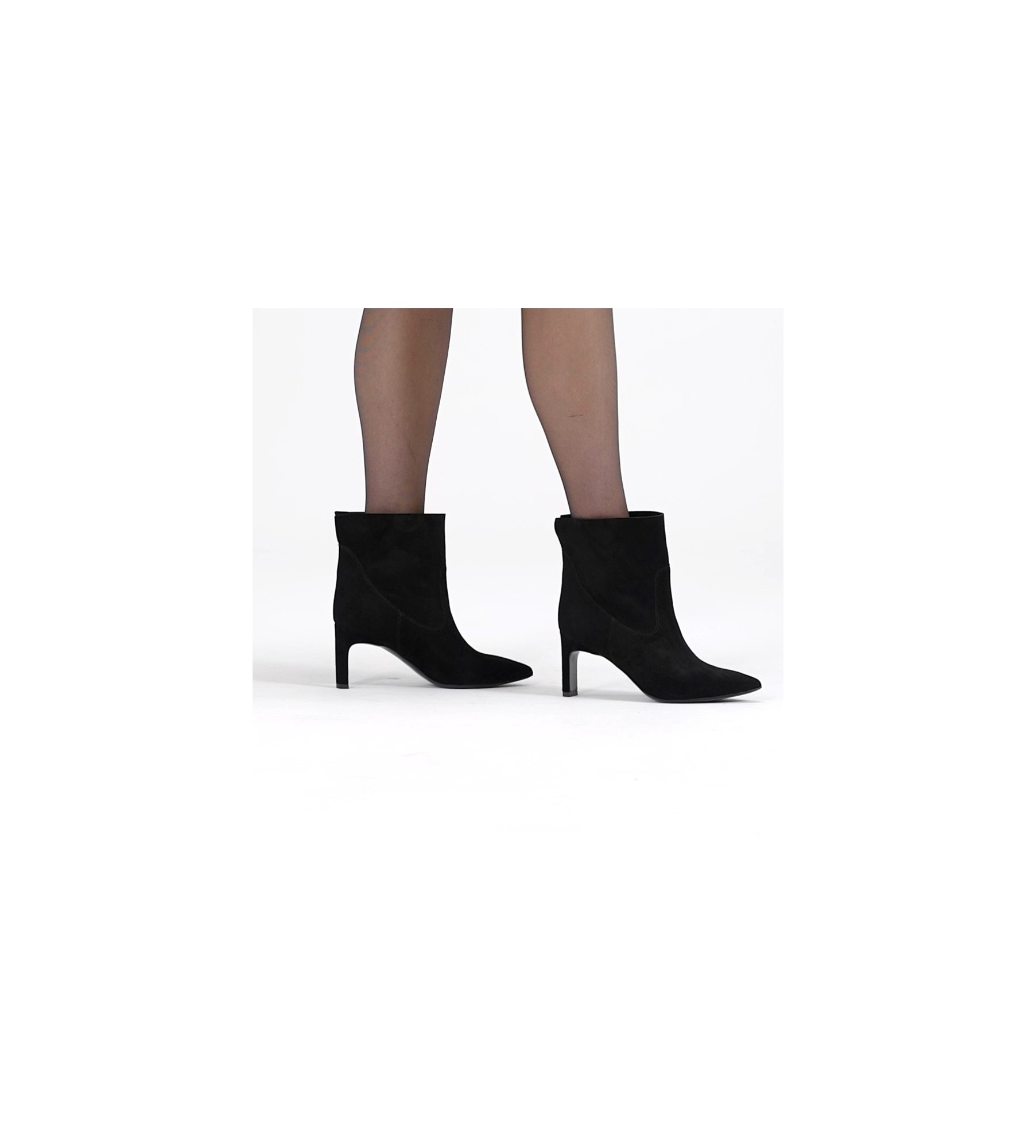 Czarne zamszowe botki damskie to elegancki model wsuwany, idealny na chłodniejsze dni. Wnętrze wykonane jest z miękkiej skóry jagnięcej, co zapewnia niezwykły komfort noszenia i ciepło. Zamszowa cholewka dodaje im klasy i wyrafinowanego wyglądu, a brak zapięć sprawia, że są łatwe do zakładania. Te botki są doskonałym wyborem dla kobiet ceniących styl i wygodę w codziennych stylizacjach.