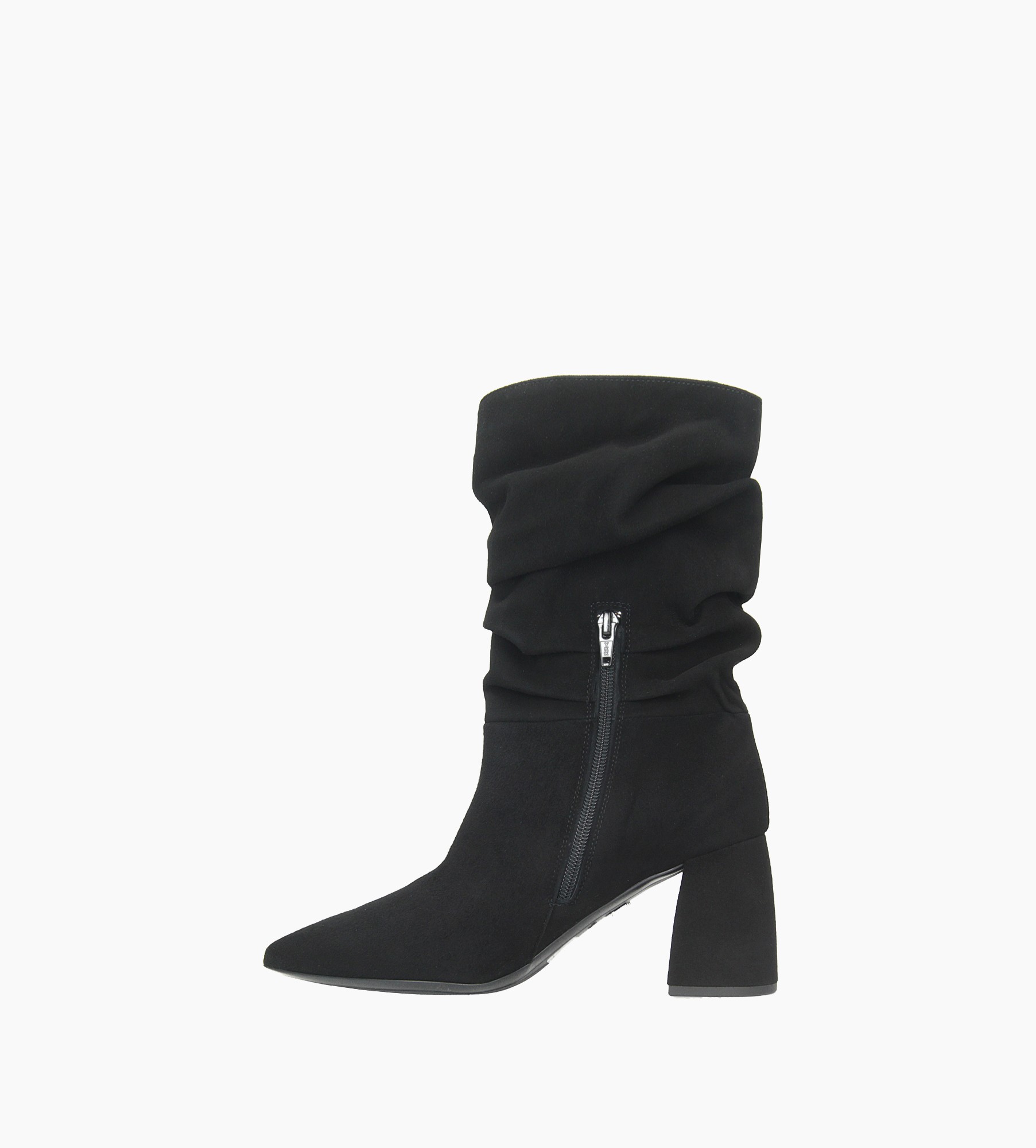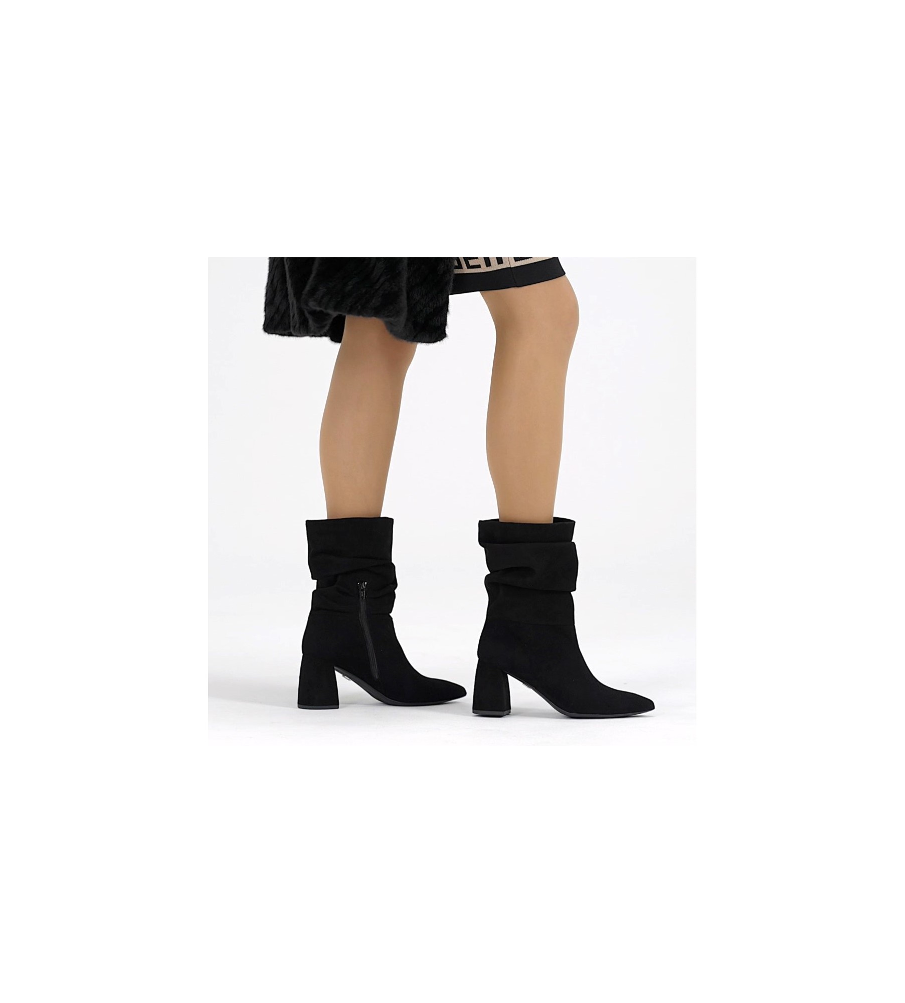 Czarne zamszowe botki damskie wyróżniają się modnym i stylowym designem, z marszczoną cholewką, która dodaje im stylowego charakteru. Zapinane na wygodny suwak, są praktyczne i łatwe do zakładania. Stabilny obcas zapewnia komfort noszenia przez cały dzień, a modny, spiczasty czubek podkreśla elegancję tego modelu. Te botki to idealny wybór dla kobiet ceniących połączenie nowoczesnego stylu i wygody, doskonale pasujące zarówno do casualowych, jak i bardziej formalnych stylizacji.