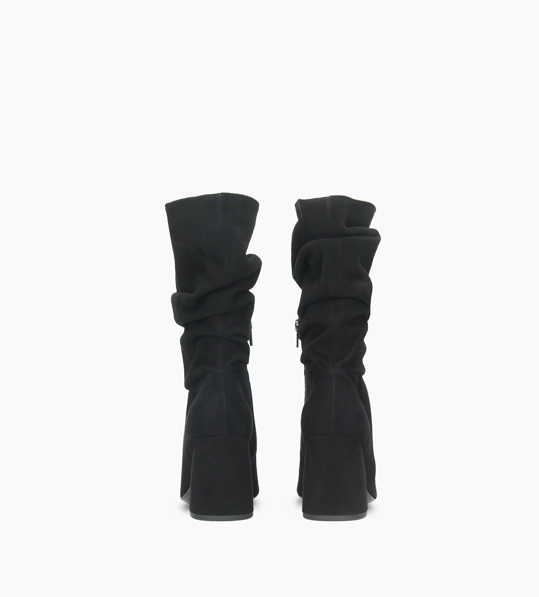 Połącz czarne zamszowe botki z marszczoną cholewką z ołówkową spódnicą midi w kolorze głębokiego bordo oraz dopasowanym, czarnym golfem. Na ramiona zarzuć elegancki płaszcz w kolorze camel, a całość uzupełnij torebką na łańcuszku i delikatną złotą biżuterią.