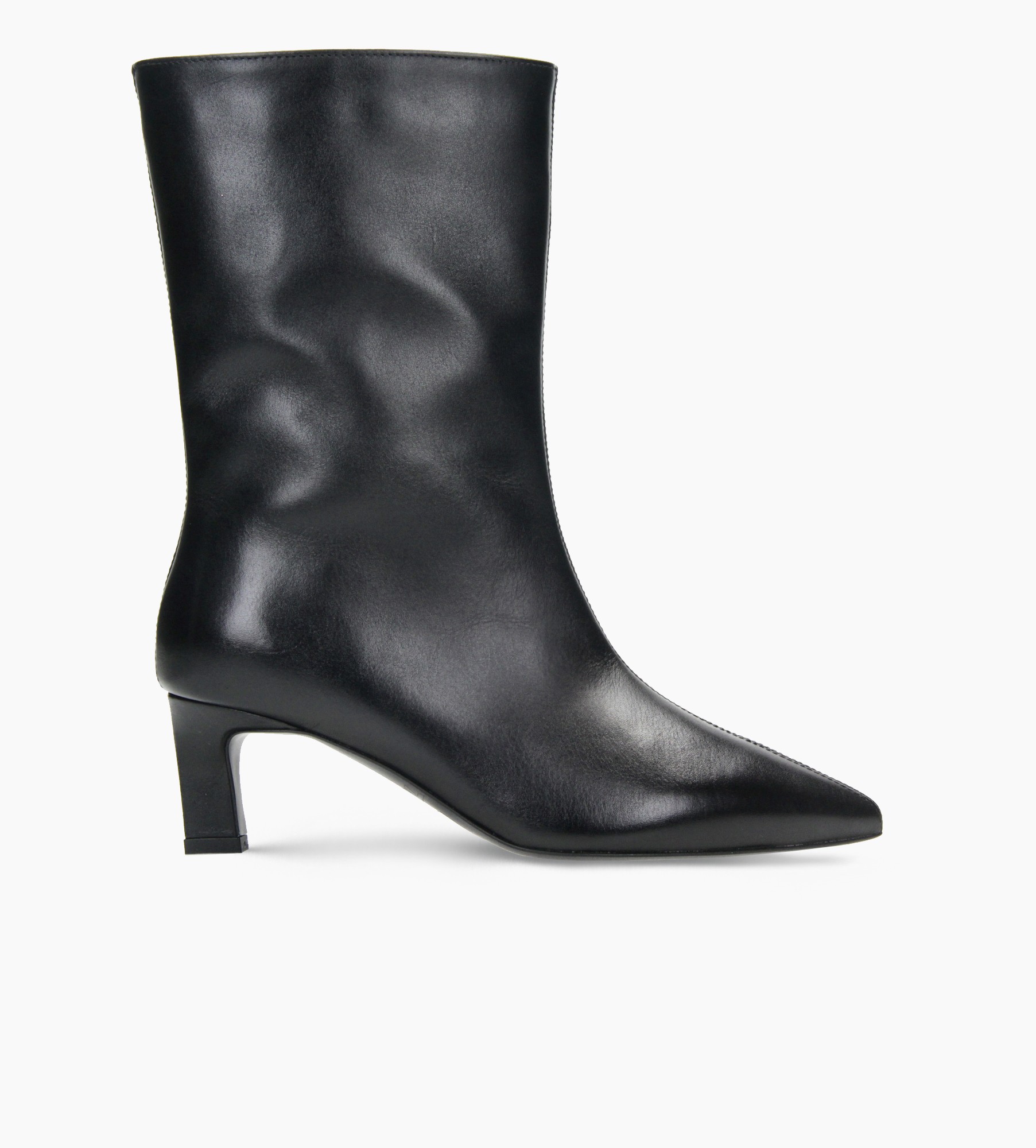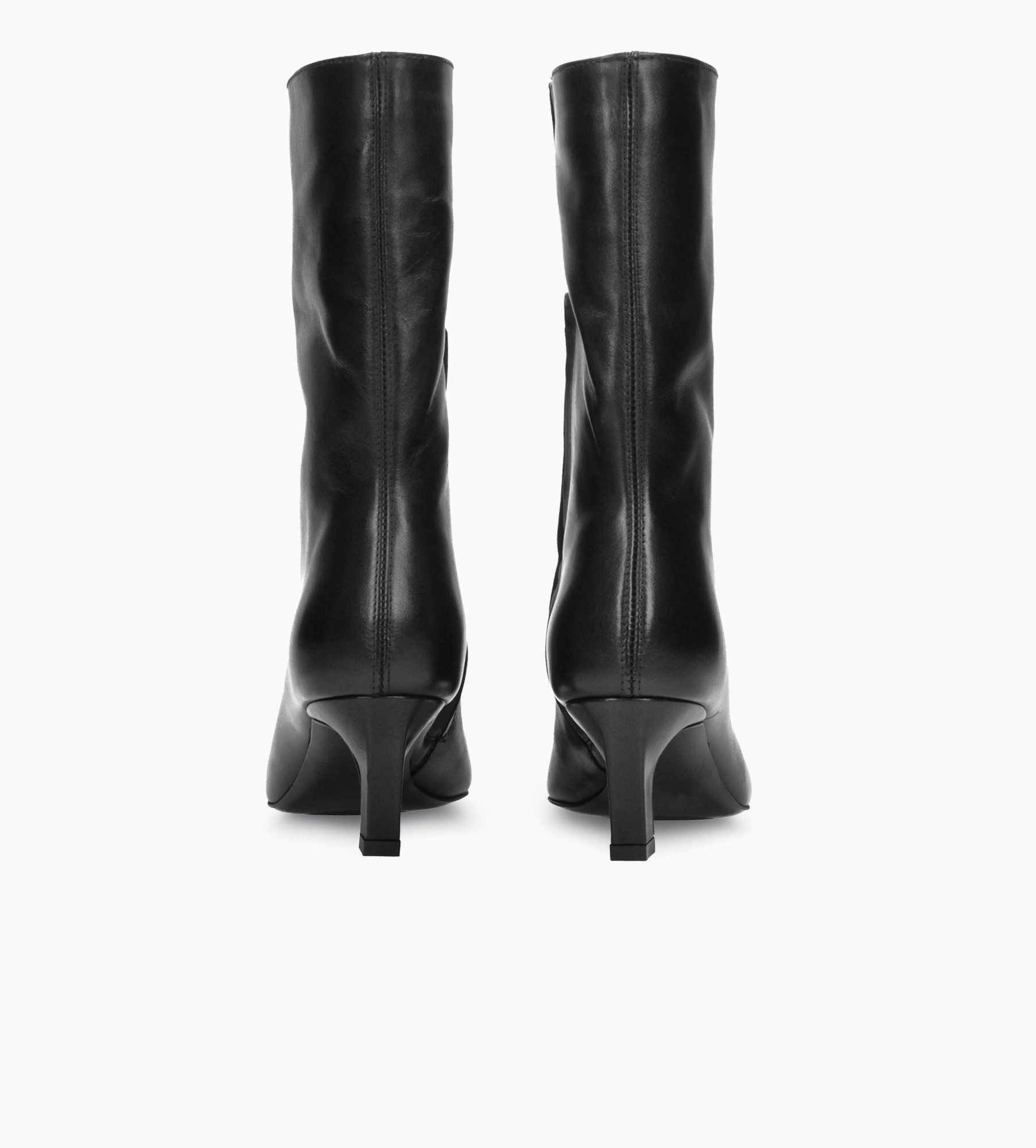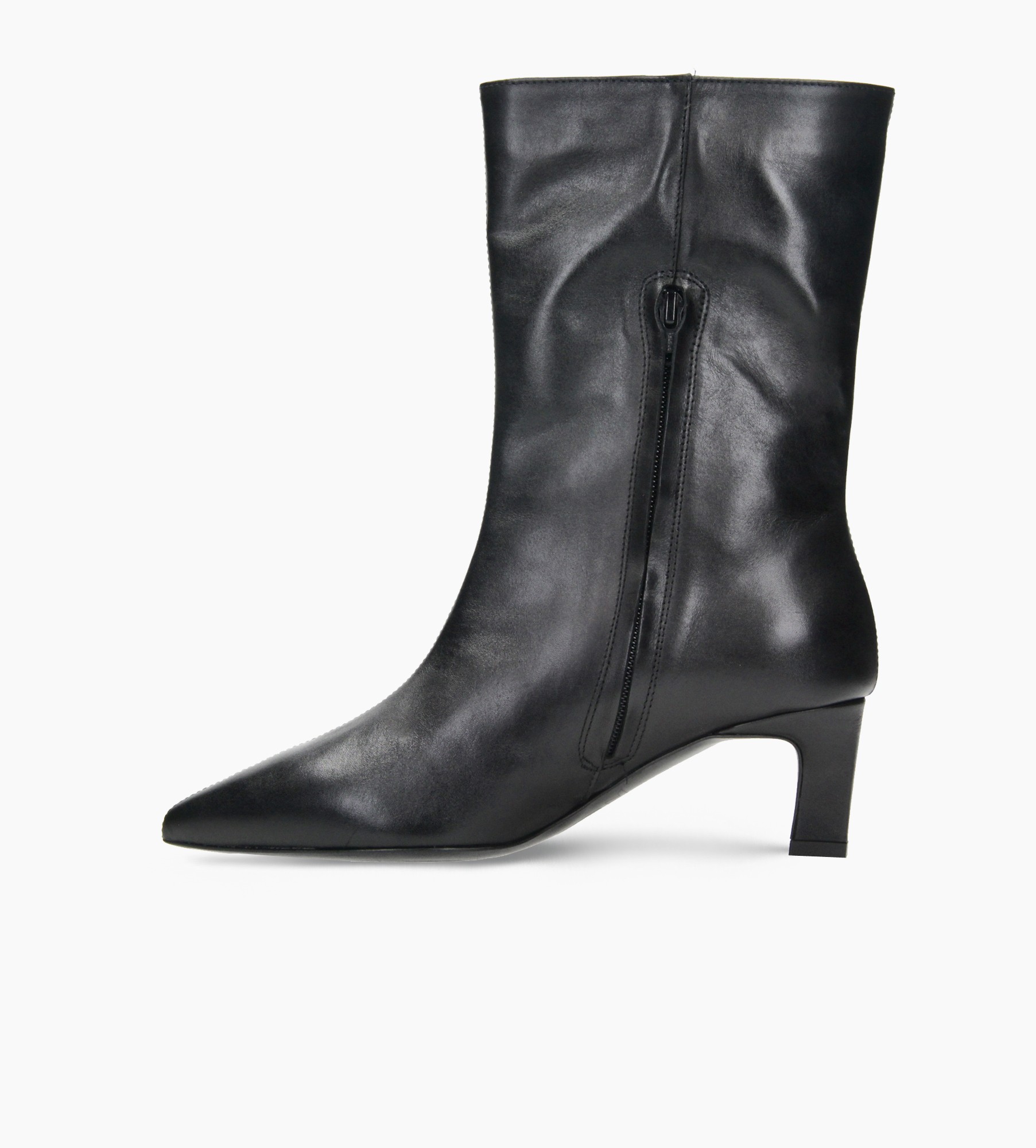 Te botki to kwintesencja współczesnego minimalizmu i ponadczasowej klasy. Wykonane z wysokogatunkowej skóry cielęcej, zachwycają gładką linią, subtelnym połyskiem oraz idealnie wyprofilowaną cholewką o nieco wyższej długości. Model zapinany z boku na suwak, osadzony na niewysokim, modnym obcasie typu „kaczuszka”, zapewnia wyjątkową wygodę i optyczne wysmuklenie sylwetki. Smukły, lekko szpiczasty nosek nadaje butom elegancki charakter, który doskonale sprawdzi się zarówno w dziennych, jak i wieczorowych stylizacjach. To uniwersalna para, która łączy kobiecość, komfort i nowoczesną estetykę.