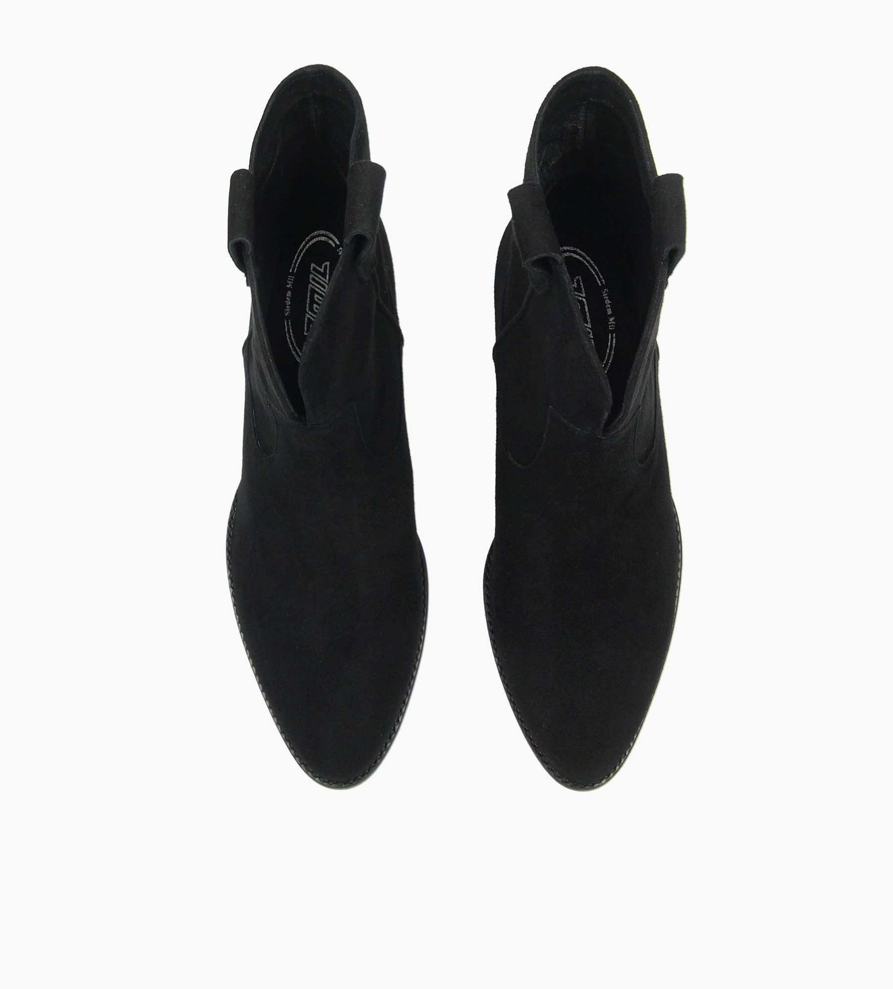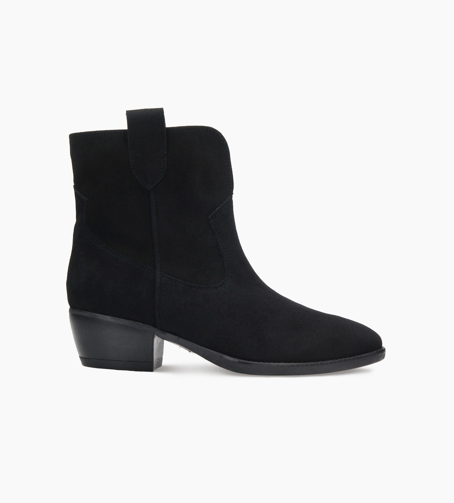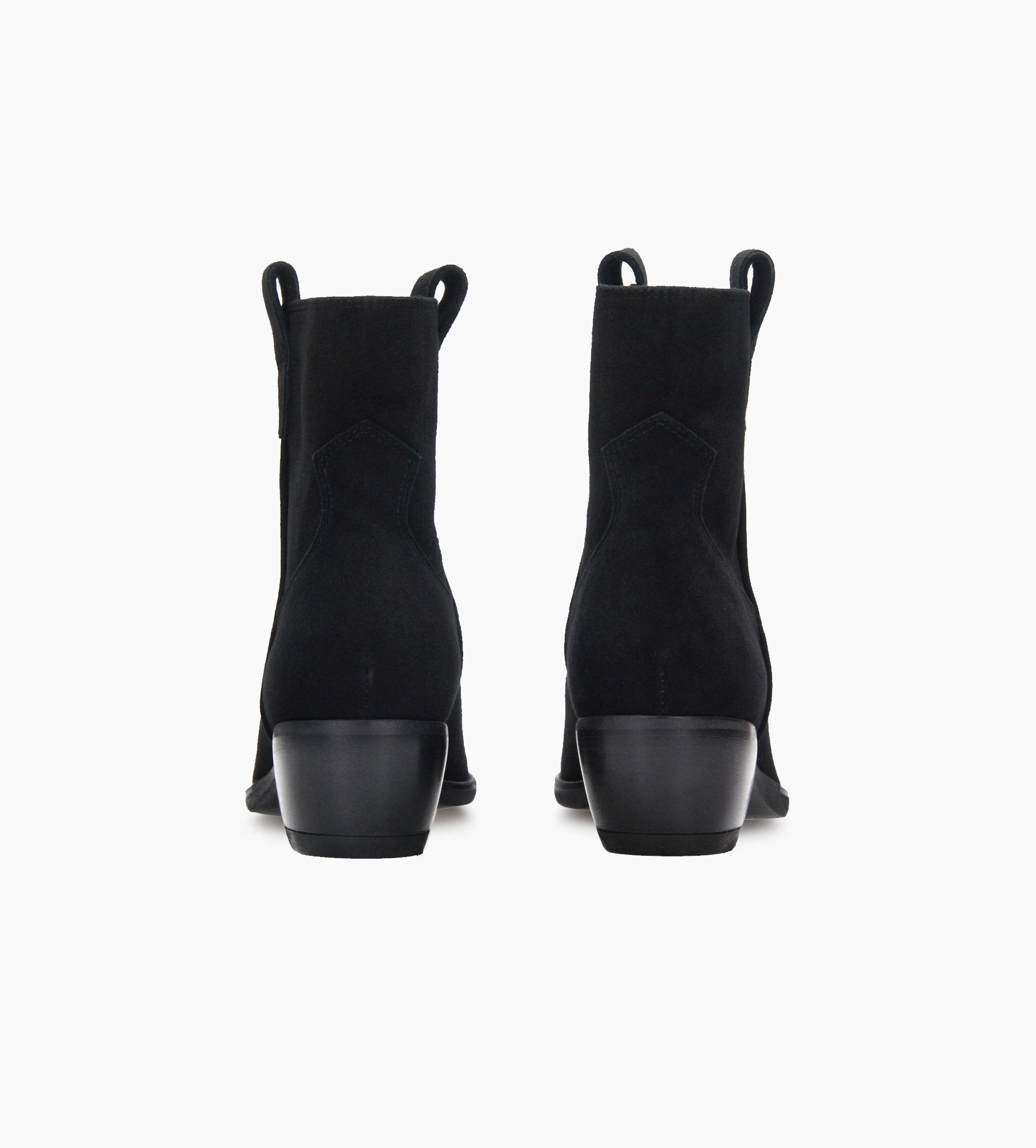 Styl kowbojski w pełnym elegancji wydaniu – czarne zamszowe botki damskie na stabilnym klockowatym obcasie to propozycja dla kobiet, które cenią styl, wygodę i niezależność. Wsuwany model o wyraźnie zarysowanej, lecz subtelnej cholewce, wzbogacony został charakterystycznymi bocznymi „paskami” ułatwiającymi zakładanie, które jednocześnie dodają nieco surowego charakteru. Naturalna skóra zamszowa o głębokiej czerni pięknie komponuje się z jesiennymi i zimowymi stylizacjami – od codziennego casualu po klasyczny minimalizm.