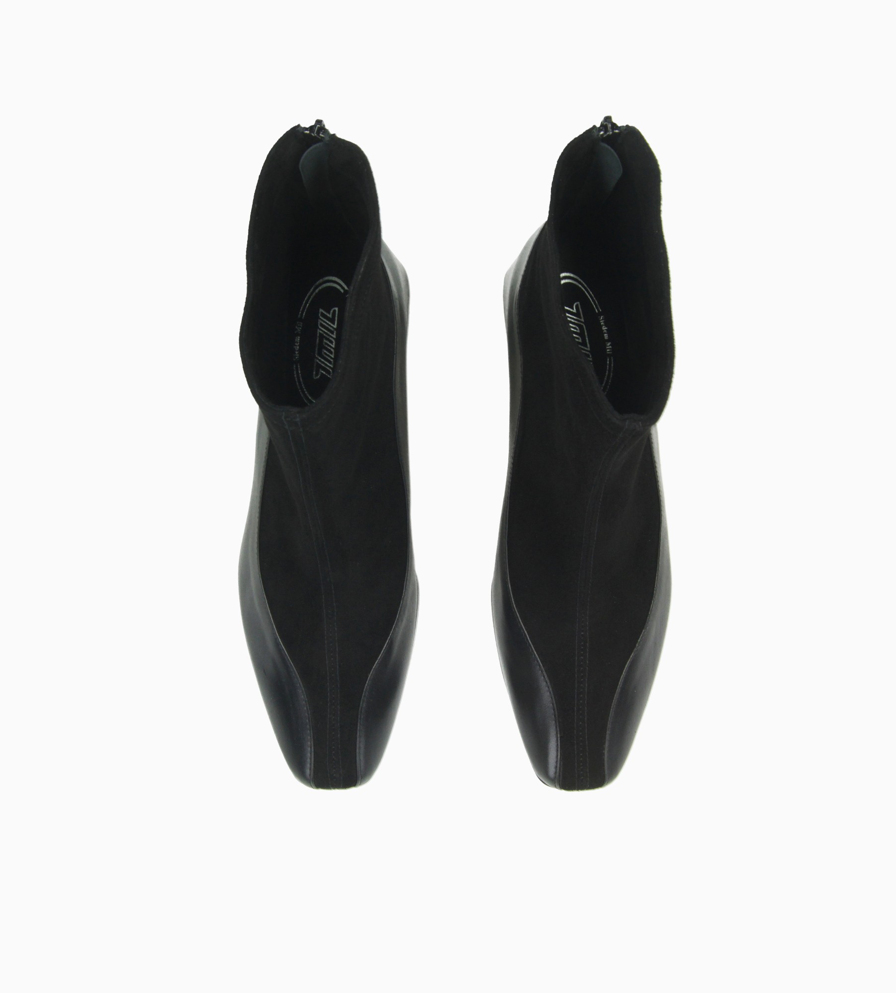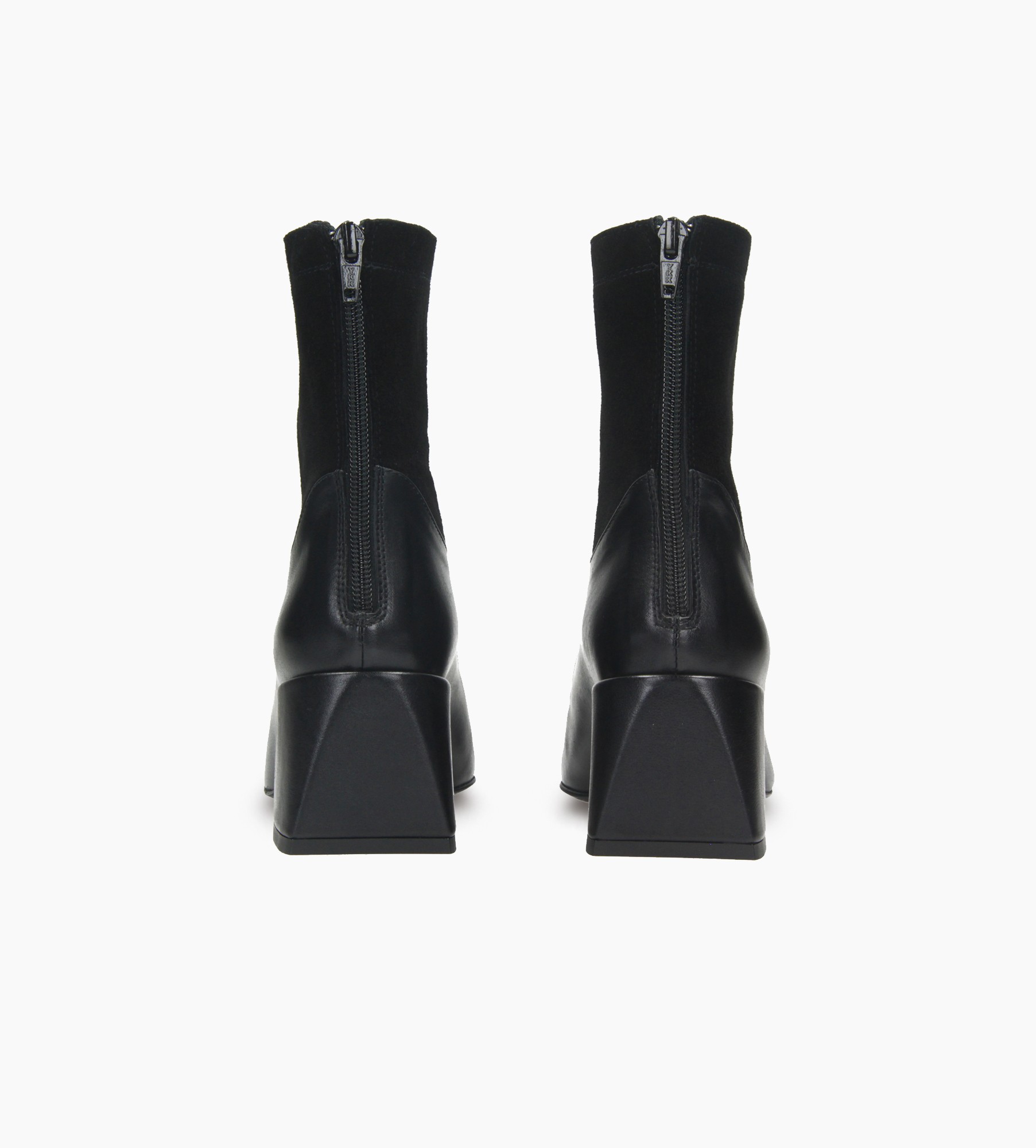 Eleganckie czarne botki wykonane z wysokiej jakości naturalnej skóry cielęcej połączonej z miękkim zamszem to kwintesencja jesienno-zimowego stylu. Stabilny, szeroki obcas o komfortowej wysokości zapewnia wygodę na co dzień, a jednocześnie dodaje sylwetce elegancji. Z tyłu umieszczono praktyczny suwak, który ułatwia zakładanie, a szersza cholewka sięgająca ponad kostkę pozwala na swobodne dopasowanie do różnych typów nóg. Dyskretne przeszycia i płynne linie łączenia materiałów dodają nowoczesnego charakteru i subtelnej kobiecości.