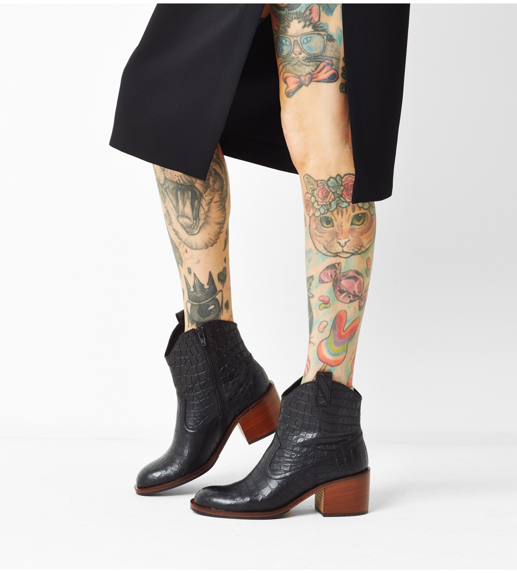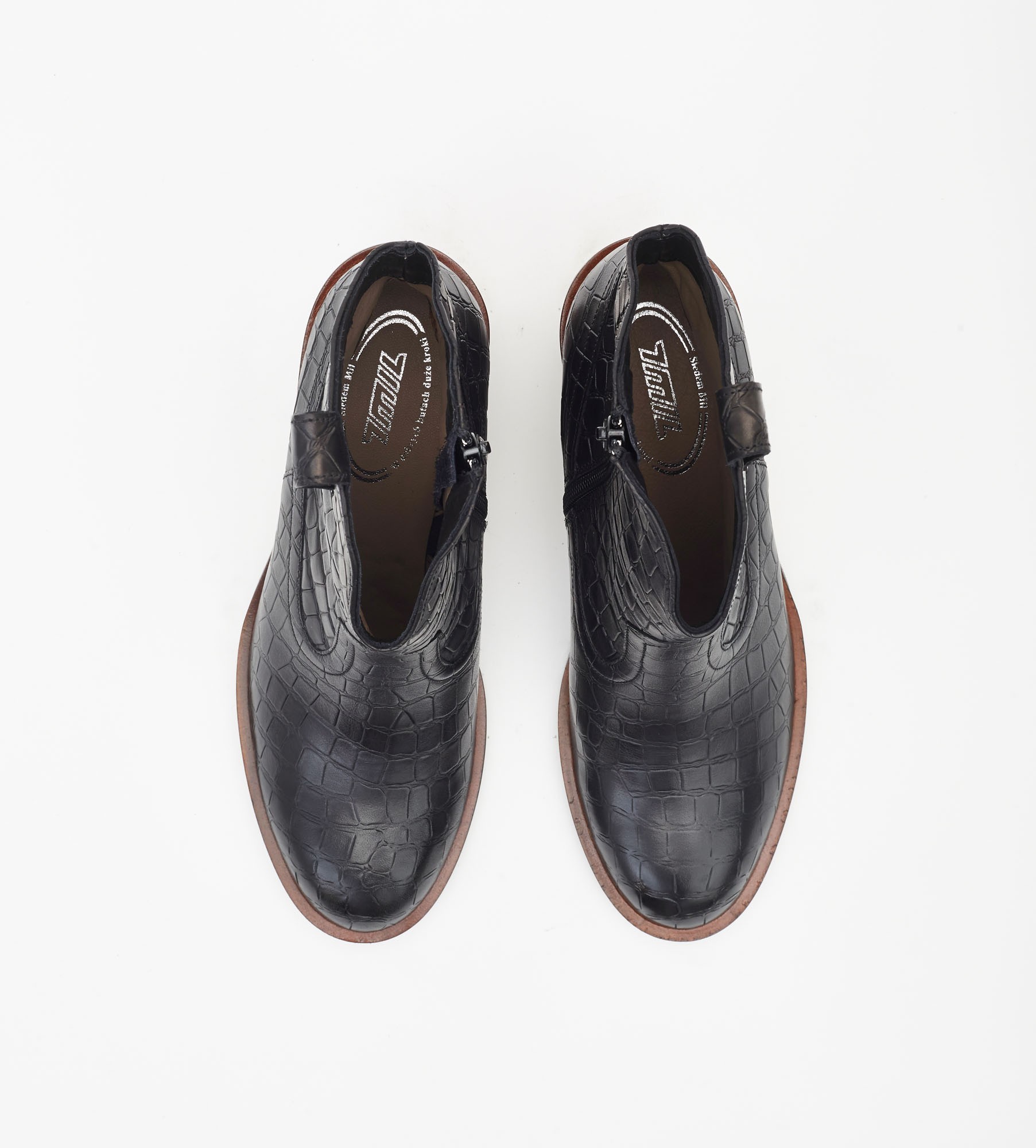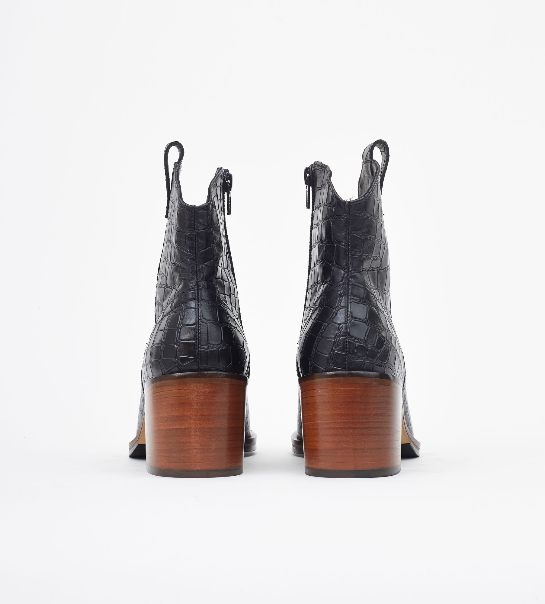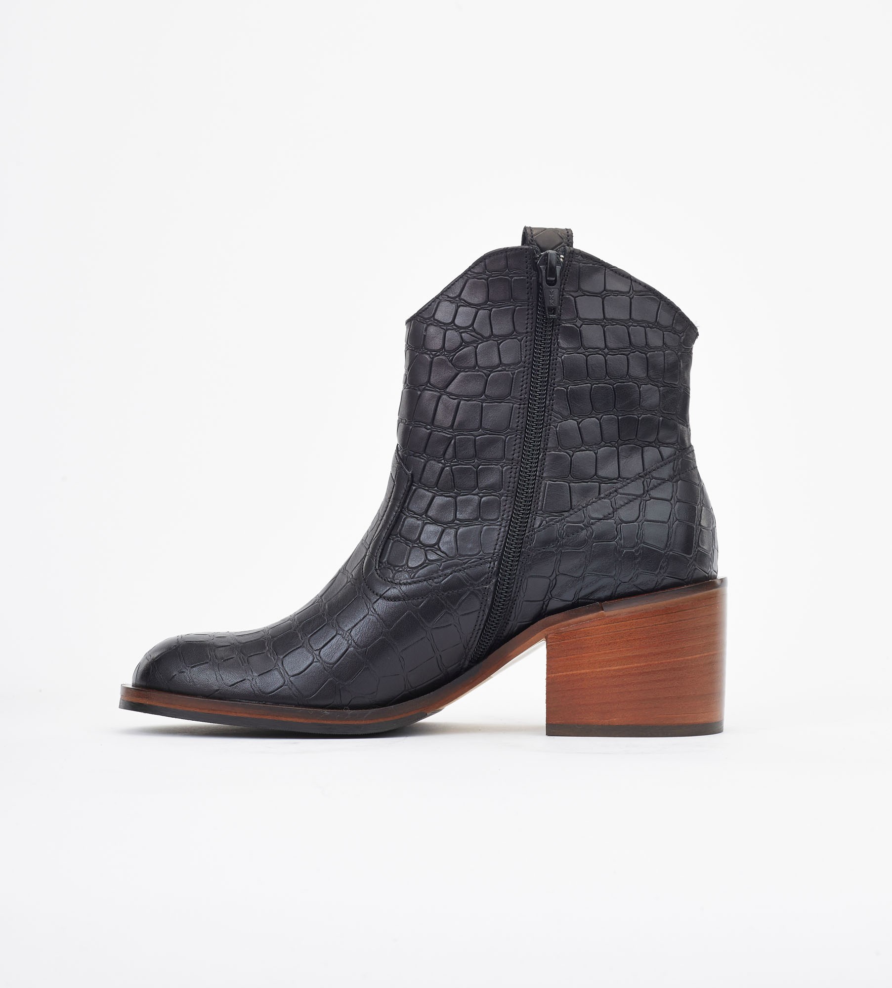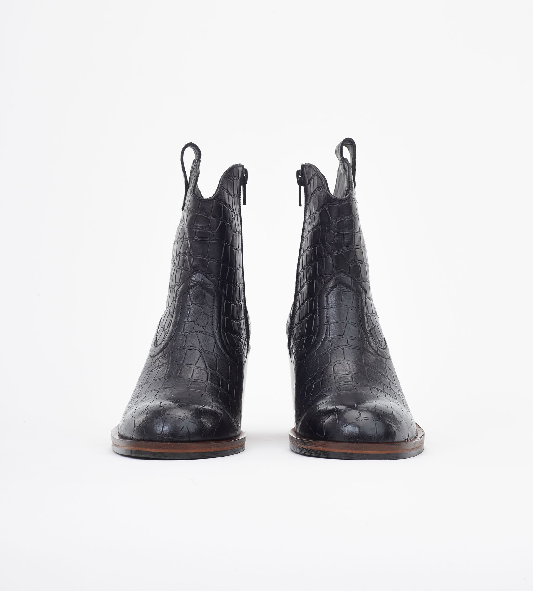 Botki w pięknym czarnym kolorze z kontrastowym obcasem w stylu kowbojskim ze skóry imitującej skórę krokodyla, detale nadają im stylowy i uniwersalny wygląd. Cholewka butów została wykonana z naturalnej cielęcej skóry, co zapewnia trwałość i estetyczny wygląd. Wnętrze butów wyściela naturalna skóra jagnięca oraz miękka skórzana wkładka, które razem tworzą komfortowy mikroklimat dla stóp, zapewniając przyjemne uczucie zarówno w chłodniejsze, jak i cieplejsze dni. Botki posiadają również suwak umieszczony po boku, co znacząco ułatwia ich zakładanie oraz zapewnia lepsze dopasowanie do stopy. Obcas butów ma wysokość 6 cm, co nadaje im elegancji oraz sprawia, że są one odpowiednie na różne okazje od codziennych do bardziej formalnych.