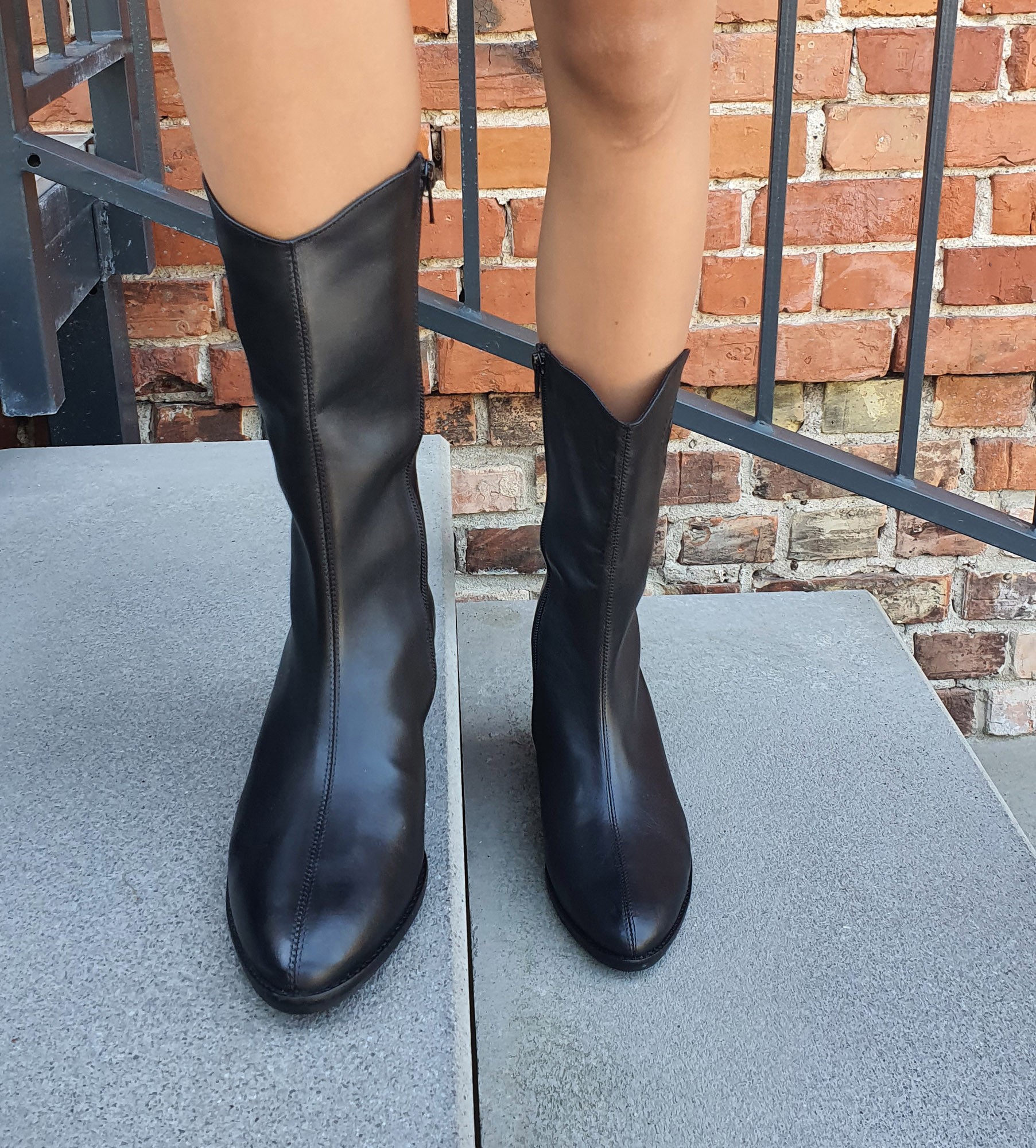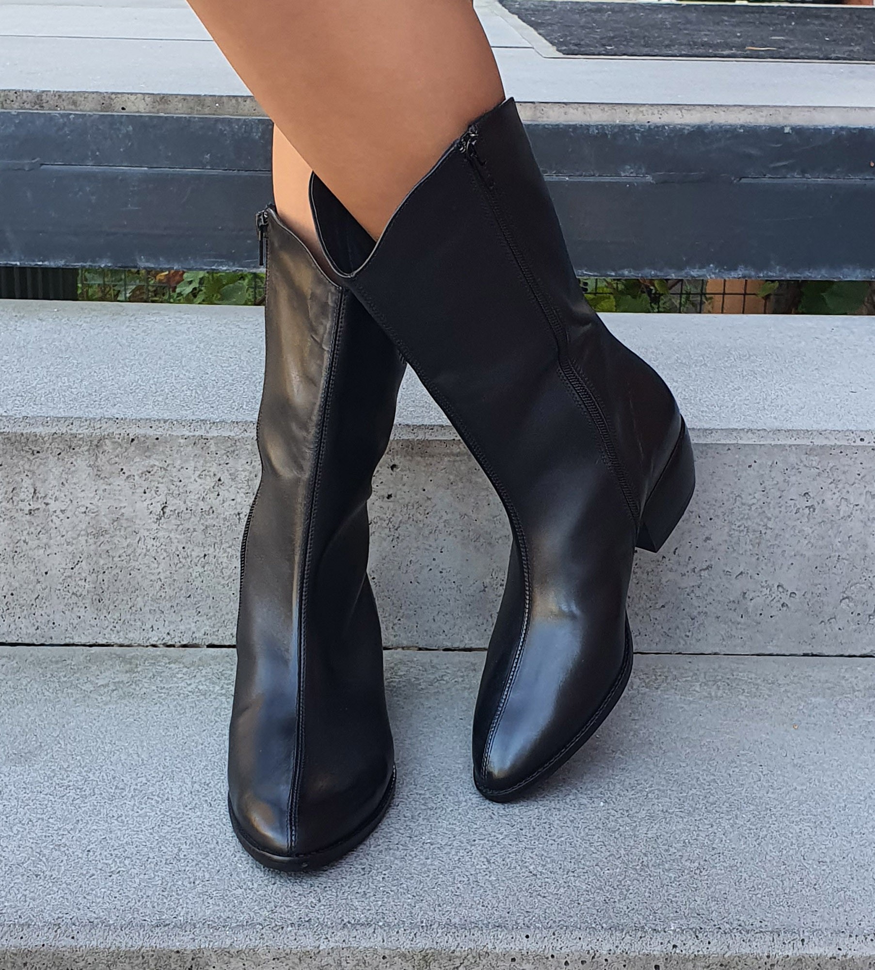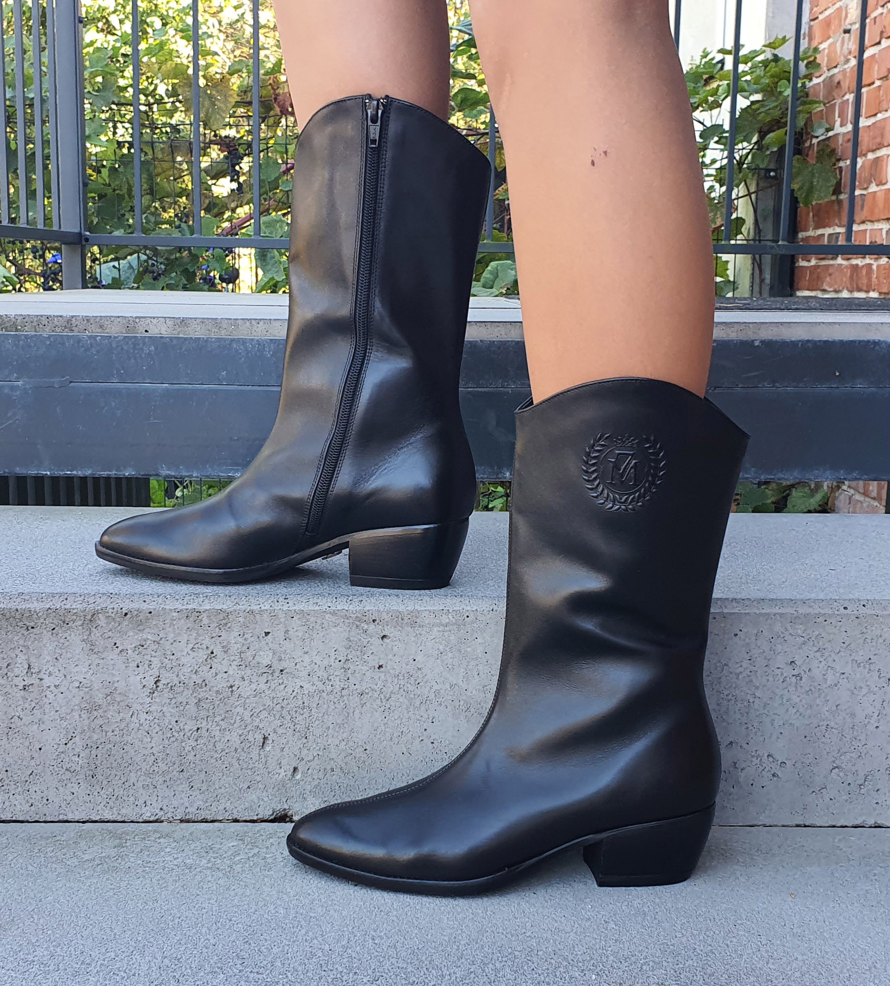 Wyjątkowe botki w stylu kowbojskim wykonane z wysokiej jakości naturalnej skóry cielęcej to połączenie elegancji, komfortu i wyrazistego charakteru. Wnętrze wyściełane miękką skórą jagnięcą otula stopę luksusowym ciepłem, zapewniając wygodę nawet podczas chłodnych, jesienno-zimowych dni.