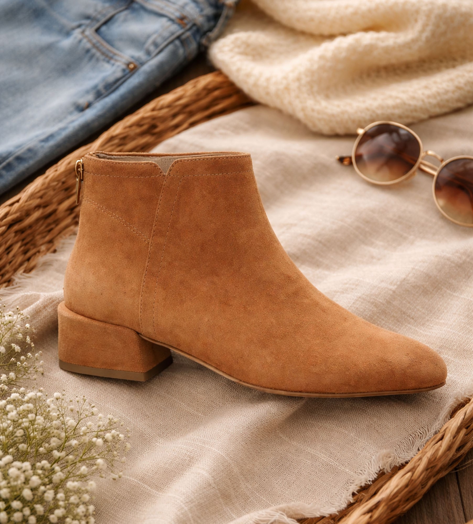 Delikatna, kobieca stylizacja na jesienne popołudnie w mieście. Zwiewna sukienka midi w kolorze złamanej bieli z drobnym, kwiatowym printem w odcieniach beżu i koniaku pięknie koresponduje z miękką fakturą zamszowych botków. Do tego długi, kaszmirowy kardigan w kolorze camelowym i torebka na ramię z plecioną fakturą w tonacji ciepłego brązu.