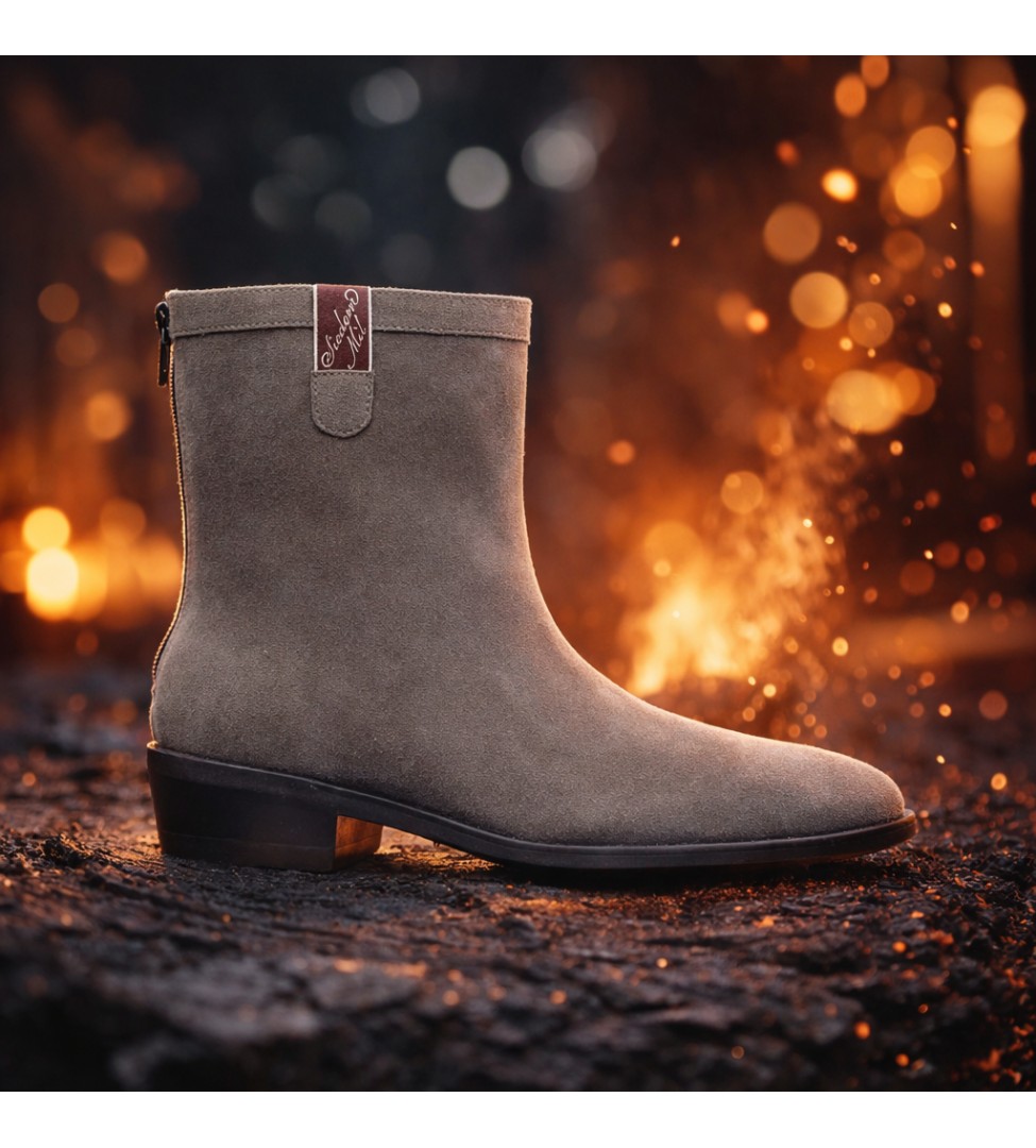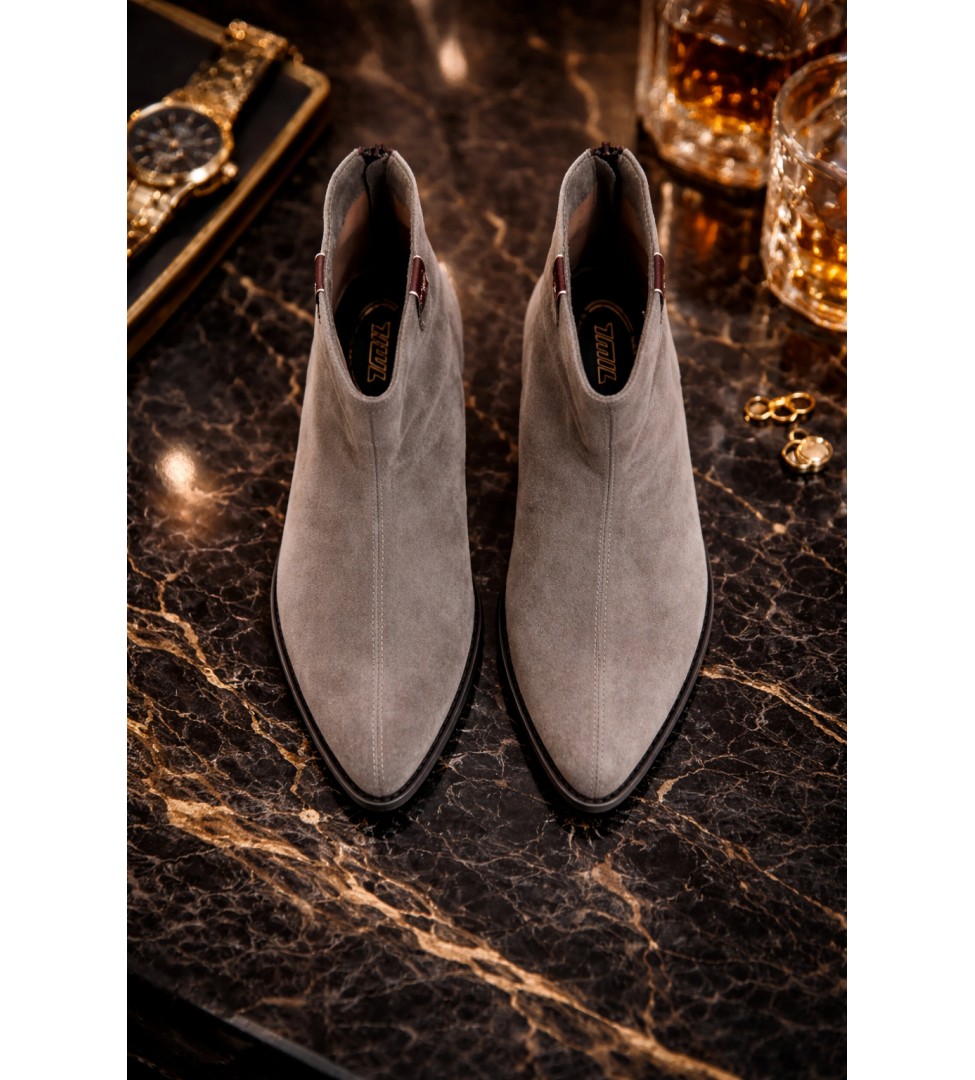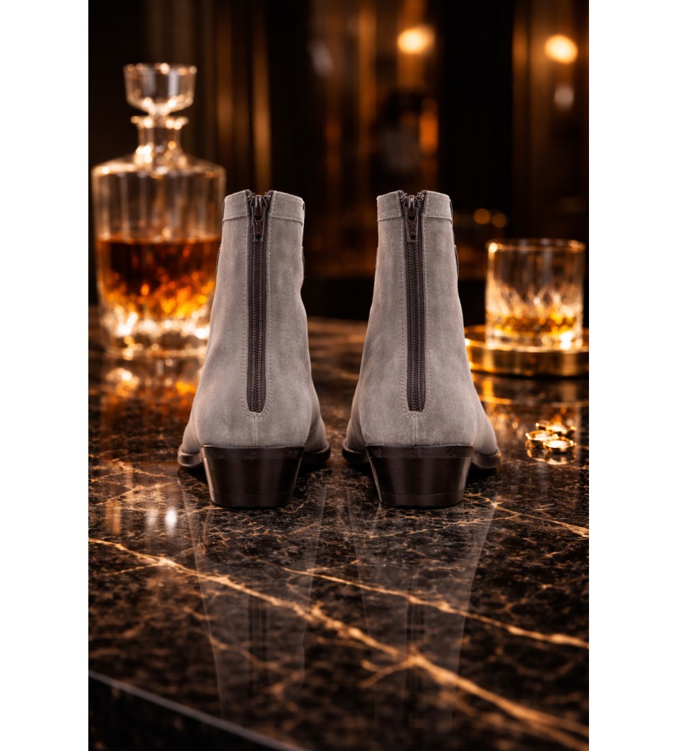 Szare botki damskie z zamszowej skóry naturalnej to kwintesencja kobiecego minimalizmu w nowoczesnym wydaniu. Model zachwyca subtelną linią i delikatnie zwężanym noskiem, a niski, stabilny obcas w stylu kowbojskim dodaje sylwetce lekkości i klasy. Wierzch wykonany ze skóry zamszowej pięknie układa się na nodze, podkreślając jego miękkość i elegancję. Wnętrze wyściełane jest luksusową skórą jagnięcą, która zapewnia wyjątkowy komfort noszenia i termiczną równowagę, nawet w chłodniejsze dni. Zamek z tyłu cholewki nie tylko podkreśla nowoczesny charakter butów, ale też ułatwia szybkie zakładanie.