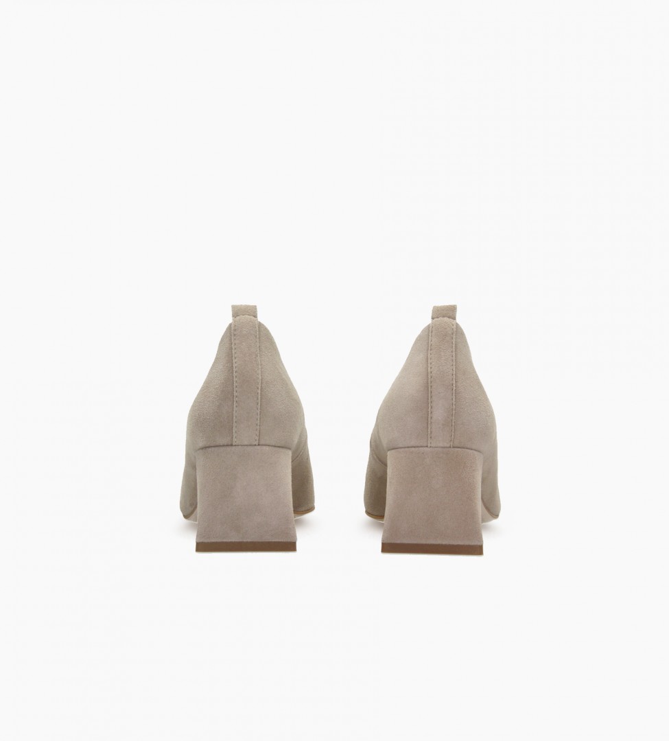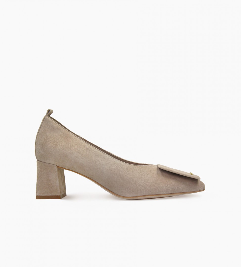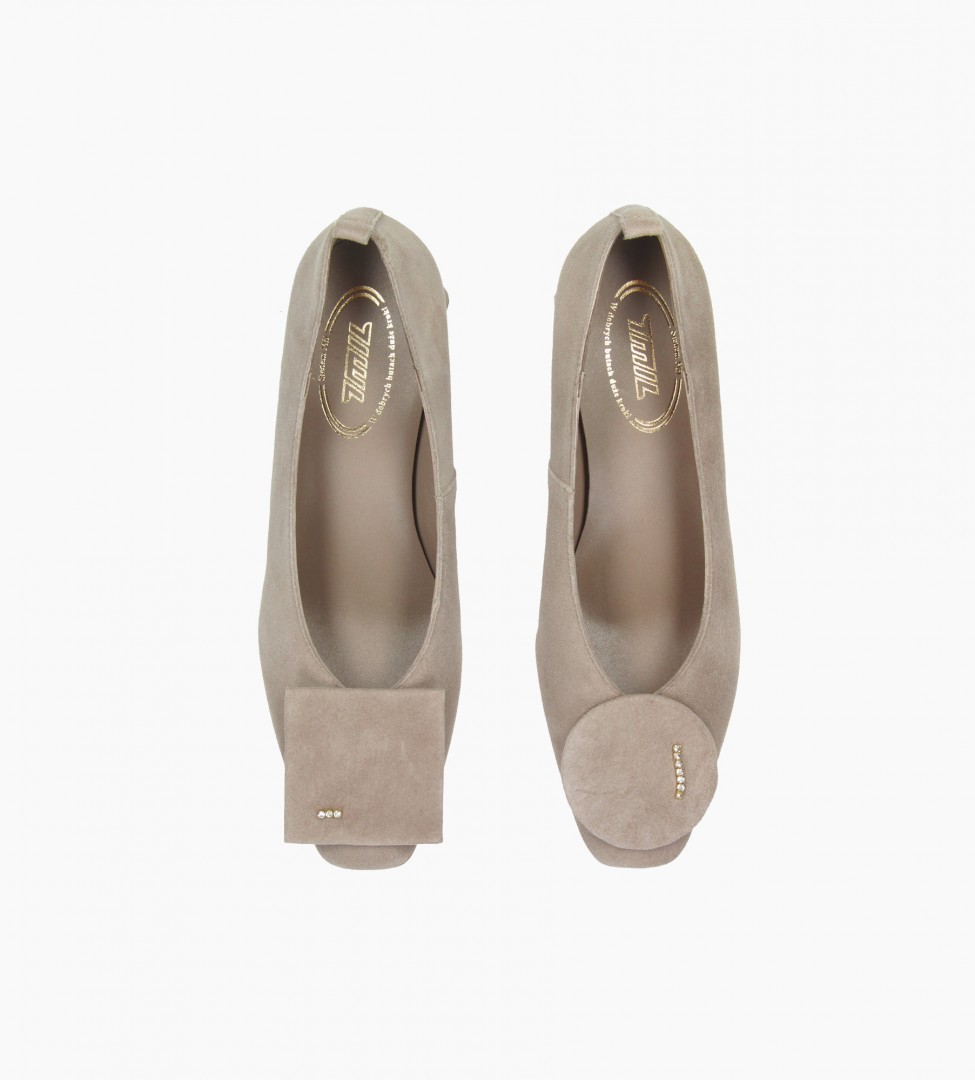 Czółenka to esencja klasycznej elegancji z nowoczesnym akcentem. Wykonane z miękkiej, naturalnej skóry zamszowej w odcieniu beżu, zachwycają smukłą linią i perfekcyjnym wykończeniem. Osadzone na niskim, stabilnym obcasie, zapewniają komfort noszenia przez cały dzień, nie rezygnując z kobiecego szyku. Charakterystycznym elementem modelu są ozdoby z miękkiego zamszu w kształcie koła i kwadratu, które umieszczono na nosku - geometryczne, nowoczesne i subtelnie biżuteryjne. Te detale wprowadzają nutę artyzmu i indywidualności, sprawiając, że buty stają się wyjątkowym akcentem każdej stylizacji.