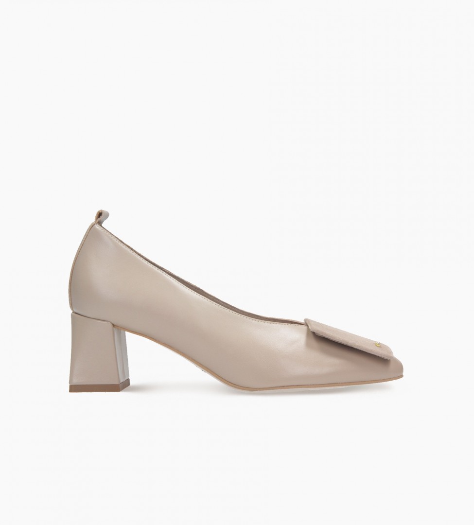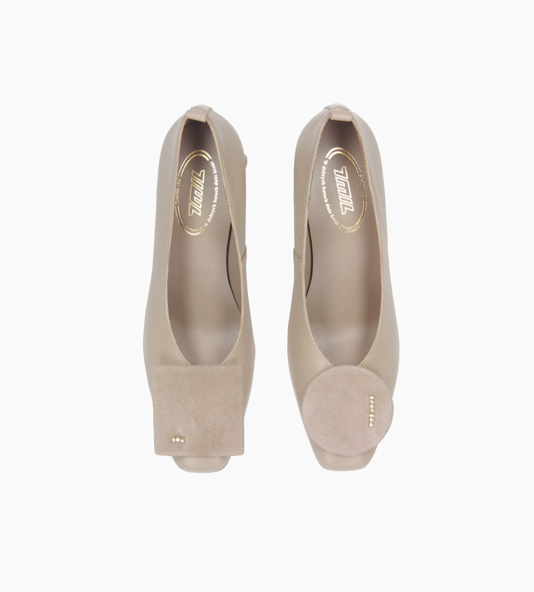 Czółenka to esencja klasycznej elegancji z nowoczesnym akcentem. Wykonane z miękkiej, naturalnej skóry cielęcej w głębokim odcieniu czekolady, zachwycają smukłą linią i perfekcyjnym wykończeniem. Osadzone na niskim, stabilnym obcasie, zapewniają komfort noszenia przez cały dzień, nie rezygnując z kobiecego szyku. Charakterystycznym elementem modelu są ozdoby z miękkiego zamszu w kształcie koła i kwadratu, które umieszczono na nosku - geometryczne, nowoczesne i subtelnie biżuteryjne. Te detale wprowadzają nutę artyzmu i indywidualności, sprawiając, że buty stają się wyjątkowym akcentem każdej stylizacji.