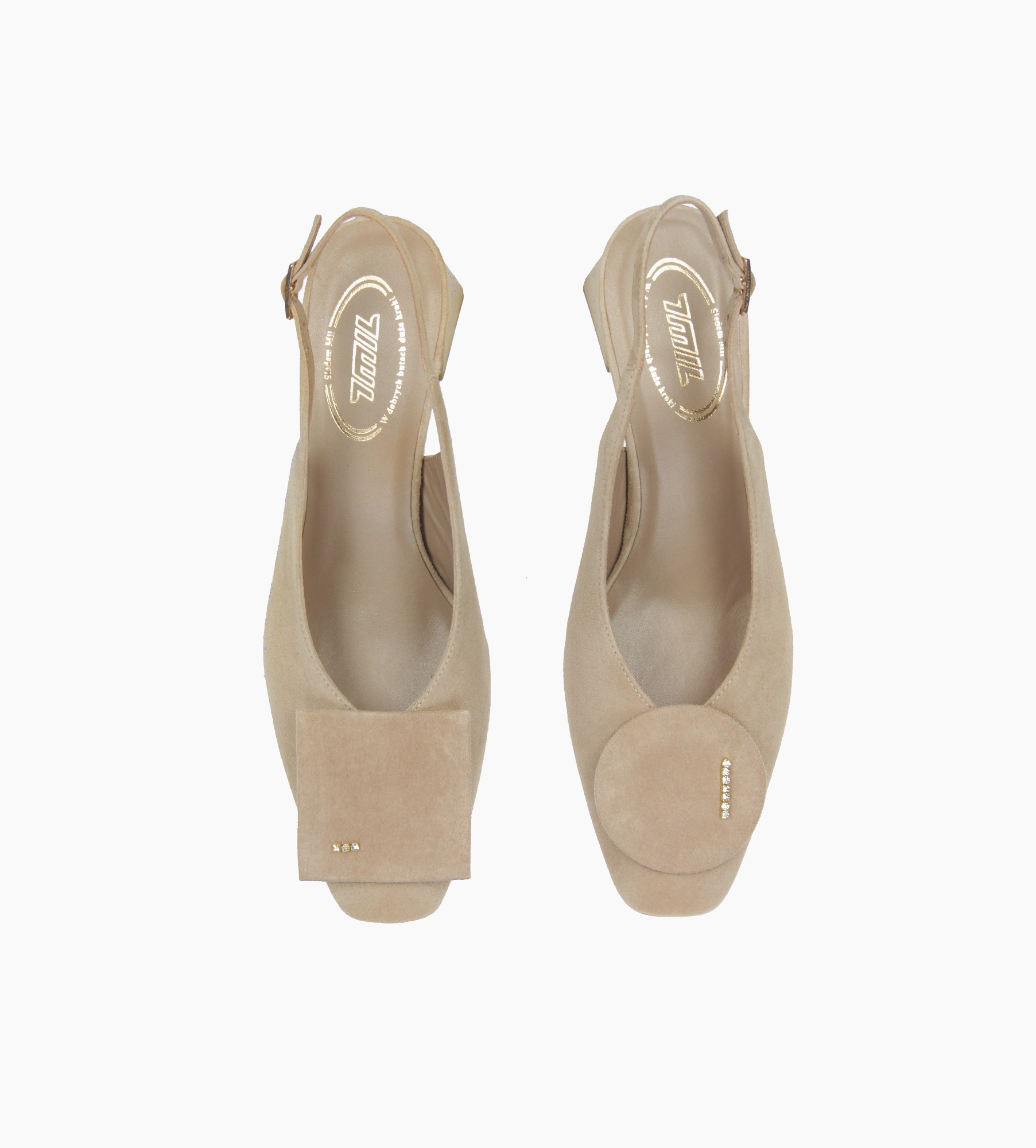 Te wyjątkowe beżowe czółenka damskie to połączenie nowoczesnej formy i subtelnej elegancji. Wykonane z miękkiej, naturalnej skóry zamszowej, urzekają swoją prostotą i klasą. Ich wnętrze wyściełane jest luksusową jagnięcą skórą, co gwarantuje maksymalny komfort nawet podczas wielogodzinnego użytkowania. Modny, stabilny obcas o średniej wysokości sprawia, że czółenka są idealnym wyborem zarówno do pracy, jak i na specjalne okazje. Charakterystycznym elementem tego modelu są geometryczne, duże ozdoby na czubku – w dwóch kształtach: kwadratu i koła – które nadają całości artystycznego, niebanalnego wyrazu.
