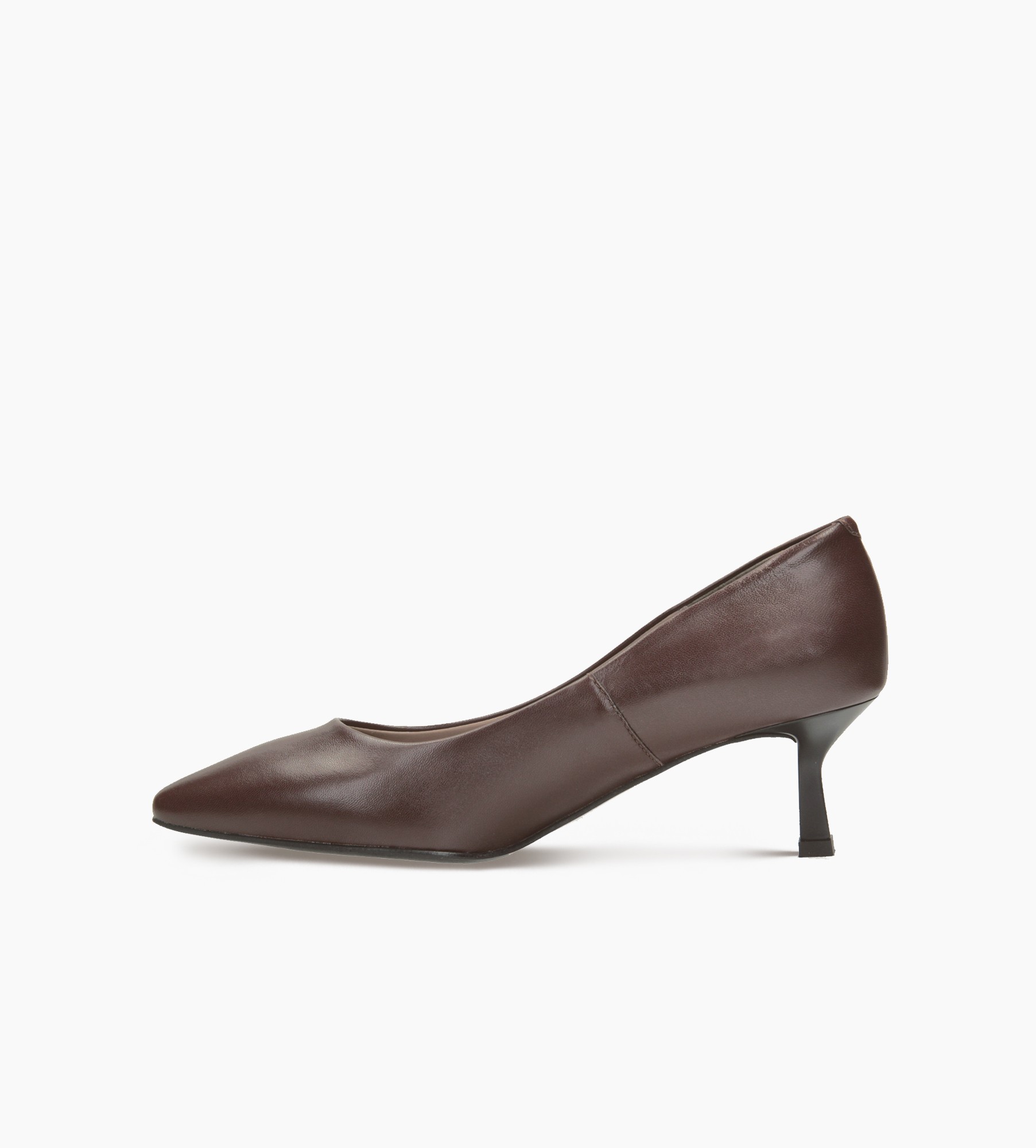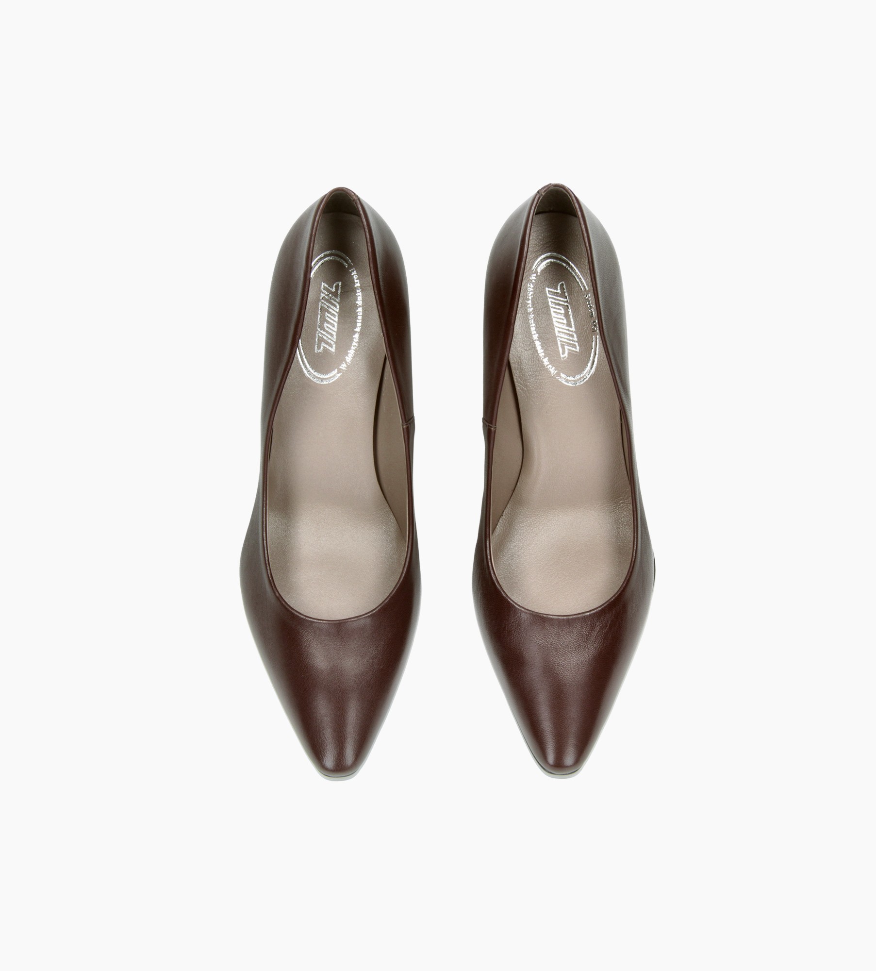 Klasyczne i niezwykle szykowne czółenka damskie w pięknym, głębokim odcieniu czekoladowego brązu. Wykonane z wysokiej jakości skóry, wyróżniają się subtelnym połyskiem i perfekcyjnym wyprofilowaniem. Model osadzony jest na niskiej, modnej szpilce, która zapewnia elegancki wygląd i jednocześnie wygodę nawet podczas całodziennego noszenia. Smukły nosek i minimalistyczny fason nadają im ponadczasowy charakter, który doskonale uzupełni zarówno formalne, jak i wieczorowe stylizacje.