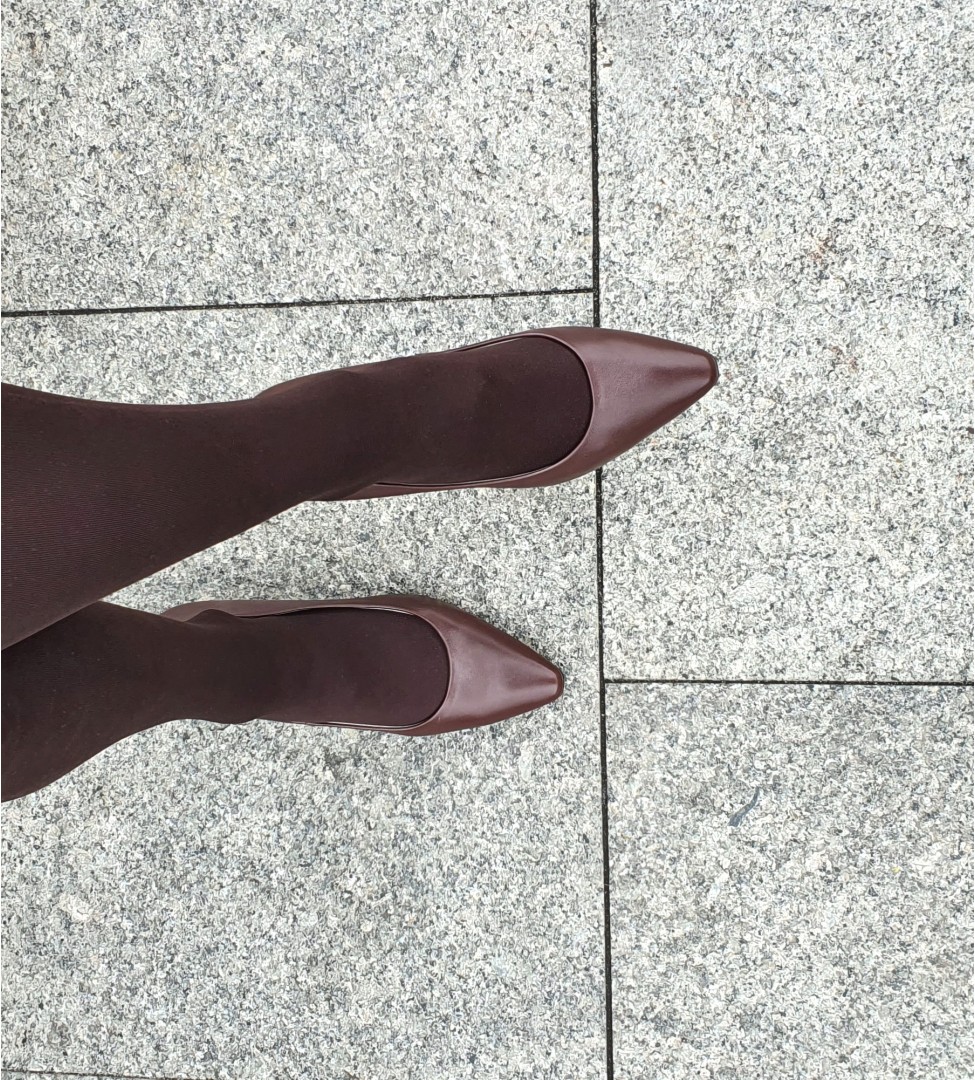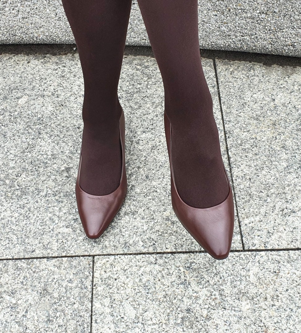 Czekoladowe czółenka zestaw z sukienką midi z długim rękawem w kolorze burgundu lub głębokiej zieleni, wykonaną z miękkiej dzianiny lub jedwabiu. Do tego cienki pasek w talii w kolorze ciemnego brązu oraz długi, wełniany płaszcz w odcieniu ciemnej czekolady. Stylizację uzupełnij kopertówką w kolorze złamanej bieli i klasyczną biżuterią — np. perłowym naszyjnikiem lub kolczykami. Idealna na kolację, do teatru lub na eleganckie przyjęcie.