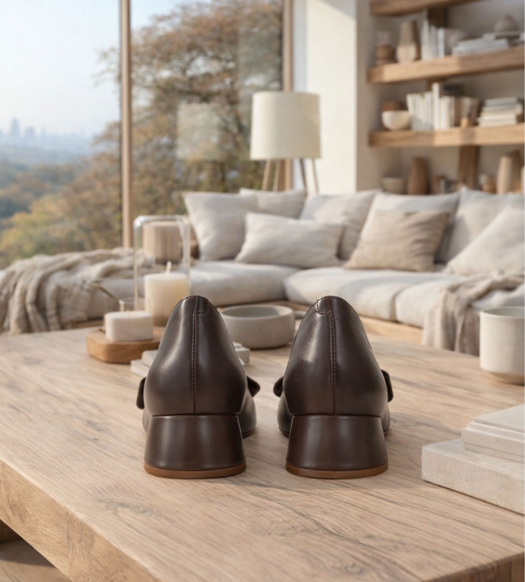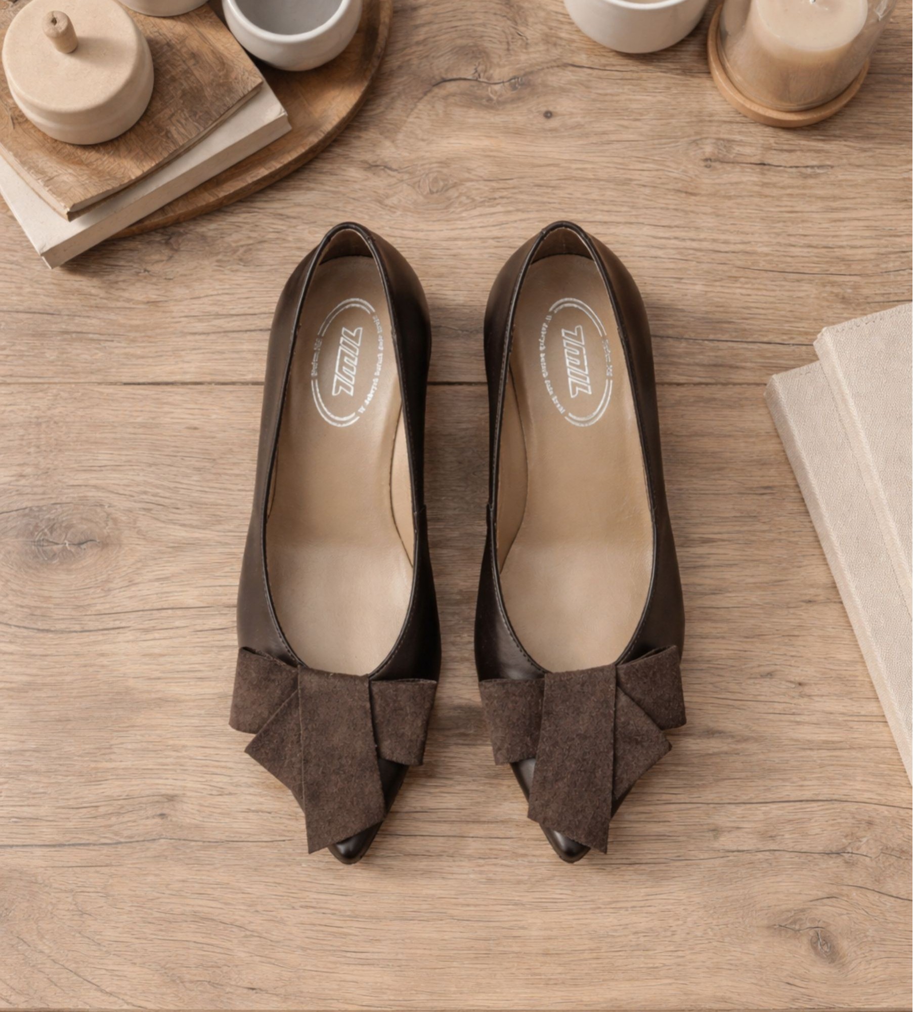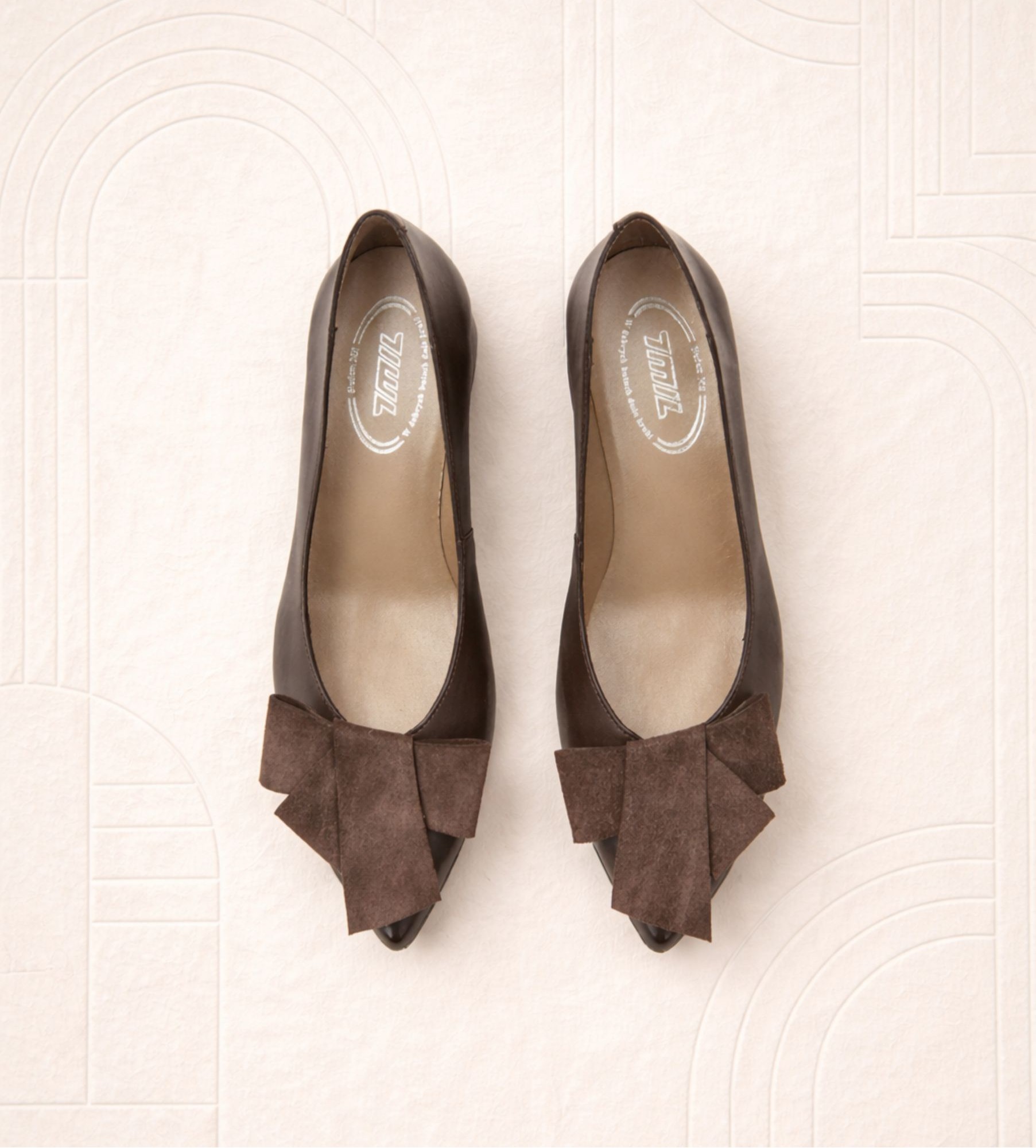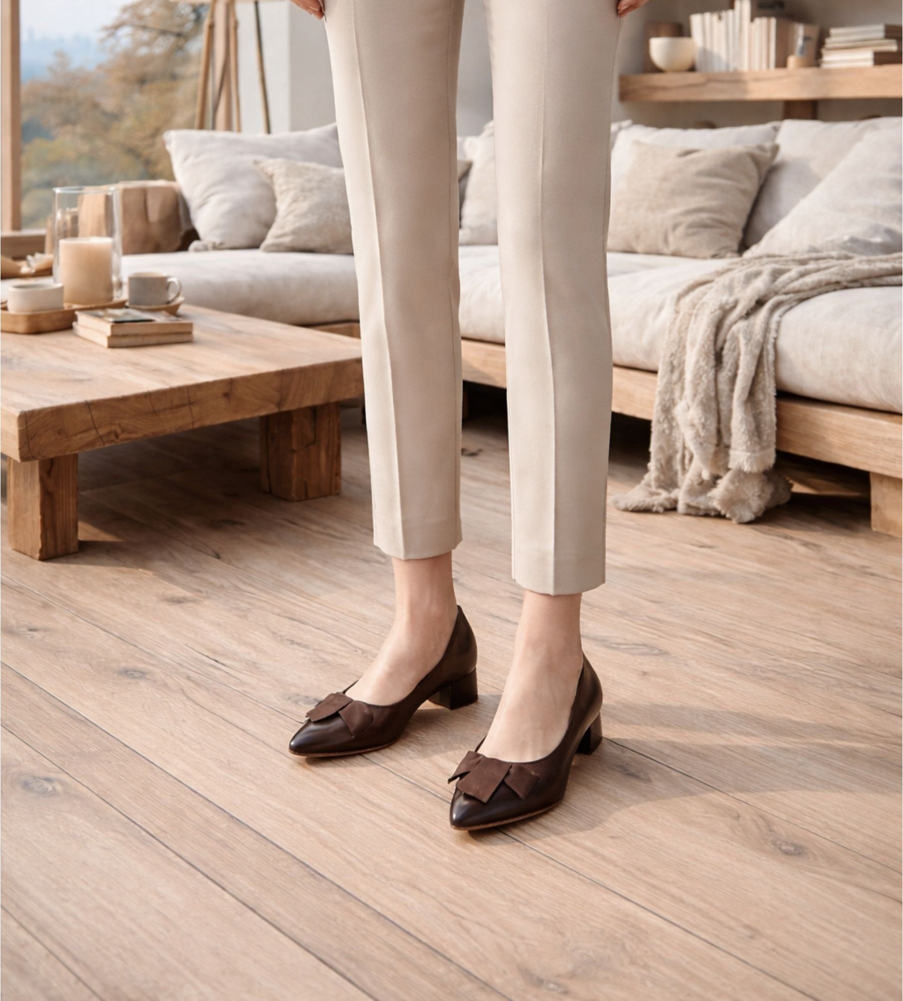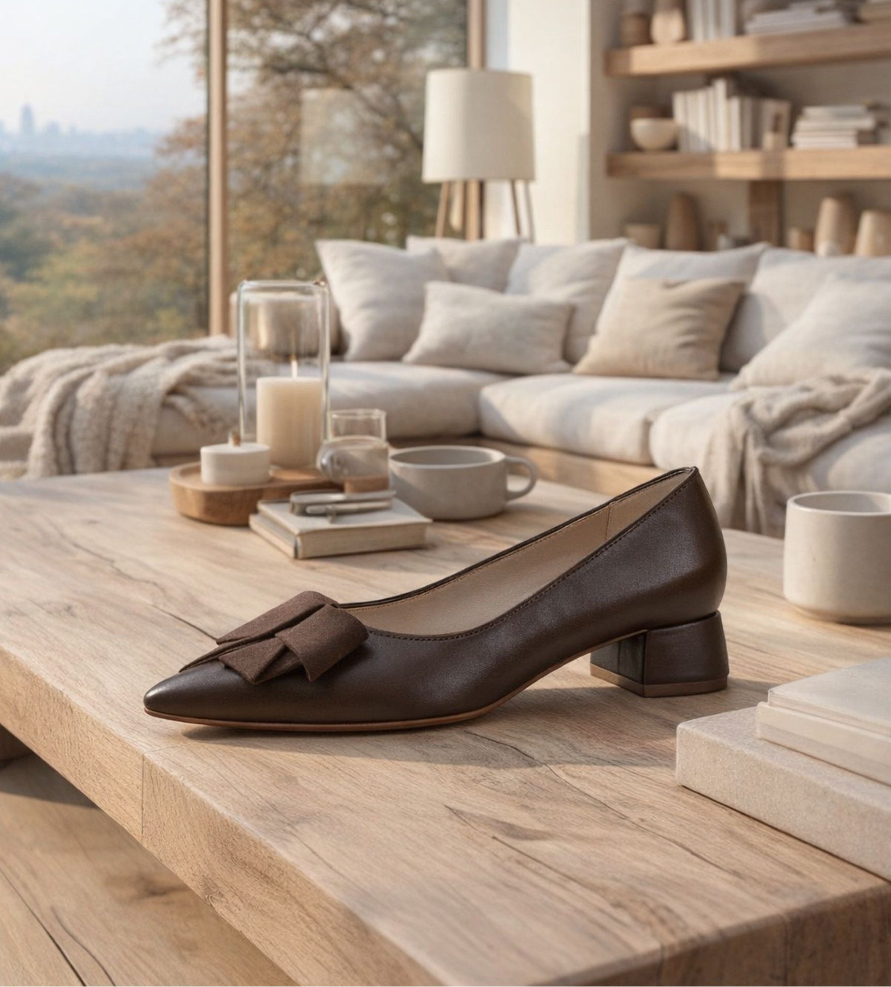 Wyjątkowe czółenka to połączenie ponadczasowej klasyki z subtelną nowoczesnością. Wykonane z gładkiej, naturalnej skóry cielęcej w czekoladowym odcieniu, wyróżniają się zamszową kokardą o geometrycznym fasonie, która przyciąga wzrok i nadaje butom unikalnego charakteru. Wnętrze wykończone delikatną skórą jagnięcą otula stopę miękkością i zapewnia wysoki komfort noszenia przez cały dzień. Smukły kształt noska optycznie wysmukla sylwetkę, a niski, stabilny obcas sprawia, że model ten idealnie sprawdzi się zarówno na co dzień, jak i podczas bardziej formalnych okazji.