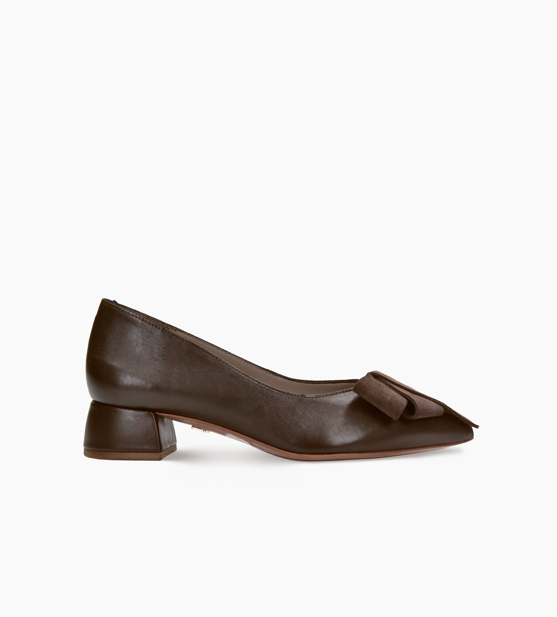 Wyjątkowe czółenka to połączenie ponadczasowej klasyki z subtelną nowoczesnością. Wykonane z gładkiej, naturalnej skóry cielęcej w czekoladowym odcieniu, wyróżniają się zamszową kokardą o geometrycznym fasonie, która przyciąga wzrok i nadaje butom unikalnego charakteru. Wnętrze wykończone delikatną skórą jagnięcą otula stopę miękkością i zapewnia wysoki komfort noszenia przez cały dzień. Smukły kształt noska optycznie wysmukla sylwetkę, a niski, stabilny obcas sprawia, że model ten idealnie sprawdzi się zarówno na co dzień, jak i podczas bardziej formalnych okazji.